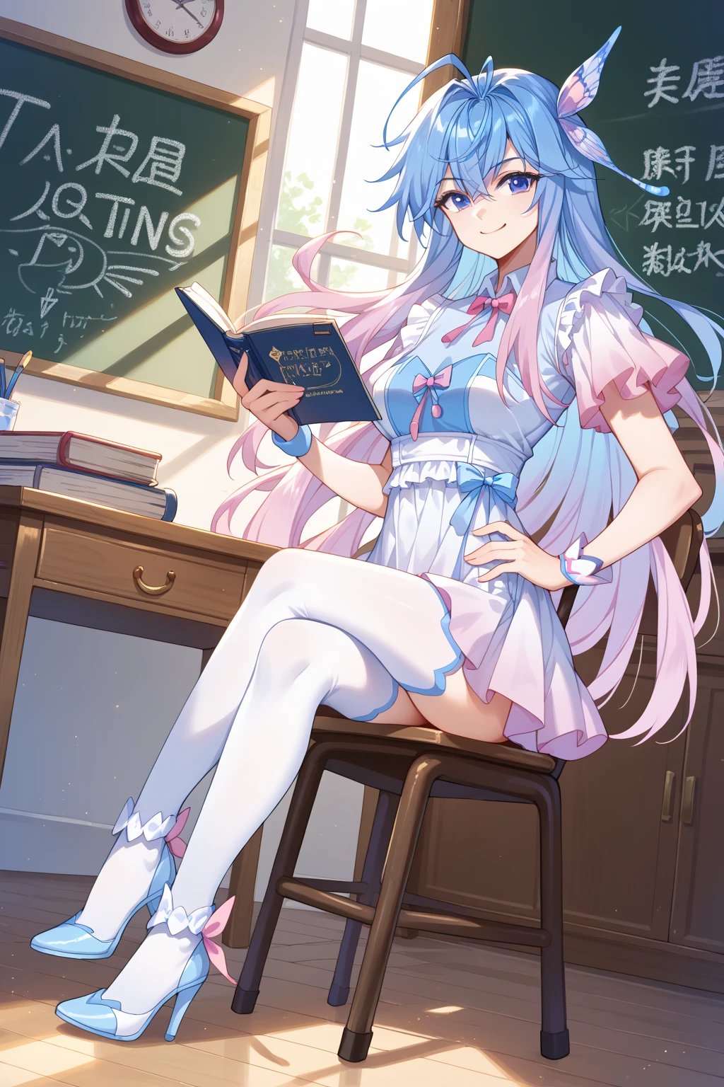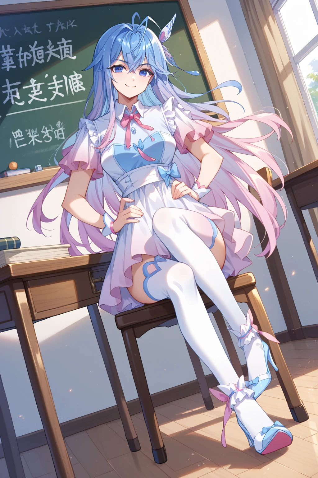 wangdonger,long hair, hair ornament, skirt, white thighhighs, short sleeves, ahoge, blue hair, blue high heels, full body, multicolored hair, pink hair, wristband, jewelry, ribbon