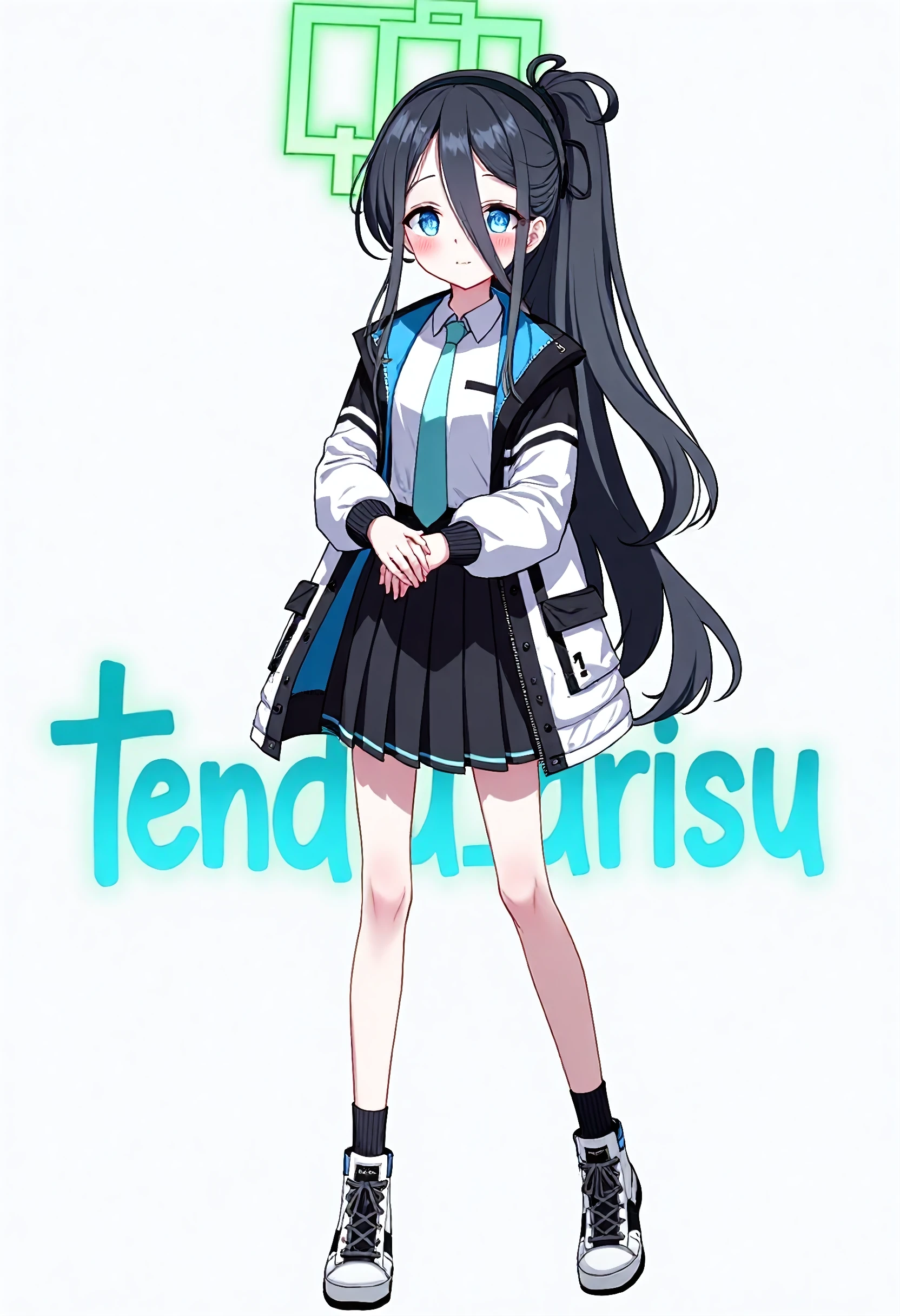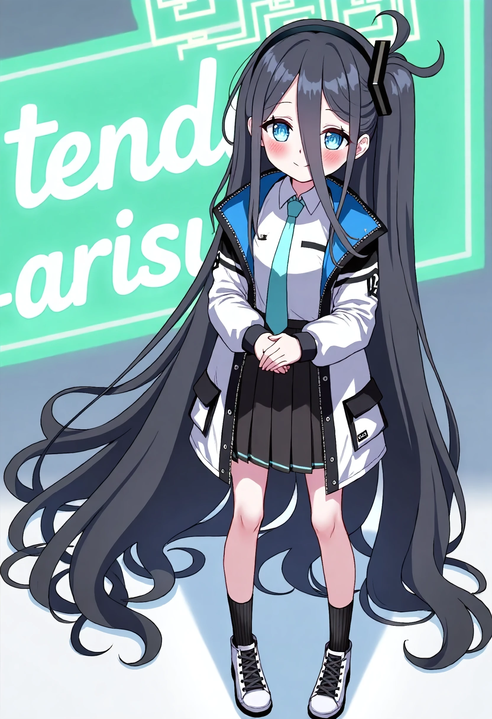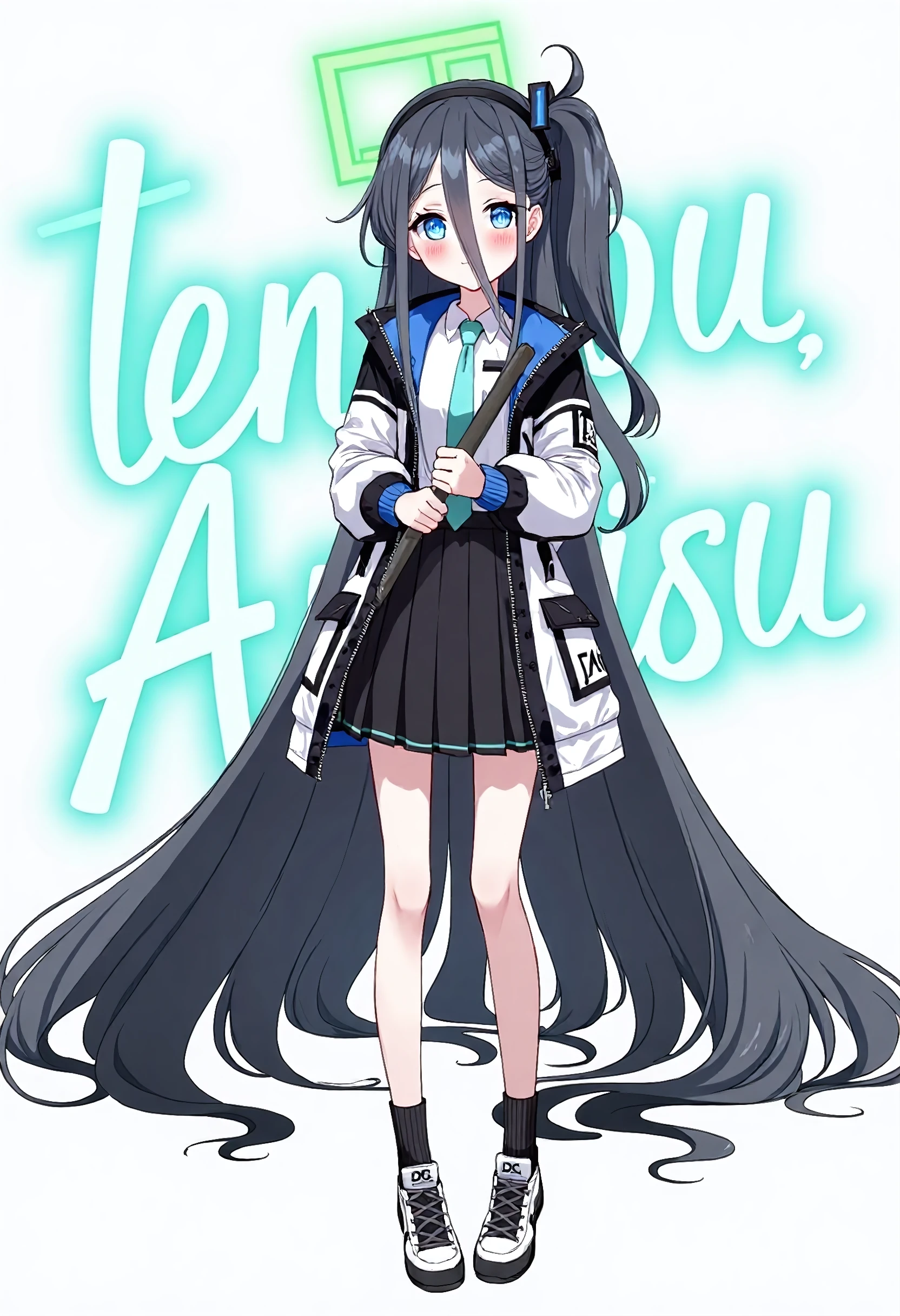 This is an anime-style illustration of a young female character with extremely long, dark gray hair that fades into a lighter shade at the floor. She has bright blue eyes and wears a school uniform consisting of a white blouse, a black pleated skirt with blue trim, a teal tie, and a black-and-white jacket with futuristic elements. She also wears dark socks and high-top sneakers.