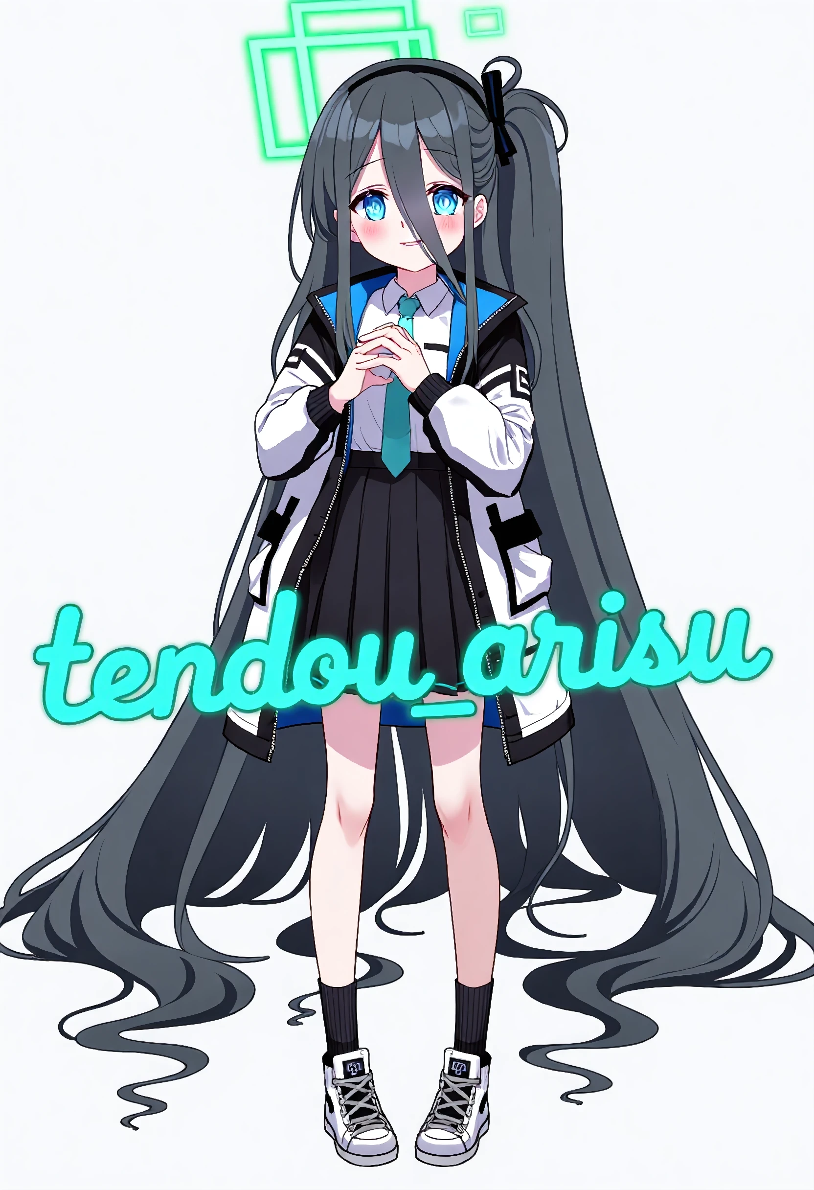 there is a huge glowing light blue handwritten text In front of her that says "tendou_arisu", blending seamlessly with the magical and ethereal theme of the image.
