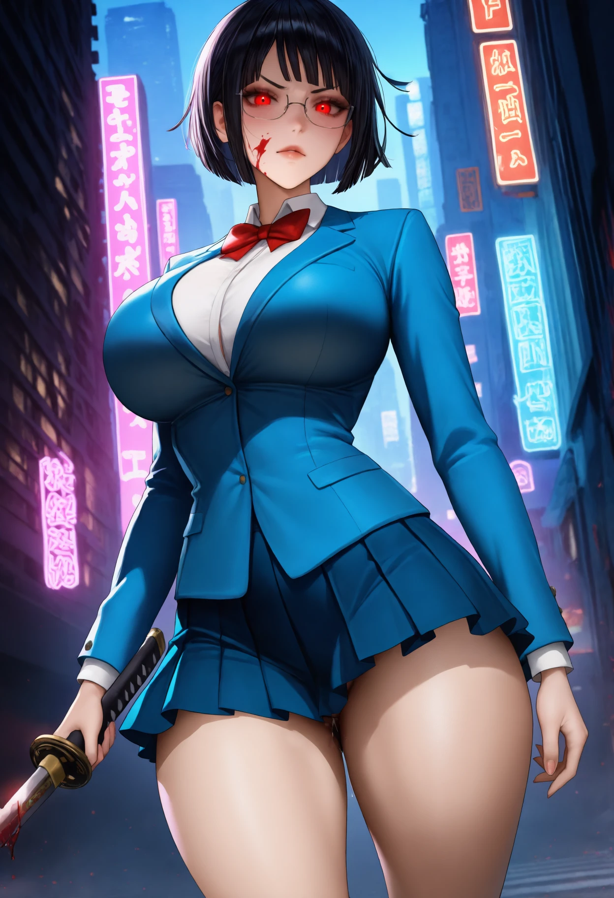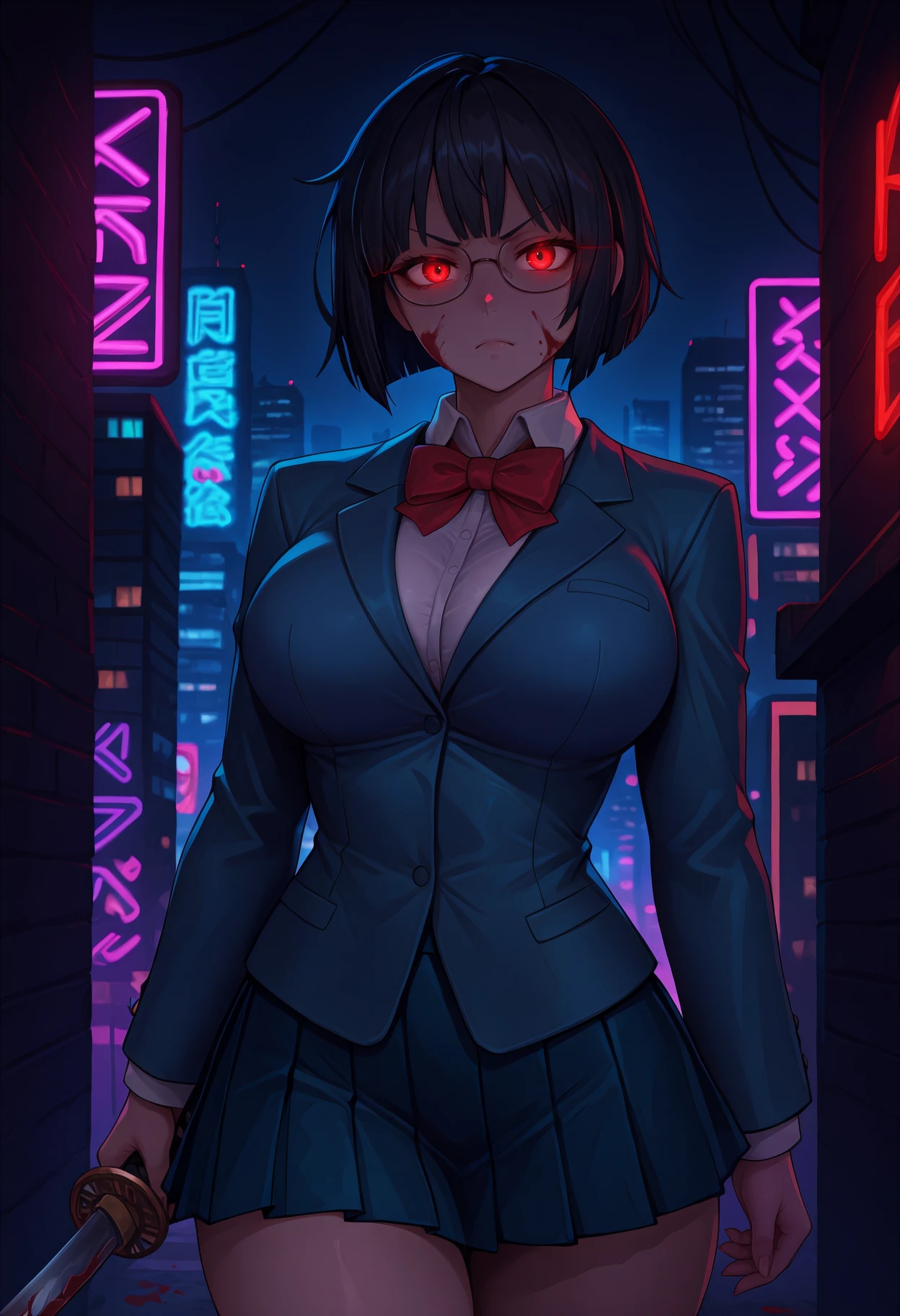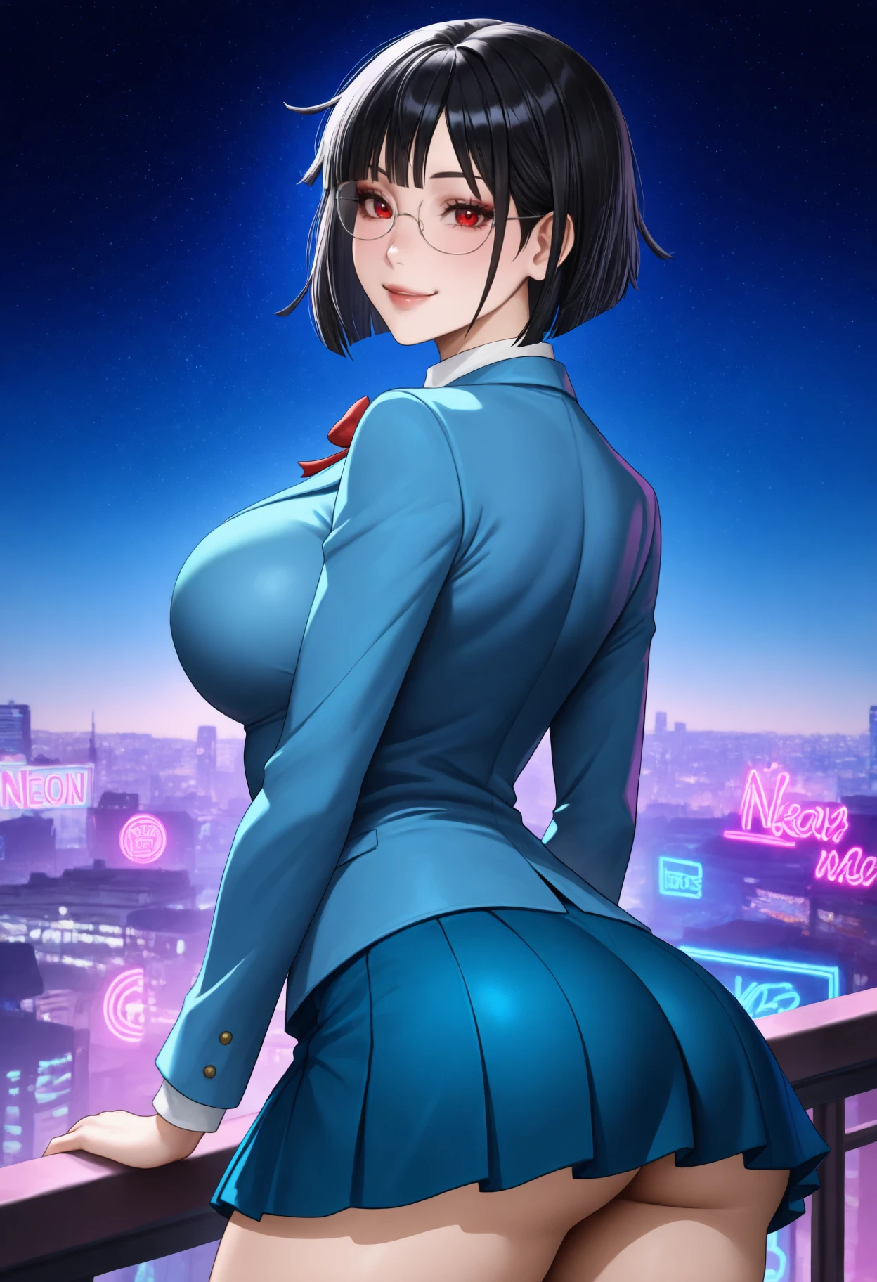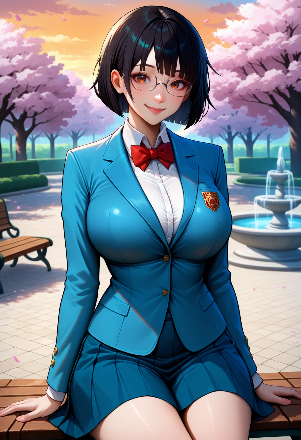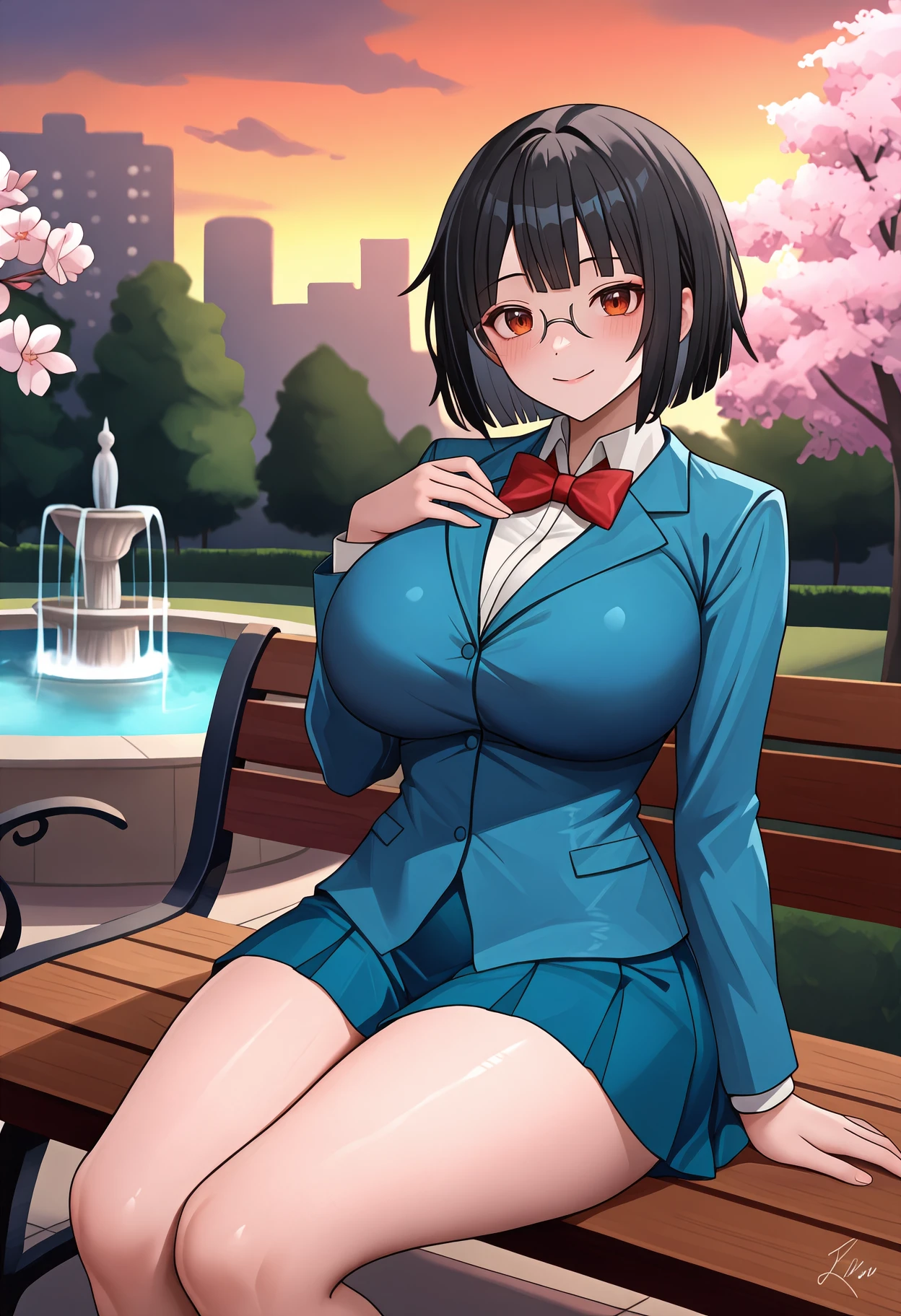 Main Prompt: curvy, short hair, black hair, bob cut, large breasts, slim waist, glasses, brown eyes,
