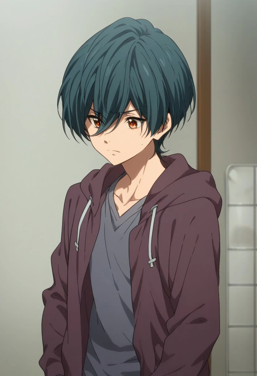 ikustart, 1boy, male focus, solo, hood, brown eyes, hair between eyes, shirt, short hair, grey shirt, hoodie, purple hoodie, open hoodie, aqua hair,