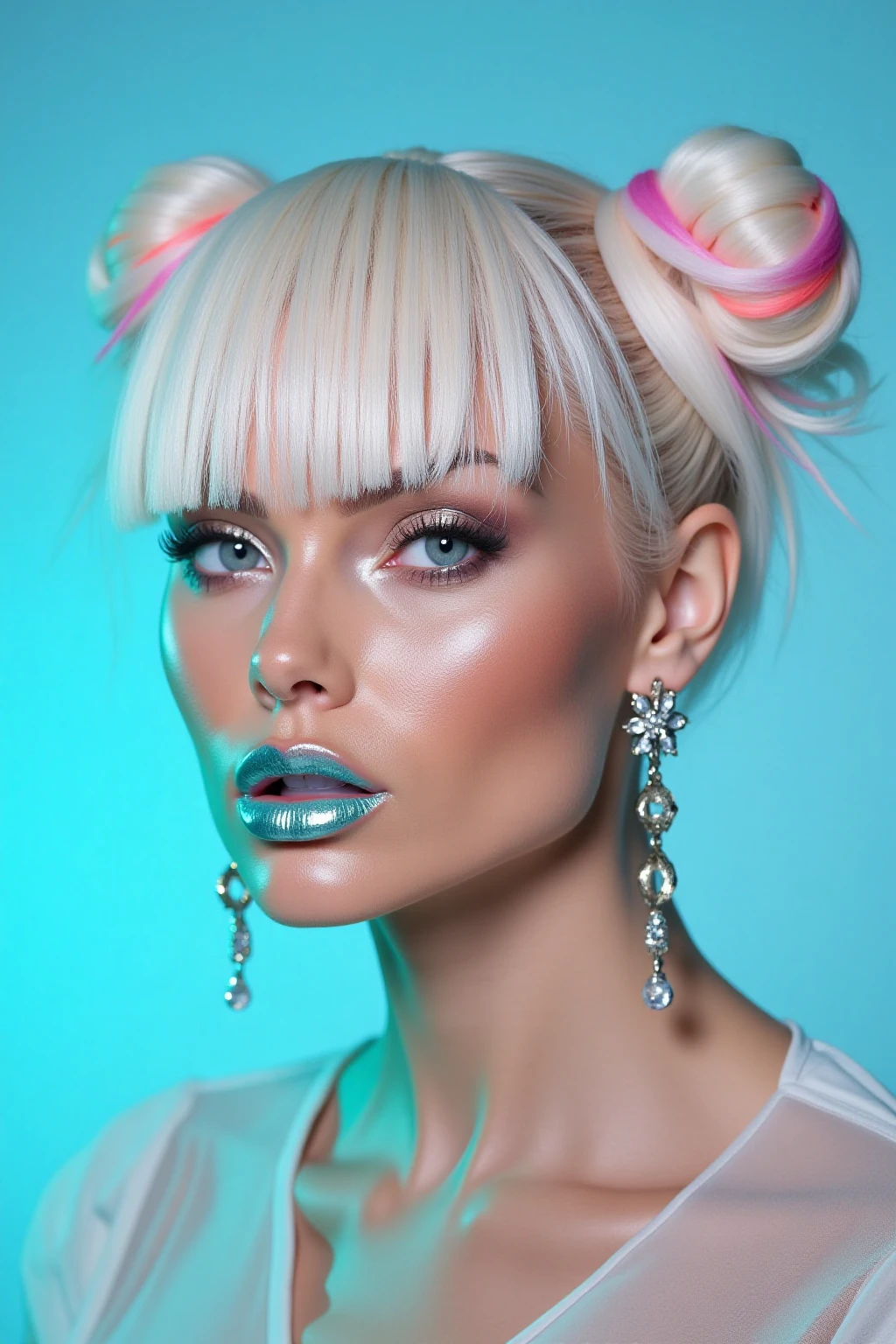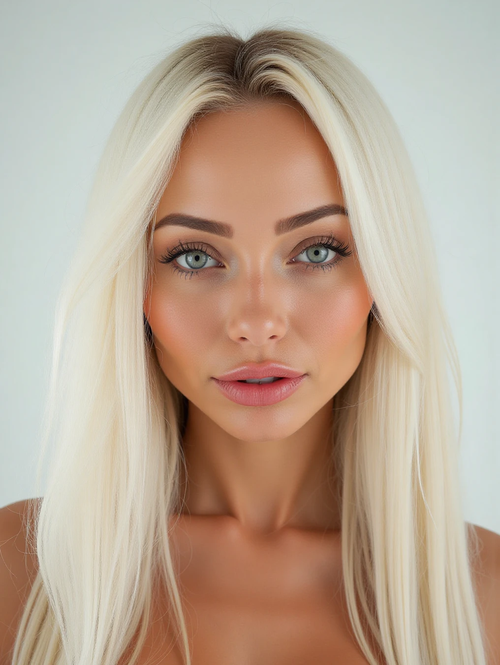 Hair: Long, flowing, platinum-blonde hair with soft waves or sleek straight styles, often parted down the middle or styled to accentuate her glamorous aesthetic.