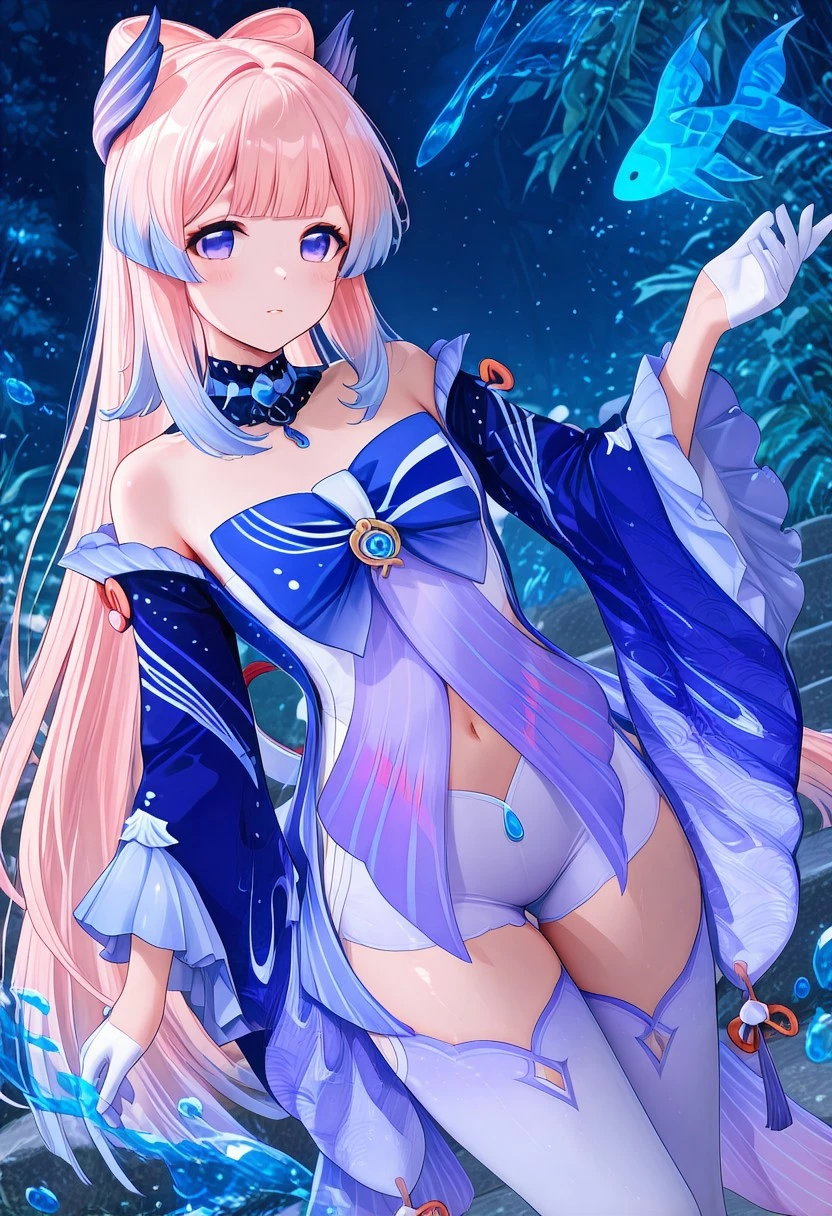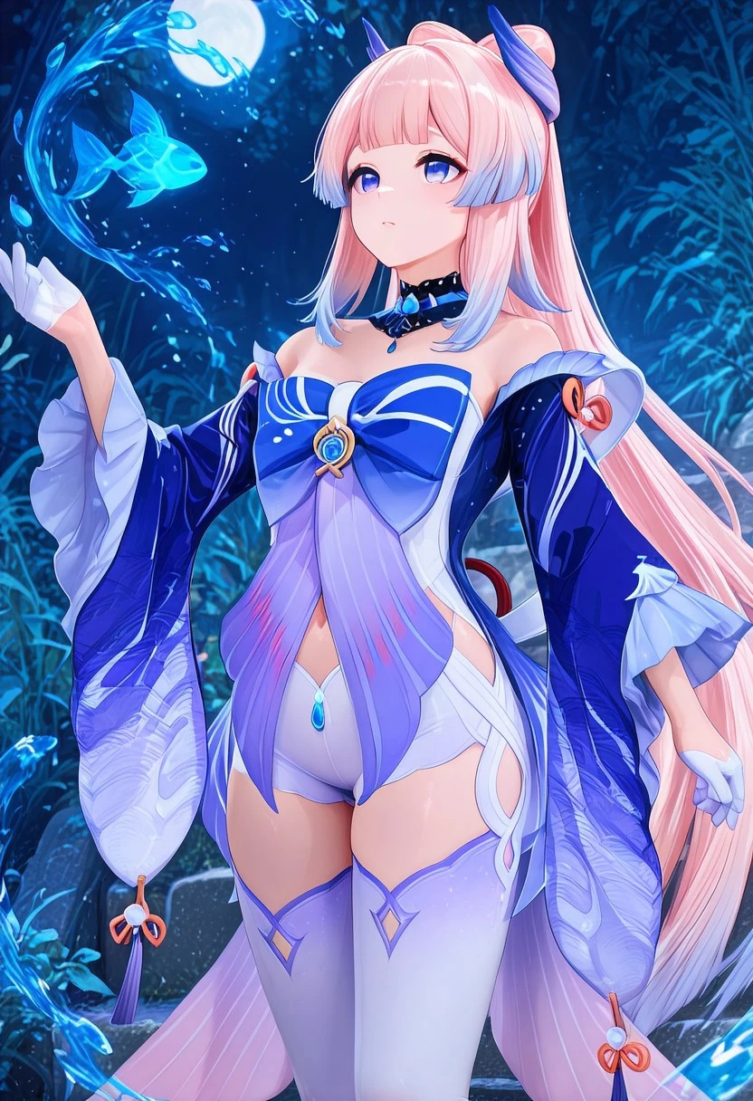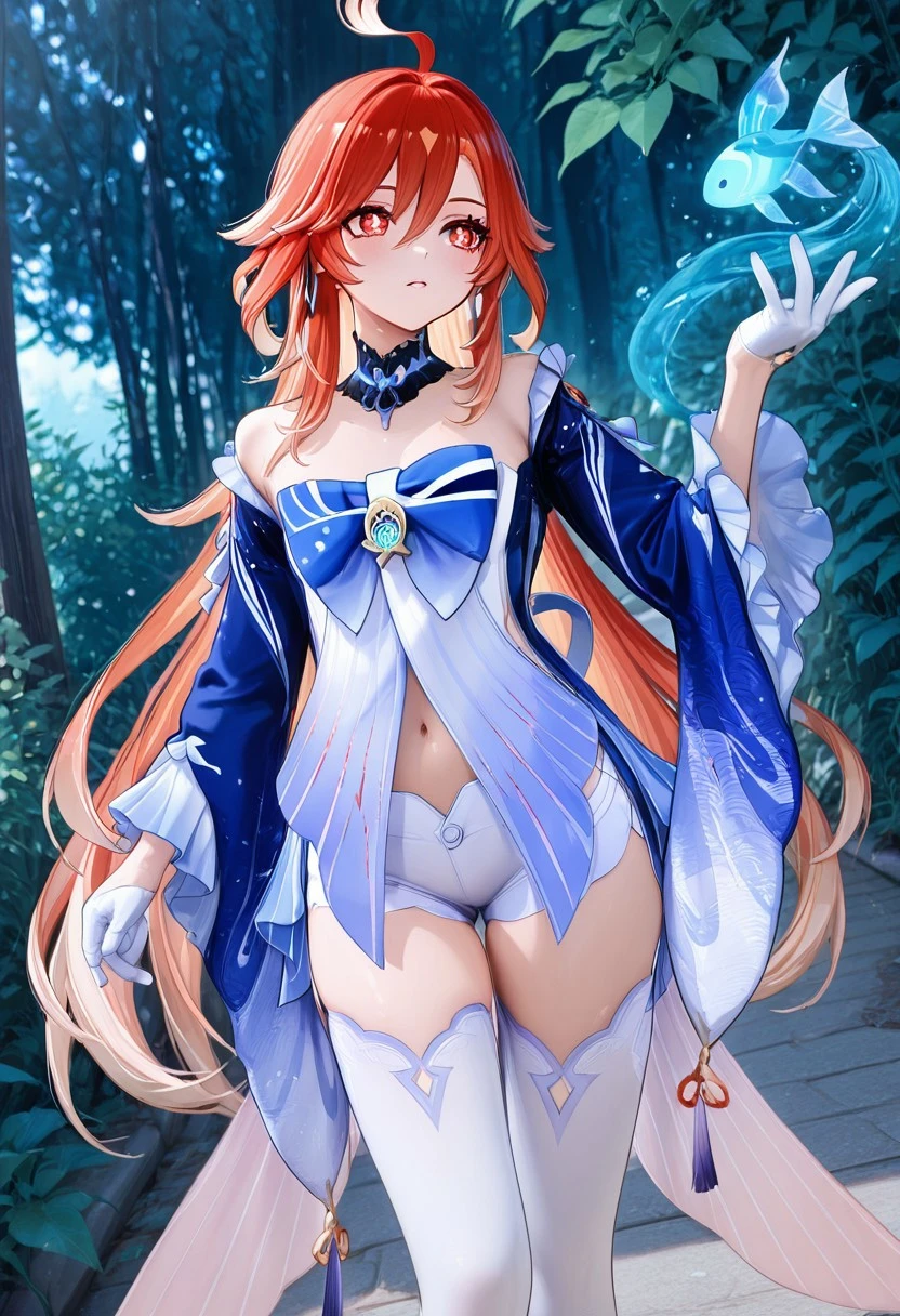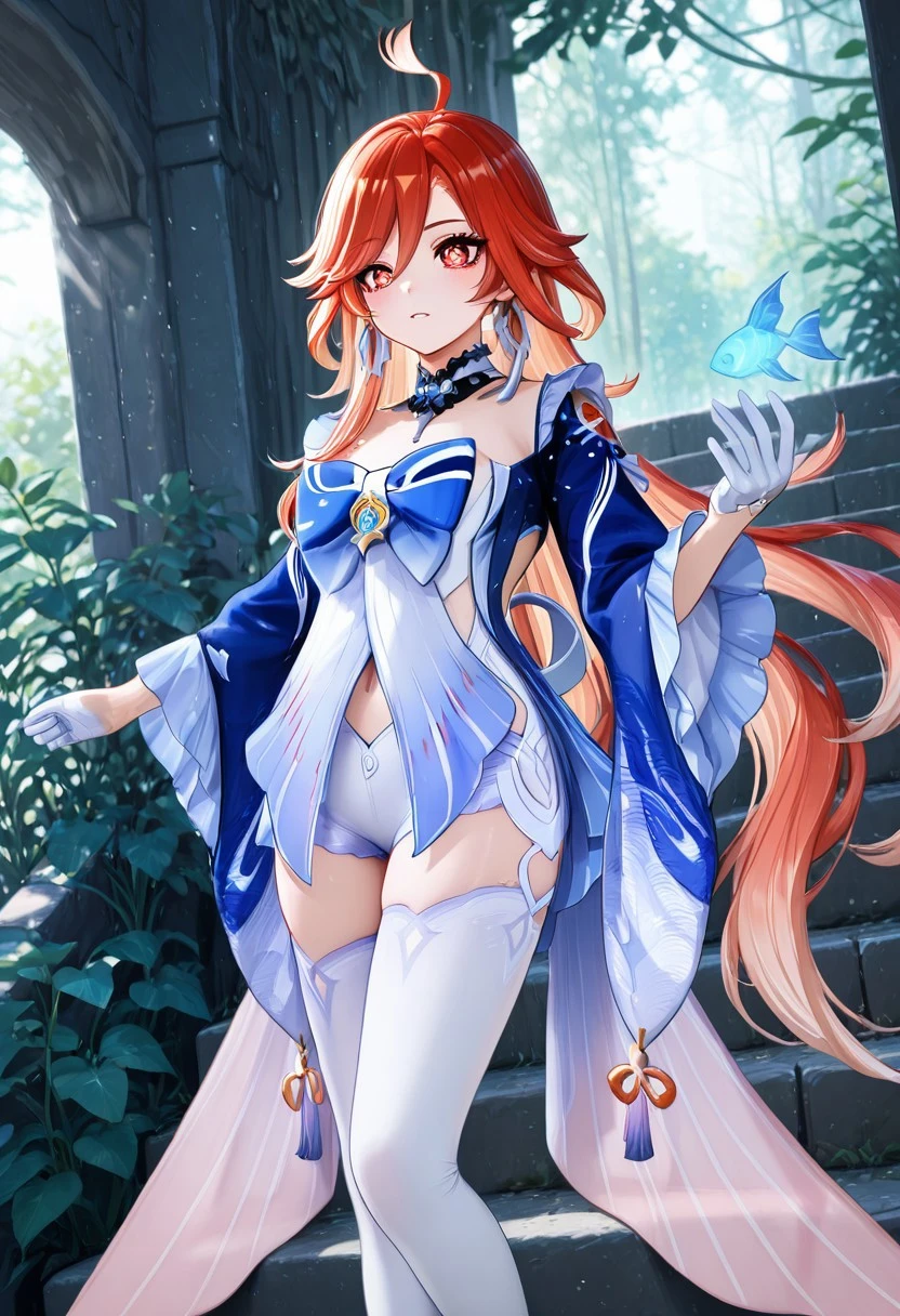 Kkmiclsty, white thighhighs,thighhighs, gloves, long sleeves, bow, frills, detached sleeves,bowtie,white shorts,vision \(genshin impact\), white gloves, wide sleeves