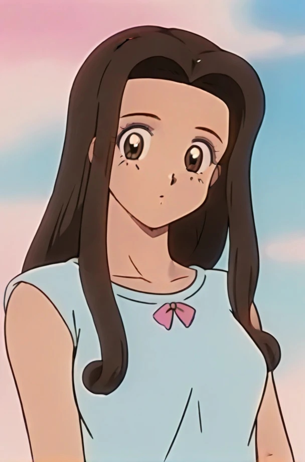 anime coloring, <lora:Omori - Aka-chan to Boku 1.3:0.8> forehead, 1girl, long hair brown hair, brown eyes, retro artstyle