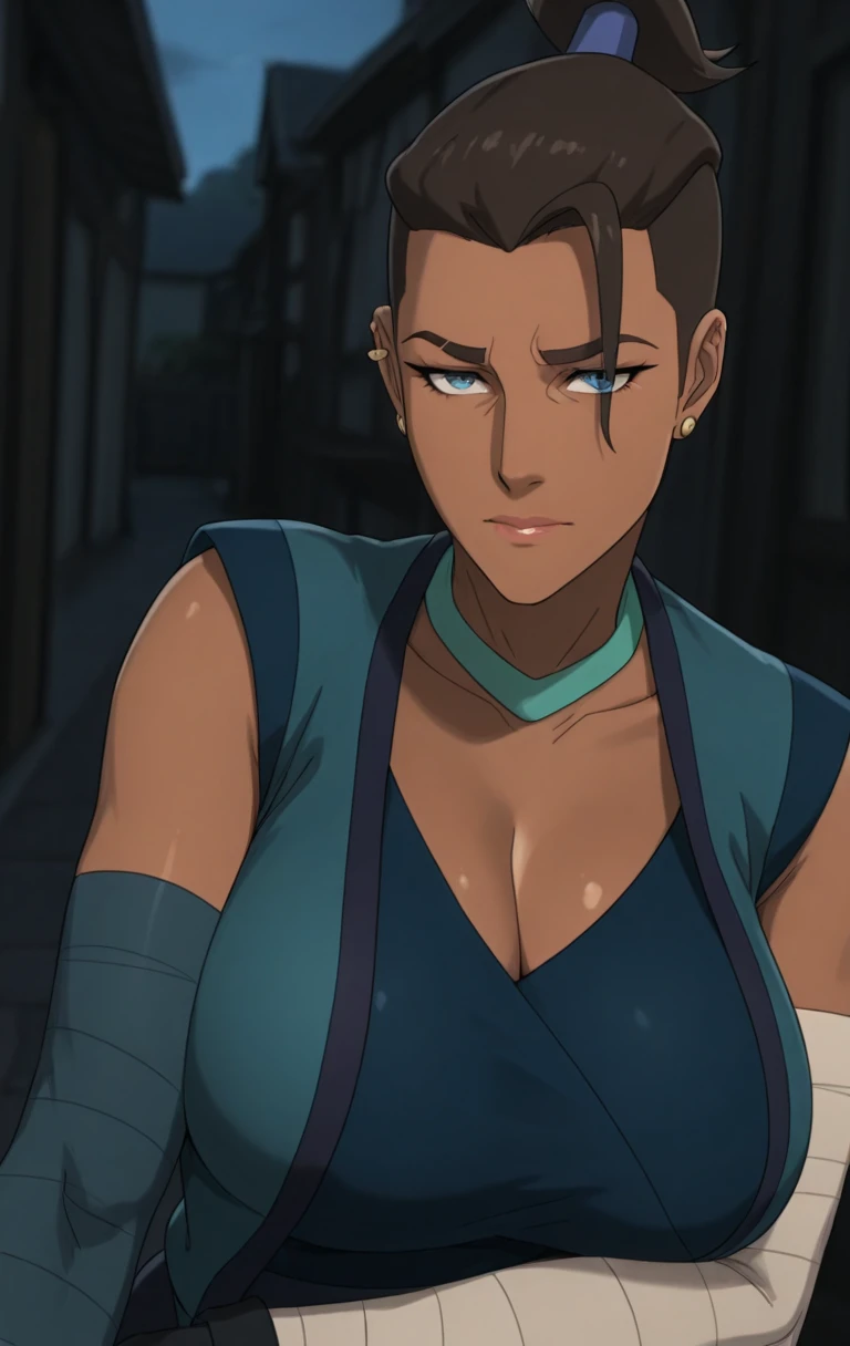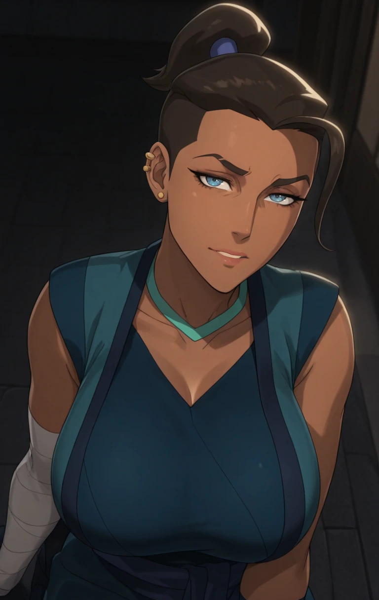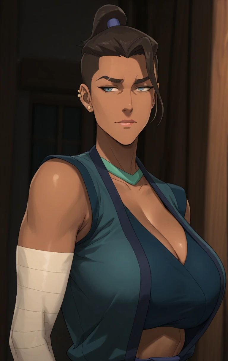 m1ghxty, 1girl, looking at viewer, short hair, blue eyes, brown hair, jewelry, blue shirt, outdoors, earrings, sleeveless, dark skin, dark-skinned female, piercing, stud earrings, breasts, full body, ponytail, fingerless gloves, bandages, bandaged arm