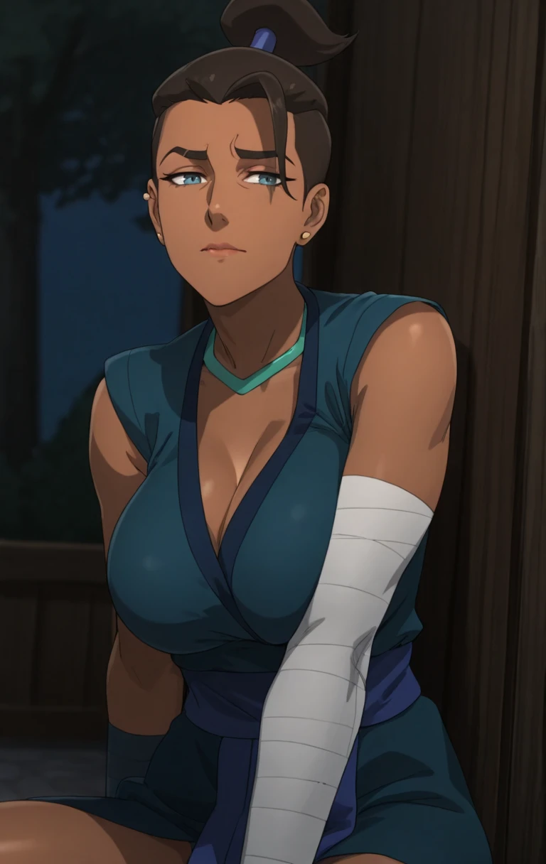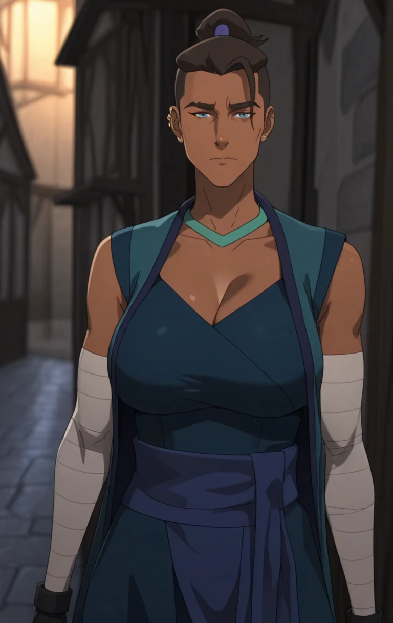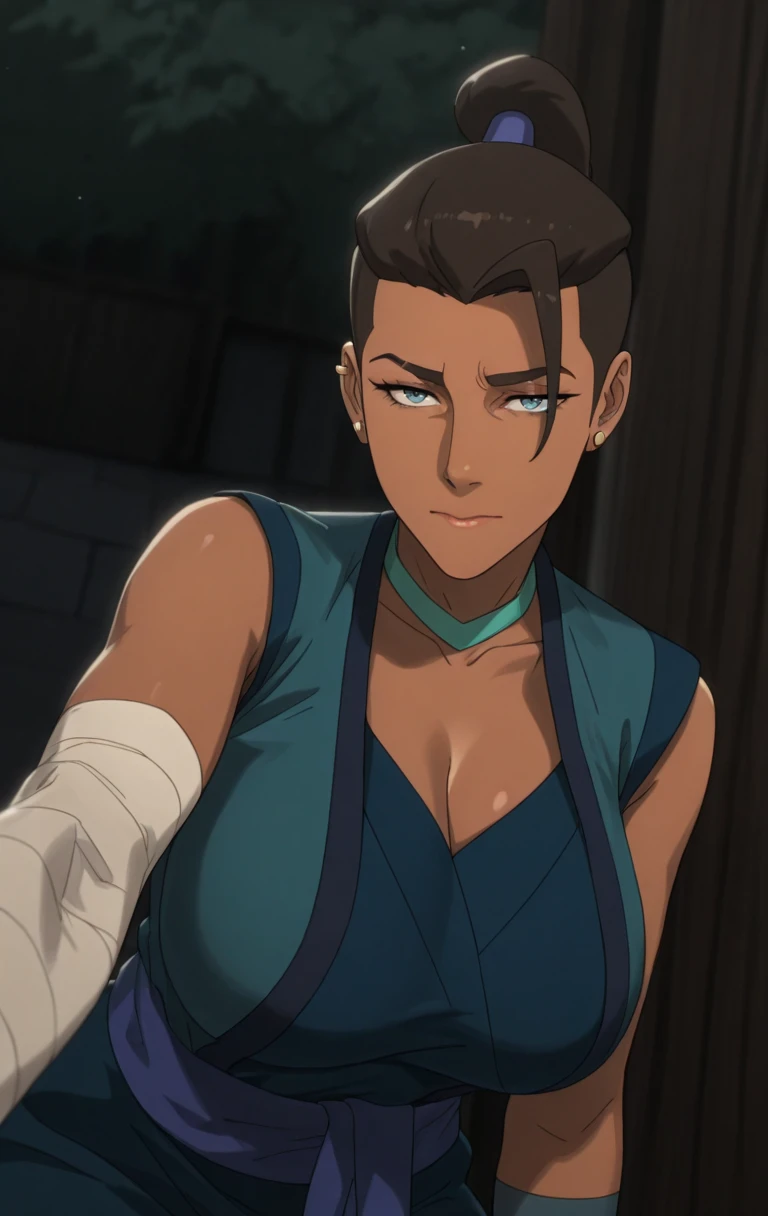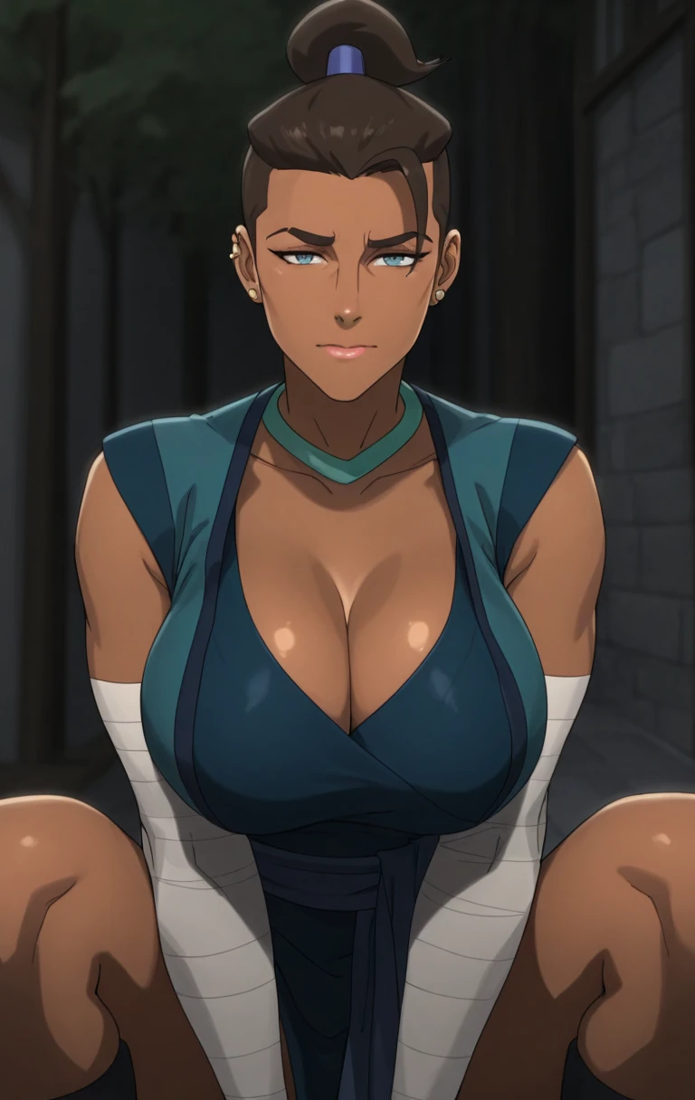 m1ghxty, 1girl, looking at viewer, short hair, blue eyes, brown hair, jewelry, blue shirt, outdoors, earrings, sleeveless, dark skin, dark-skinned female, piercing, stud earrings, breasts, full body, ponytail, fingerless gloves, bandages, bandaged arm