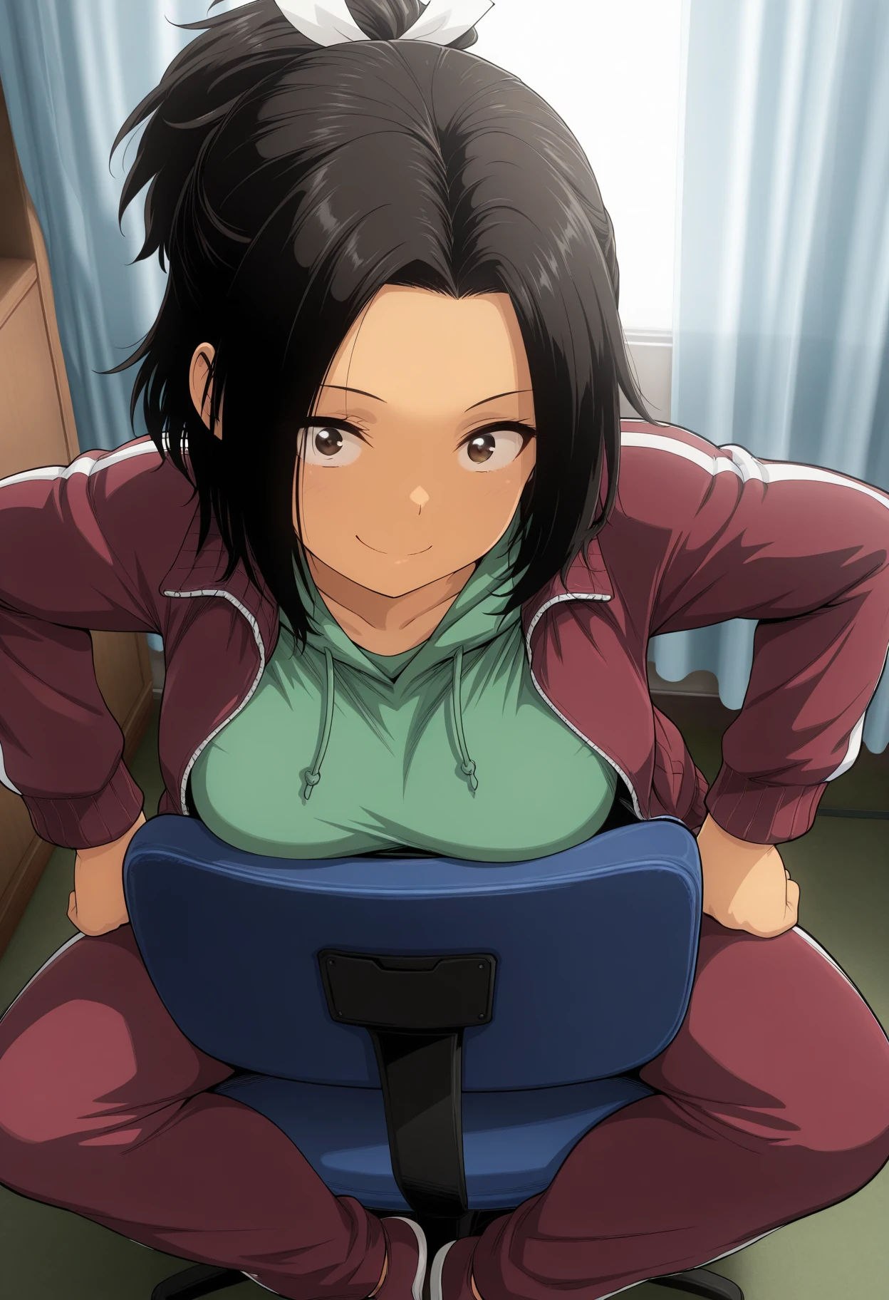 hikari, 1girl, brown eyes, black hair, ponytail, hair ribbon, tan,