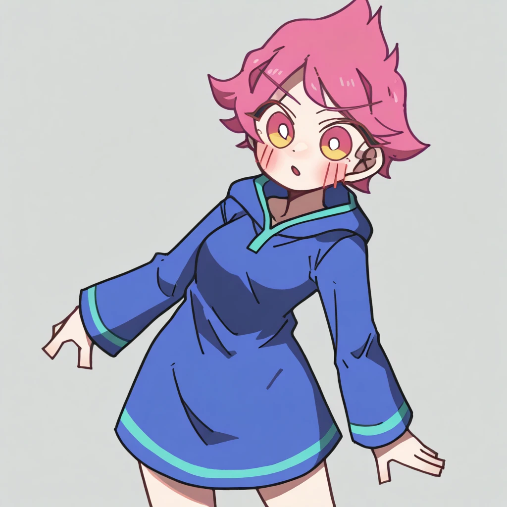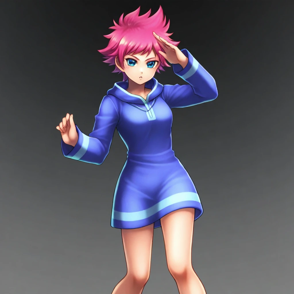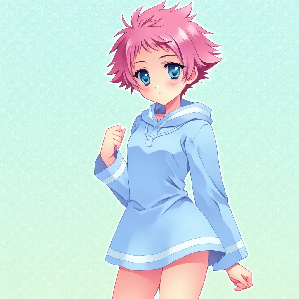 kumatoramother3, 1girl, solo, short hair, pink hair, hoodie, sweater dress, tomboy, blue dress