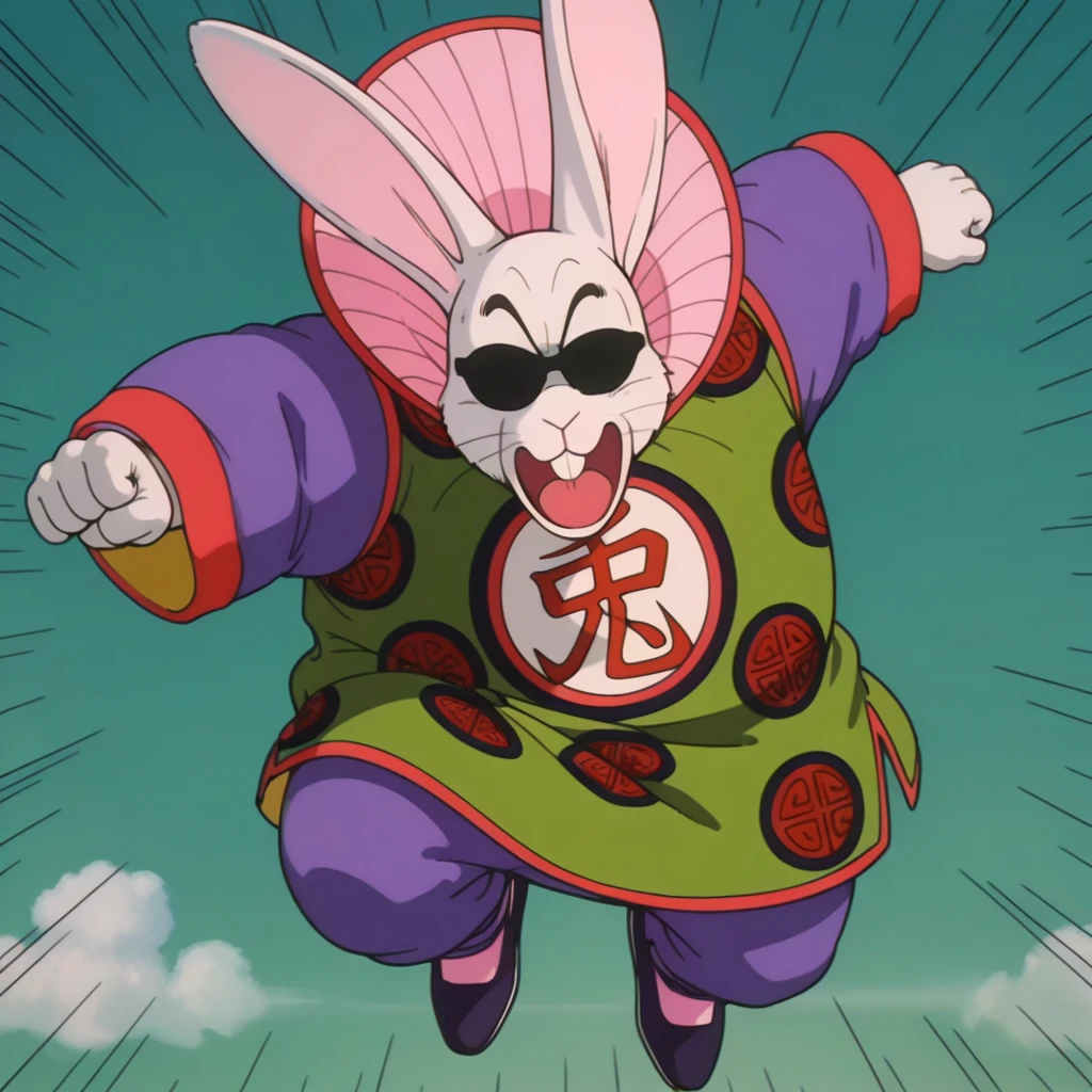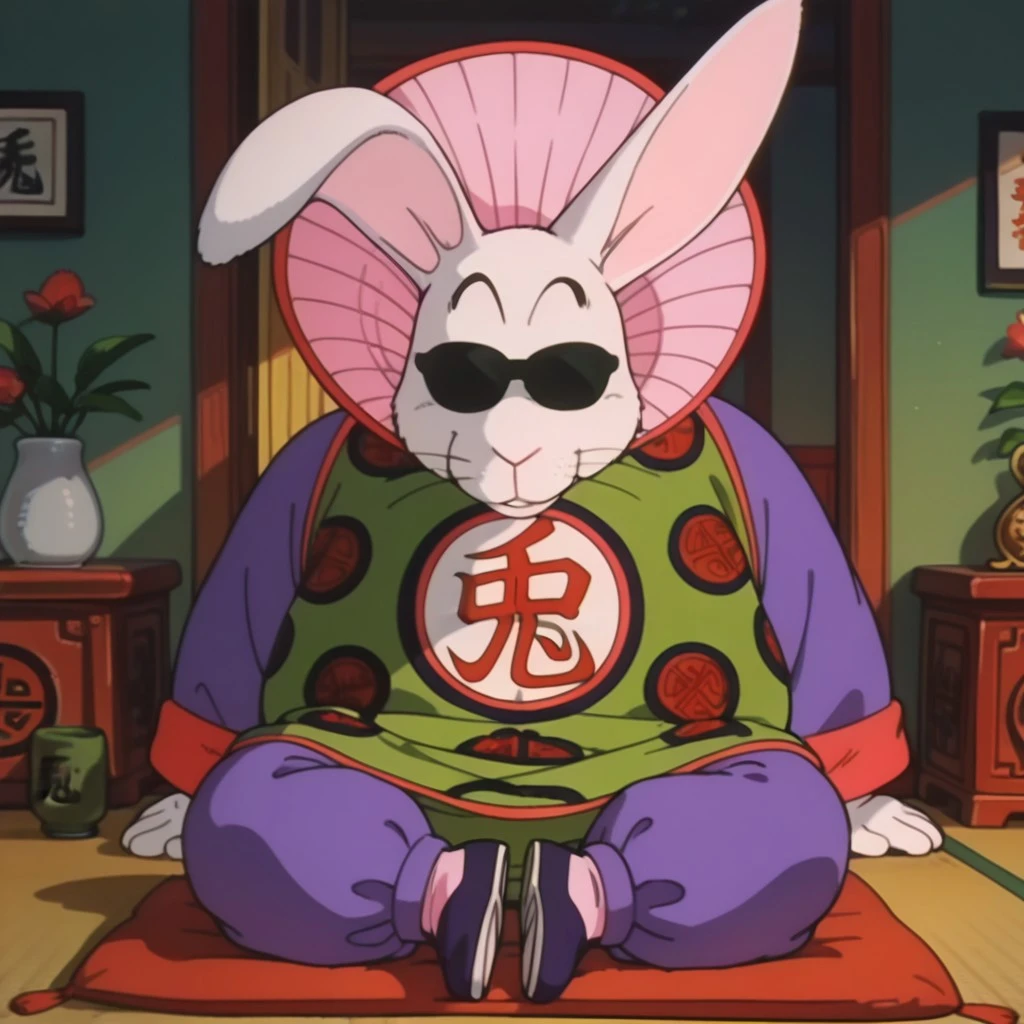 Tags: furry male, long ears, rabbit, rabbit ears, sunglasses, obscured eyes, whiskers, black eyebrows, overweight male, clothes writing, Chinese clothes, green and red robe, long sleeves, purple sleeves, purple pants, baggy pants, pink socks, navy blue shoes