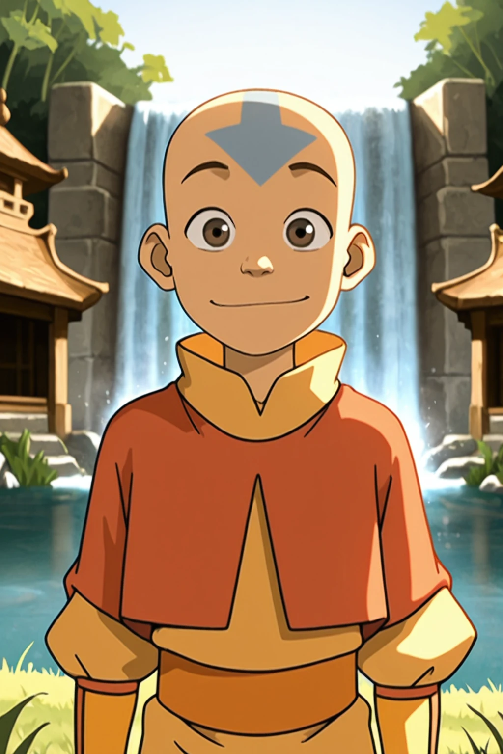 1. Aang, bald, brown eyes, blue arrow tattoo, forehead tattoo, air nomad clothing, orange yellow clothing,