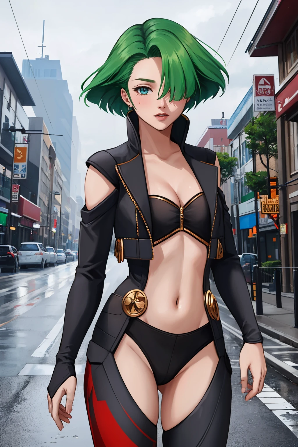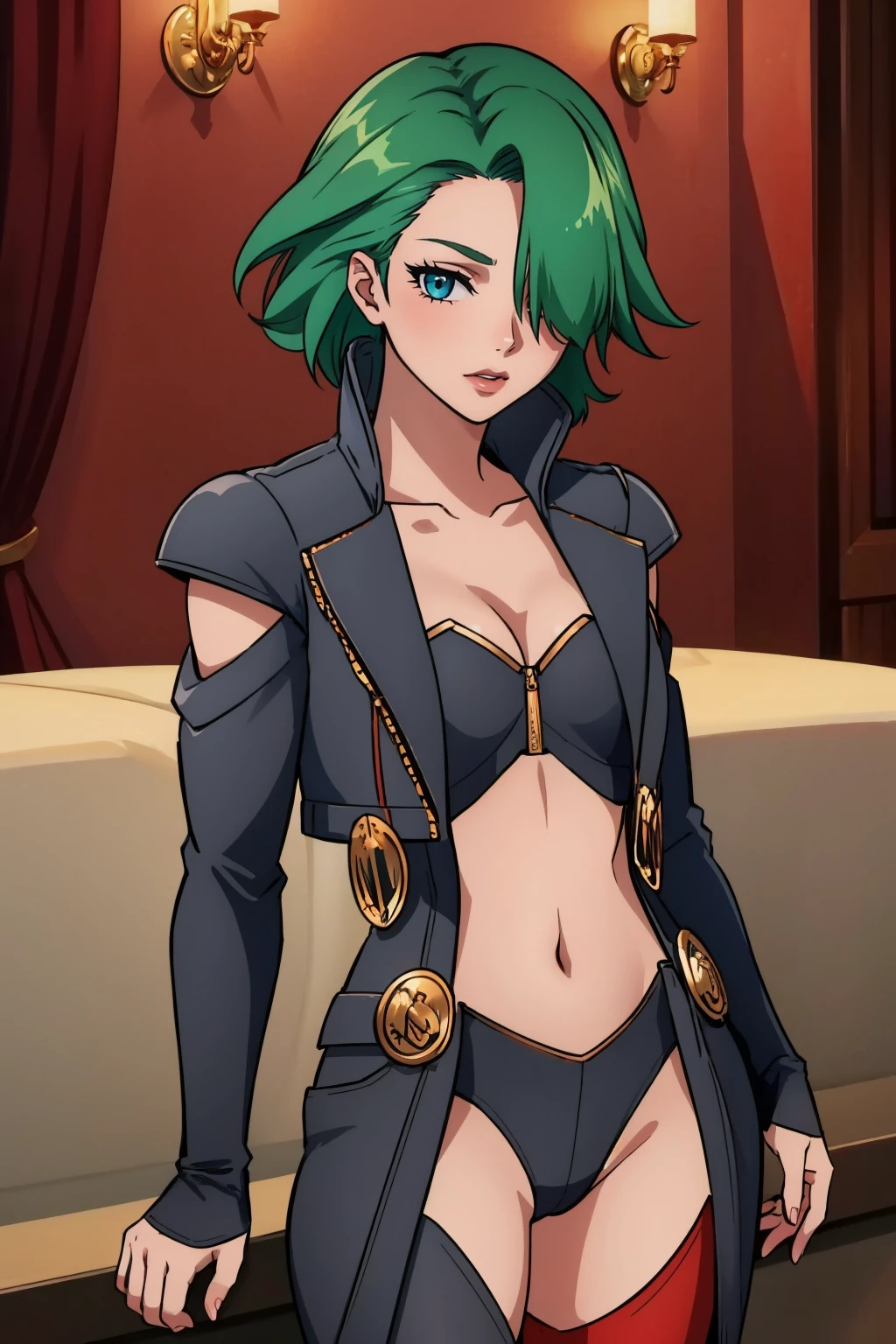 jinanadds, jacket, cleavage, thighhighs, hair over one eye