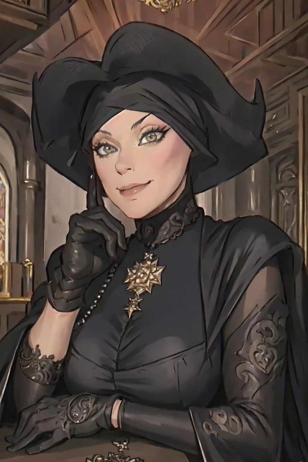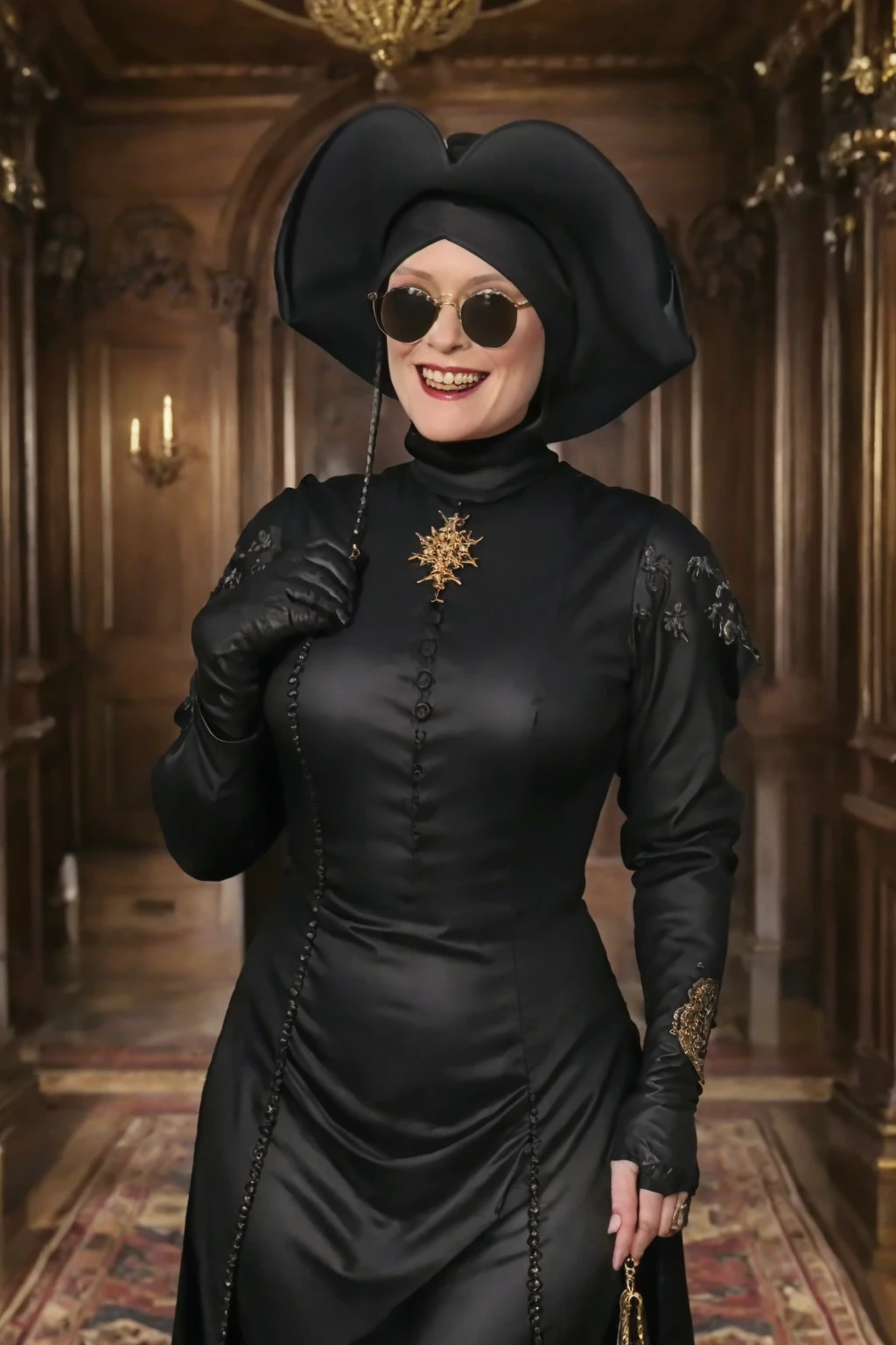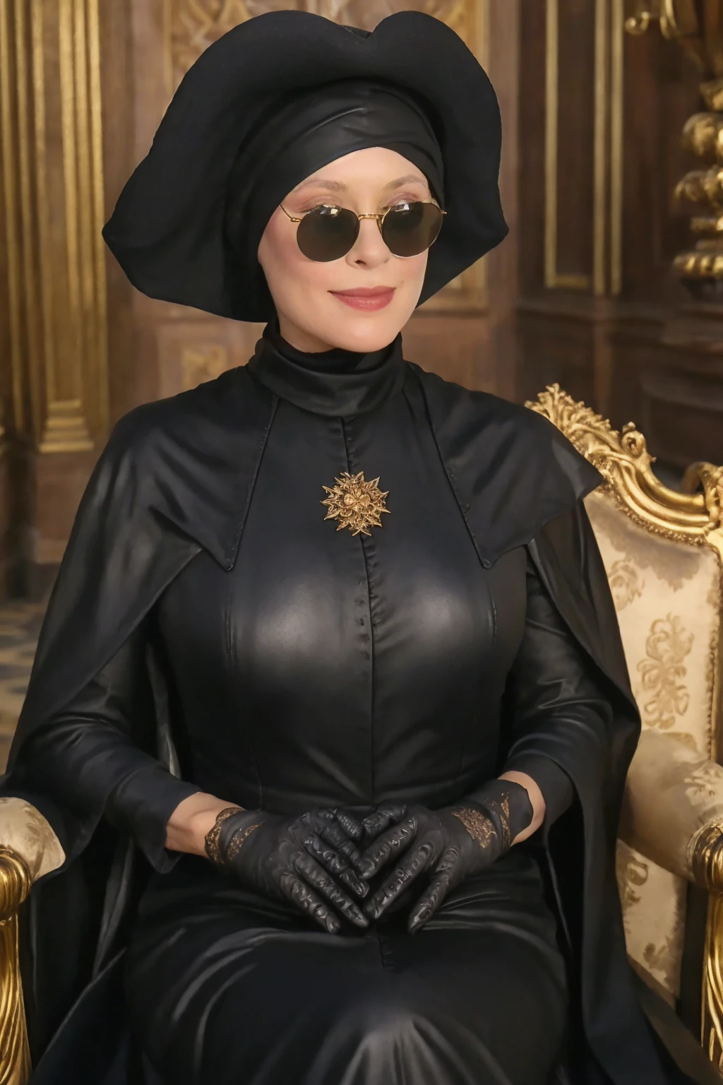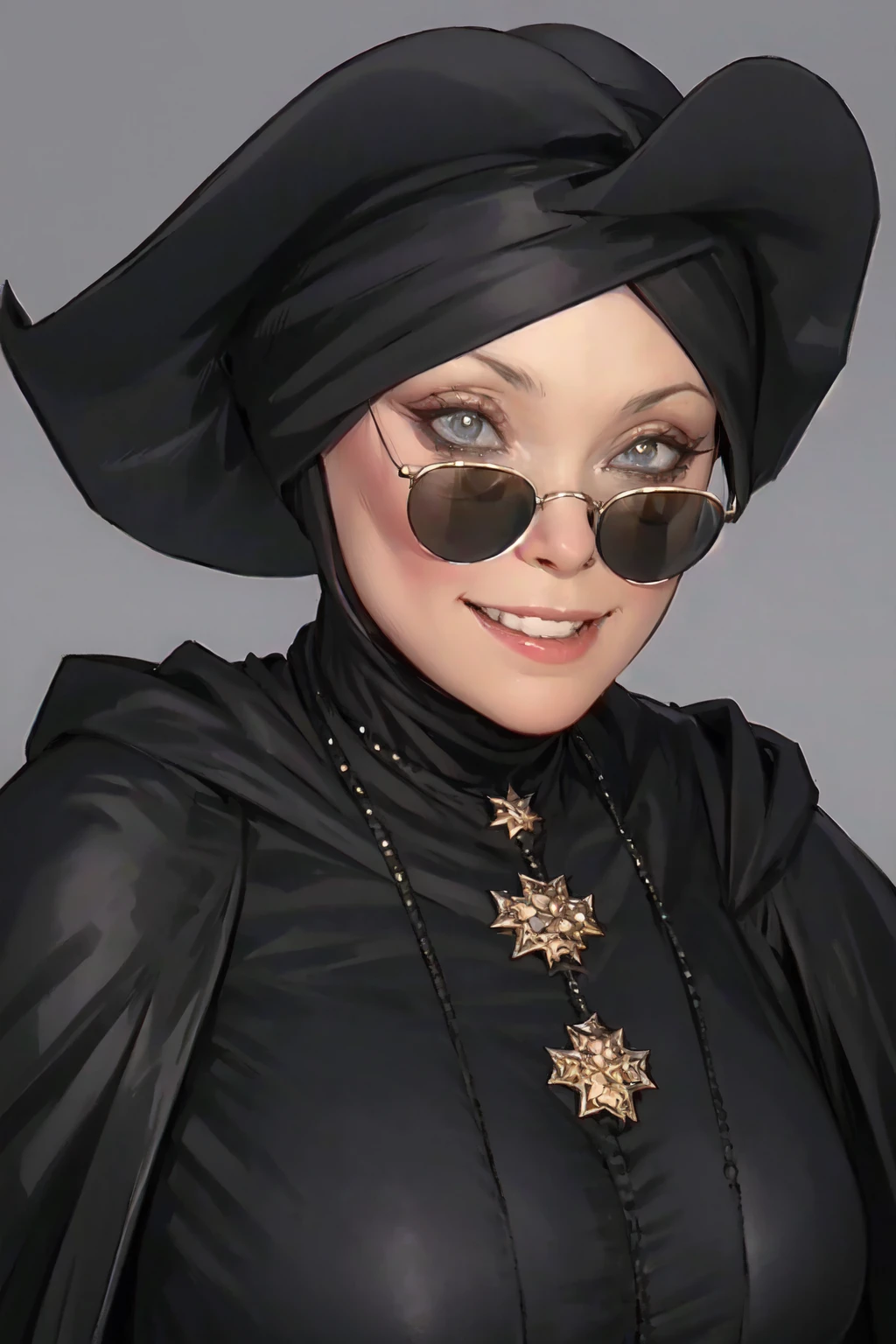 You'll want a strength of about 0.8, and the tags are "HM_B_V_K, black headwear, black dress, necklace, black gloves, black cloak, grey eyes", with "sunglasses" optional.