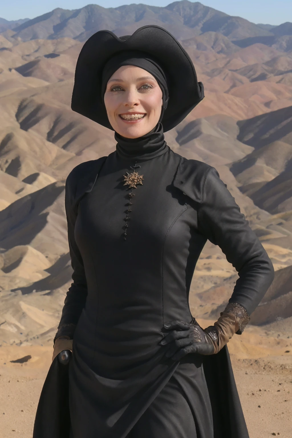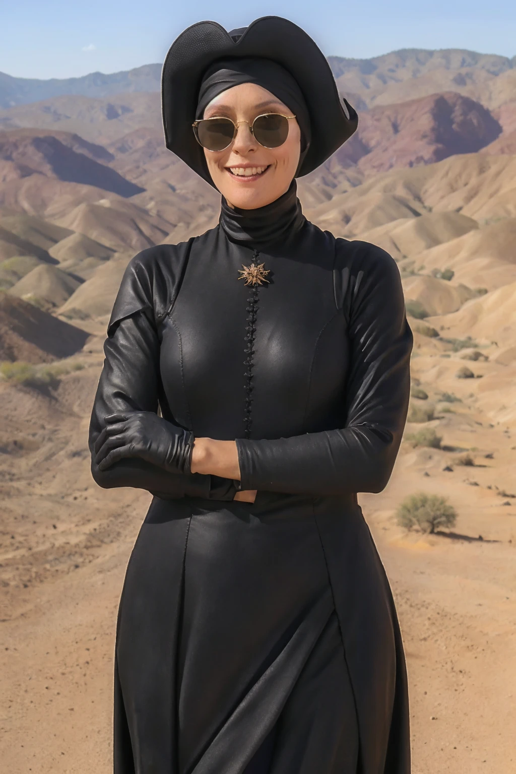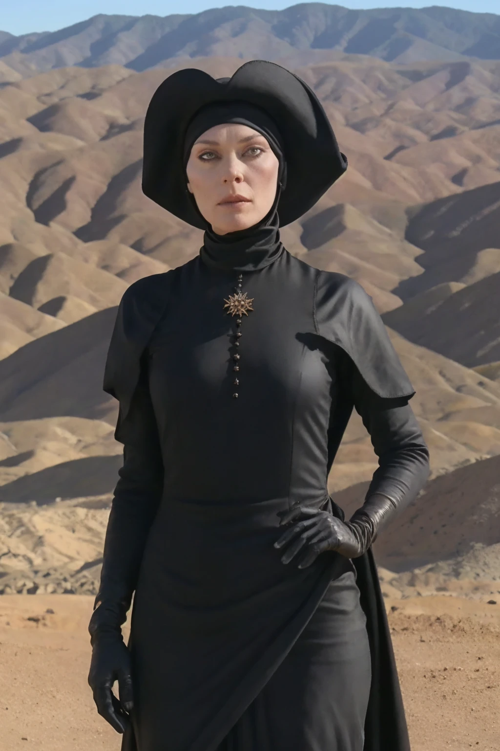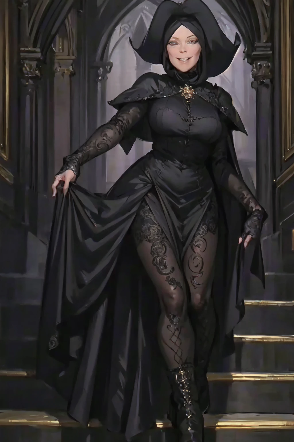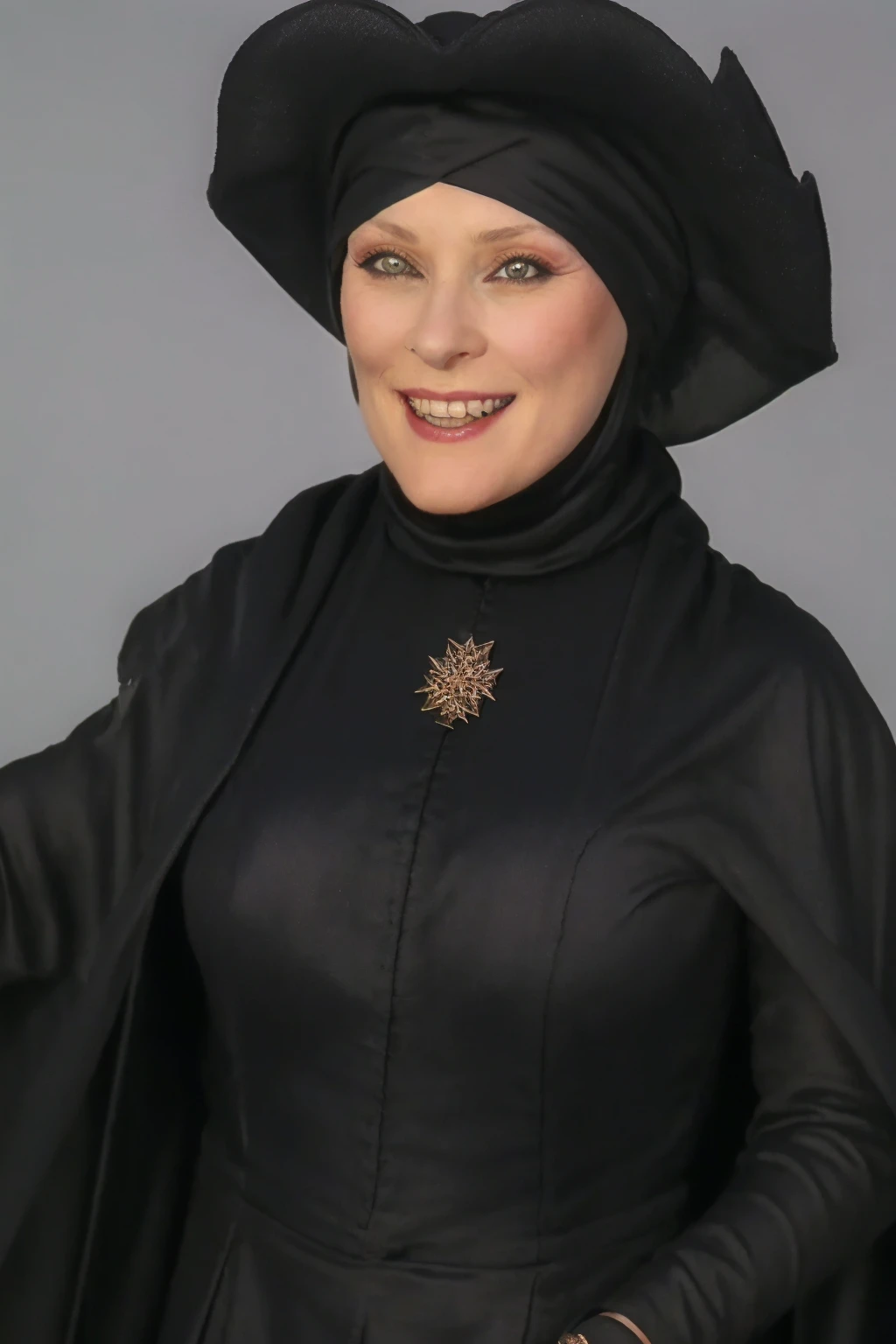 You'll want a strength of about 0.8, and the tags are "HM_B_V_K, black headwear, black dress, necklace, black gloves, black cloak, grey eyes", with "sunglasses" optional.