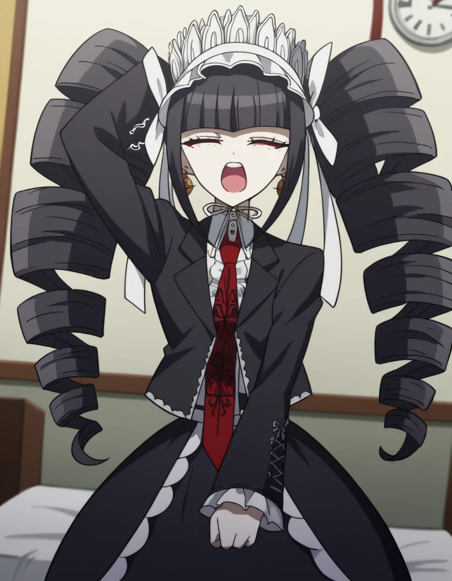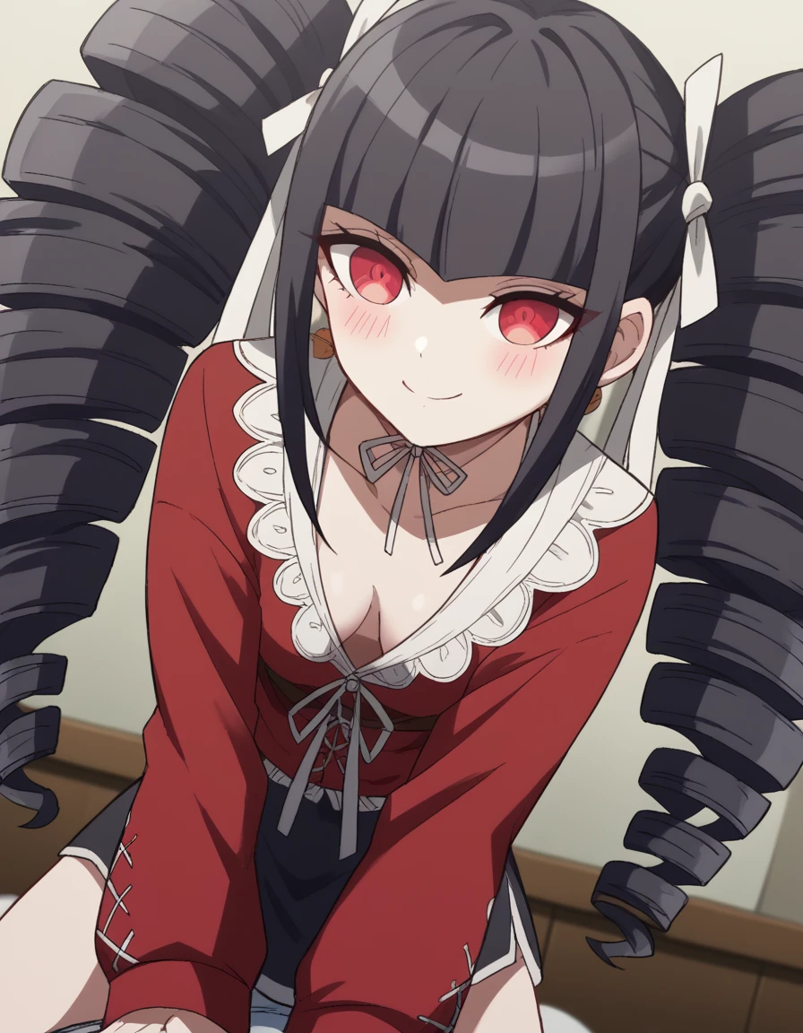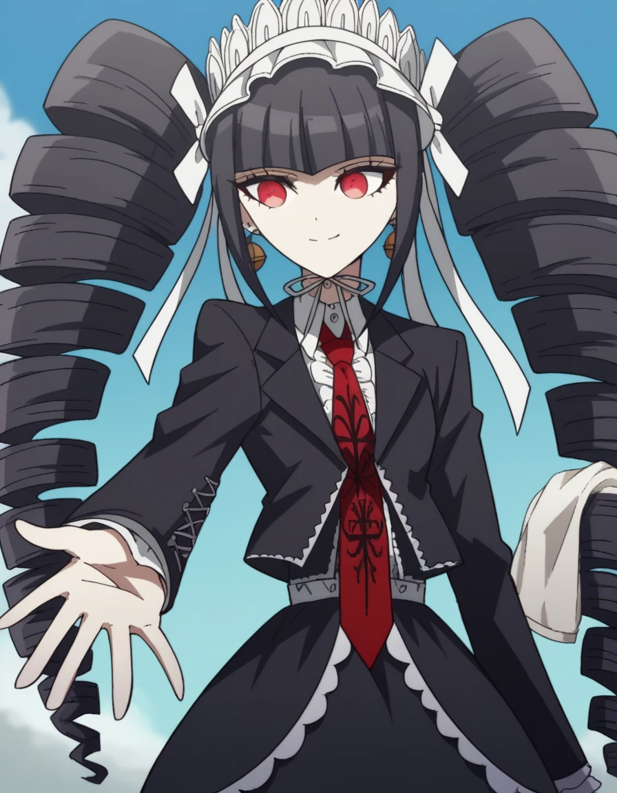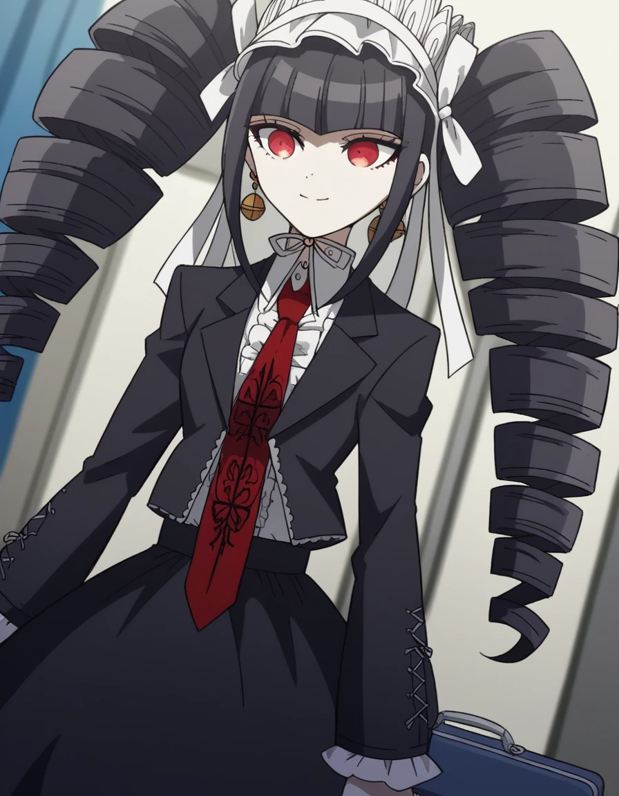 celestia ludenberg, long hair, bangs, black hair, red eyes, long sleeves, twintails, drill hair, twin drills,