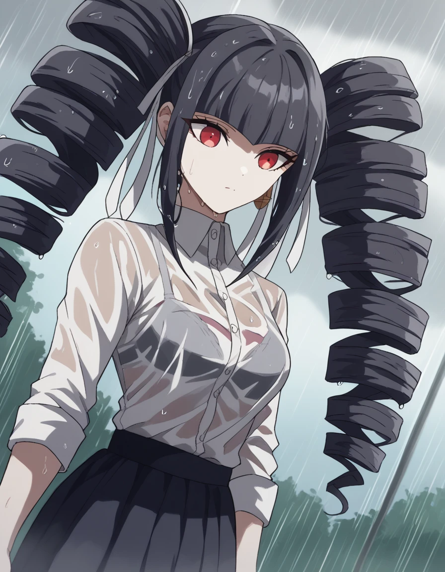 <lora:celestia-ludenberg-s1-ponyxl-lora-nochekaiser:1>, celestia ludenberg, long hair, bangs, black hair, red eyes, long sleeves, twintails, drill hair, twin drills,