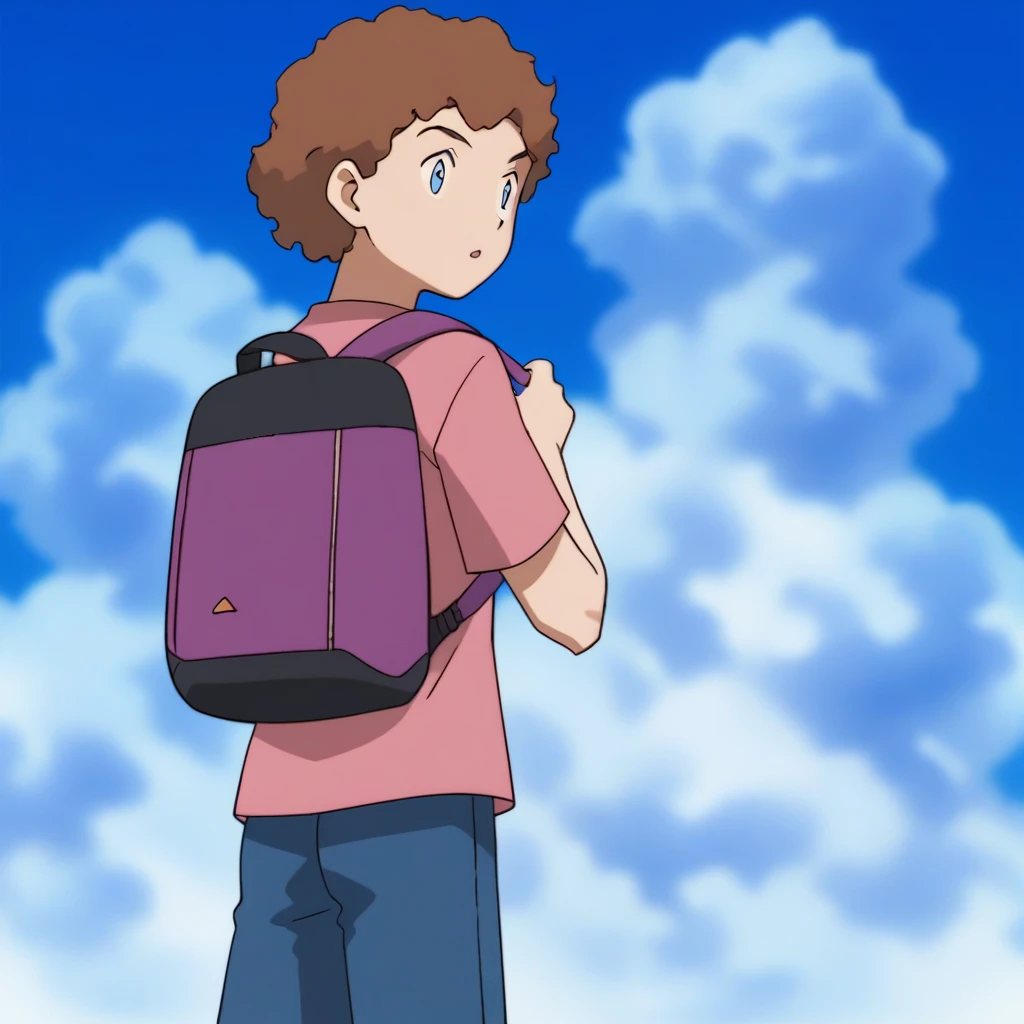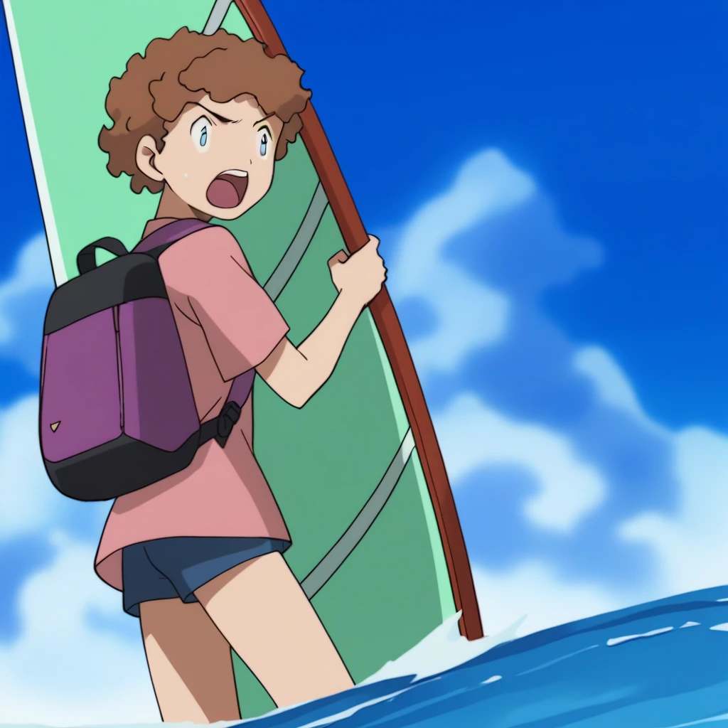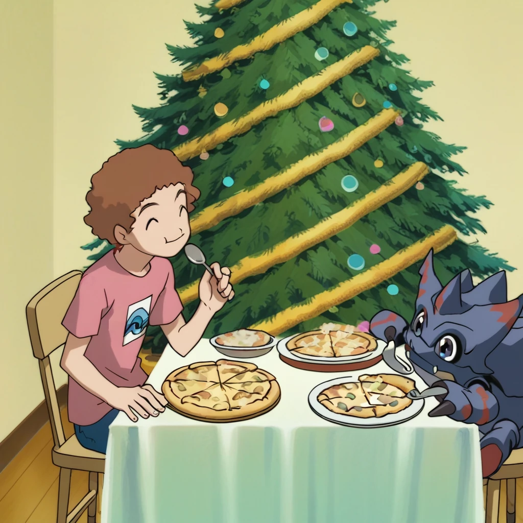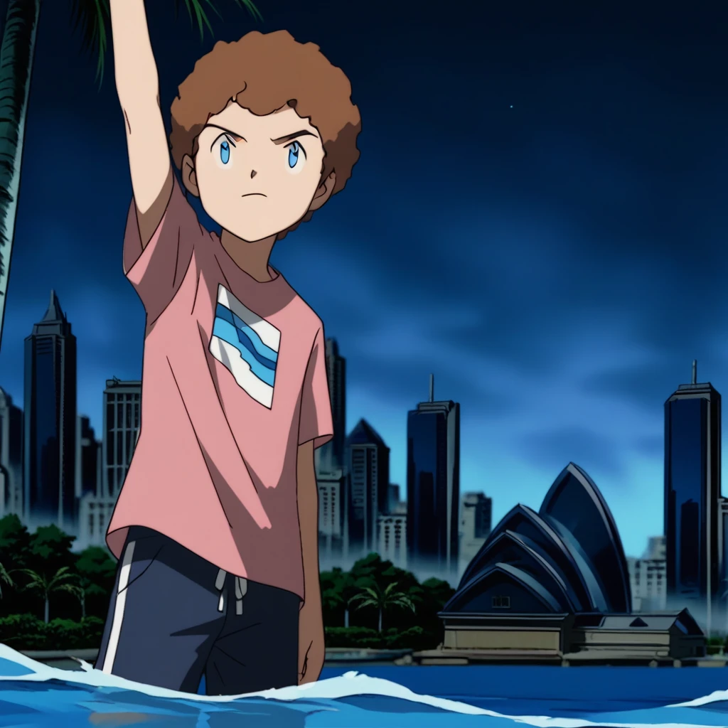 Prompts: male, brown hair, curly hair, blue eyes, pink t-shirt, print shirt, blue swim briefs or blue swim trunks, white footwear, indoors (house/wooden floor/yellow wall/table/pizza/food/plate/spoon/chair/Christmas tree), outdoors (beach/sky/cloud/sand/ocean), outdoors (cityscape/night sky/Sydney Opera House/water/greenery/palm tree)