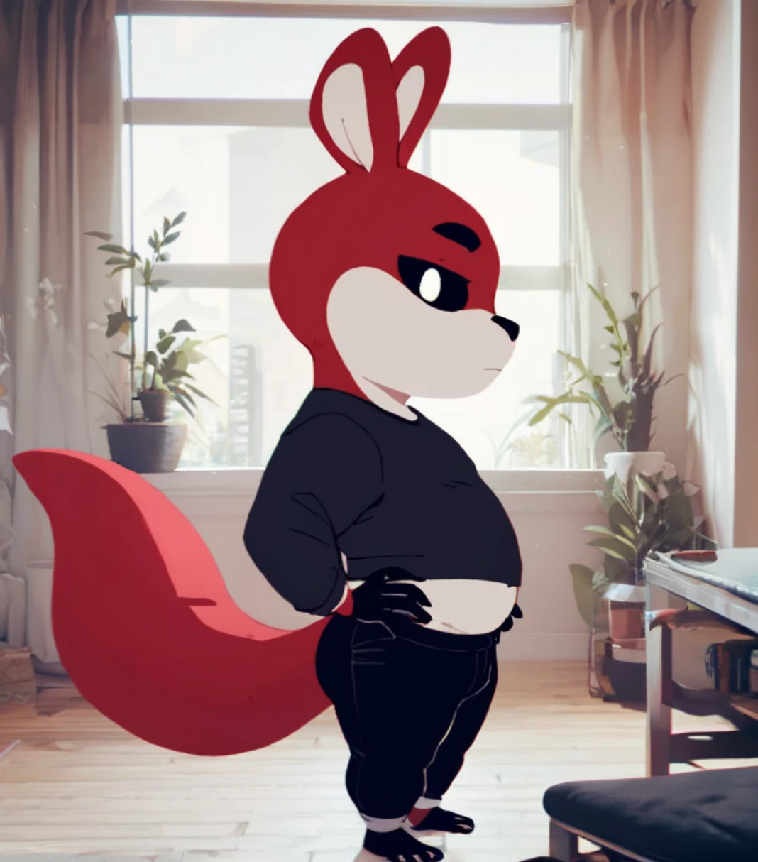 hawtsaus,anthro, solo, male, sciurid, red body, (white skin:1.1), bald, red ears, white inner ears, black sclera, white eyes, black nose, black hands, black feet, big red tail ,short stack Guidance prompt .