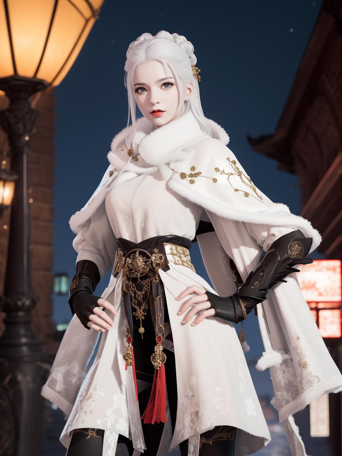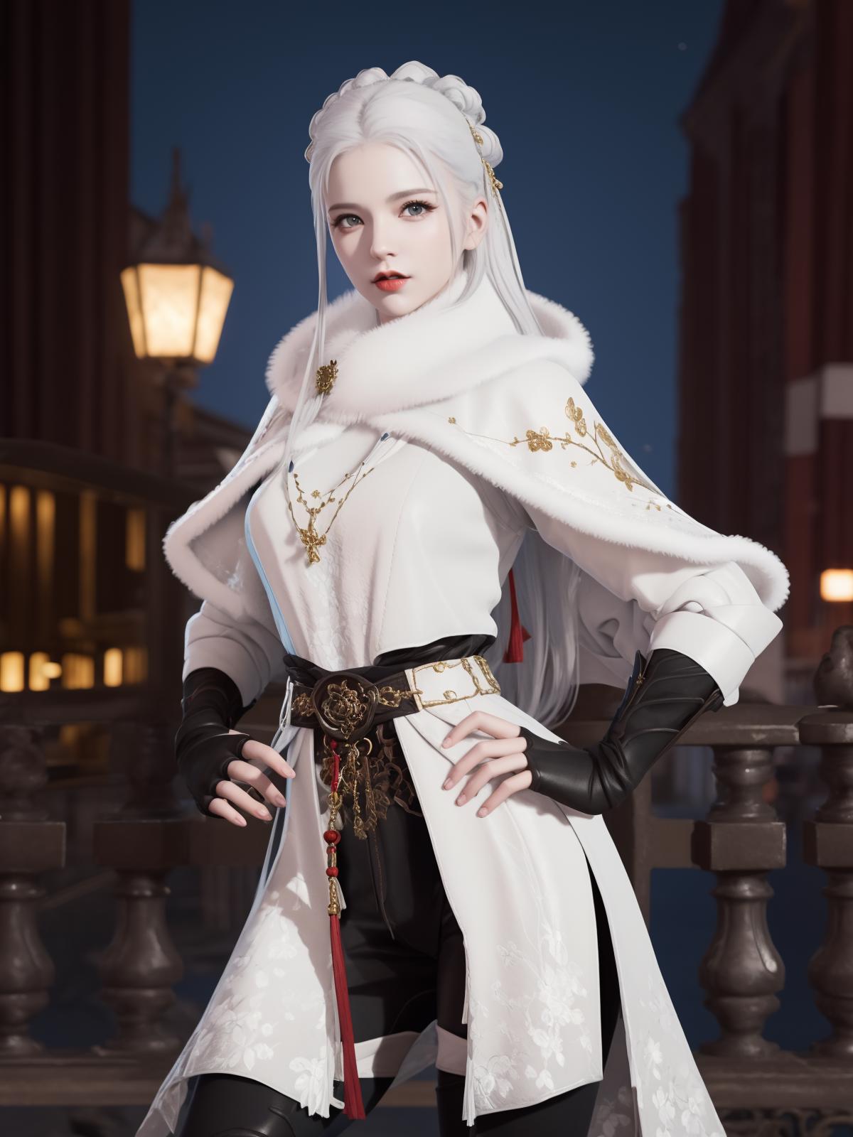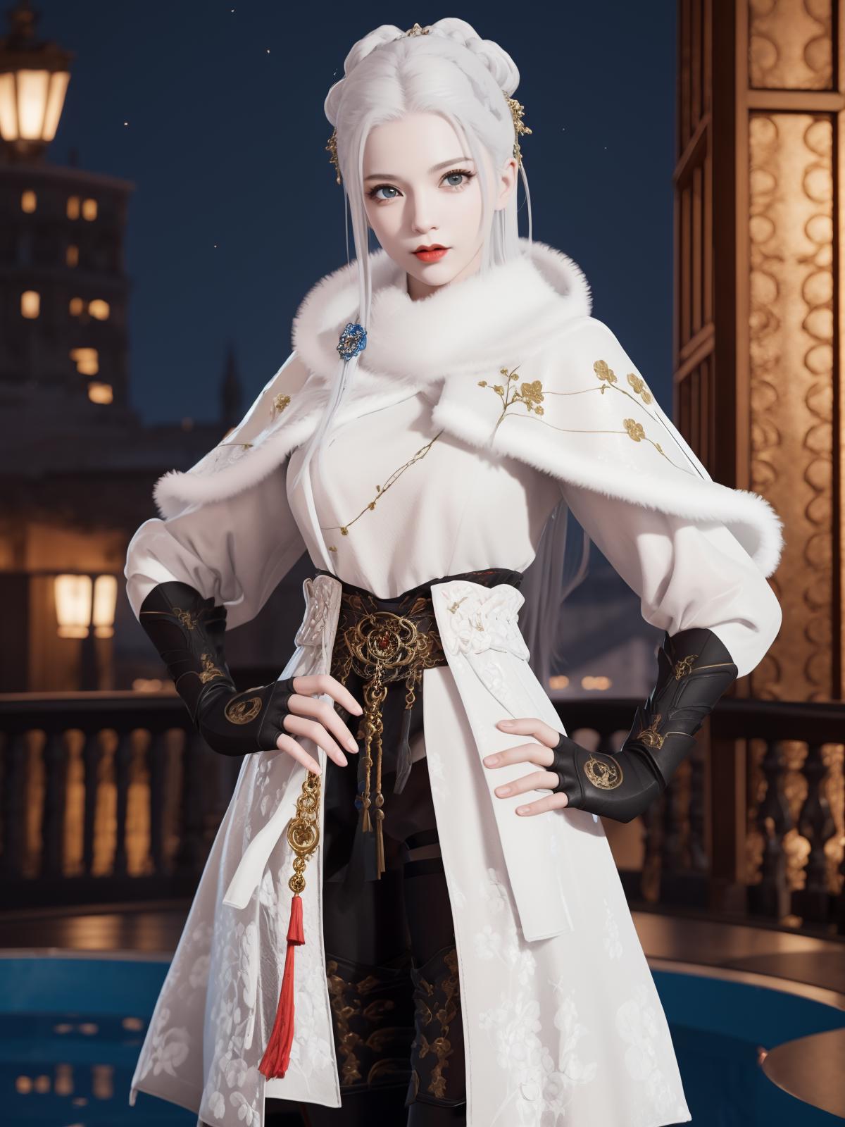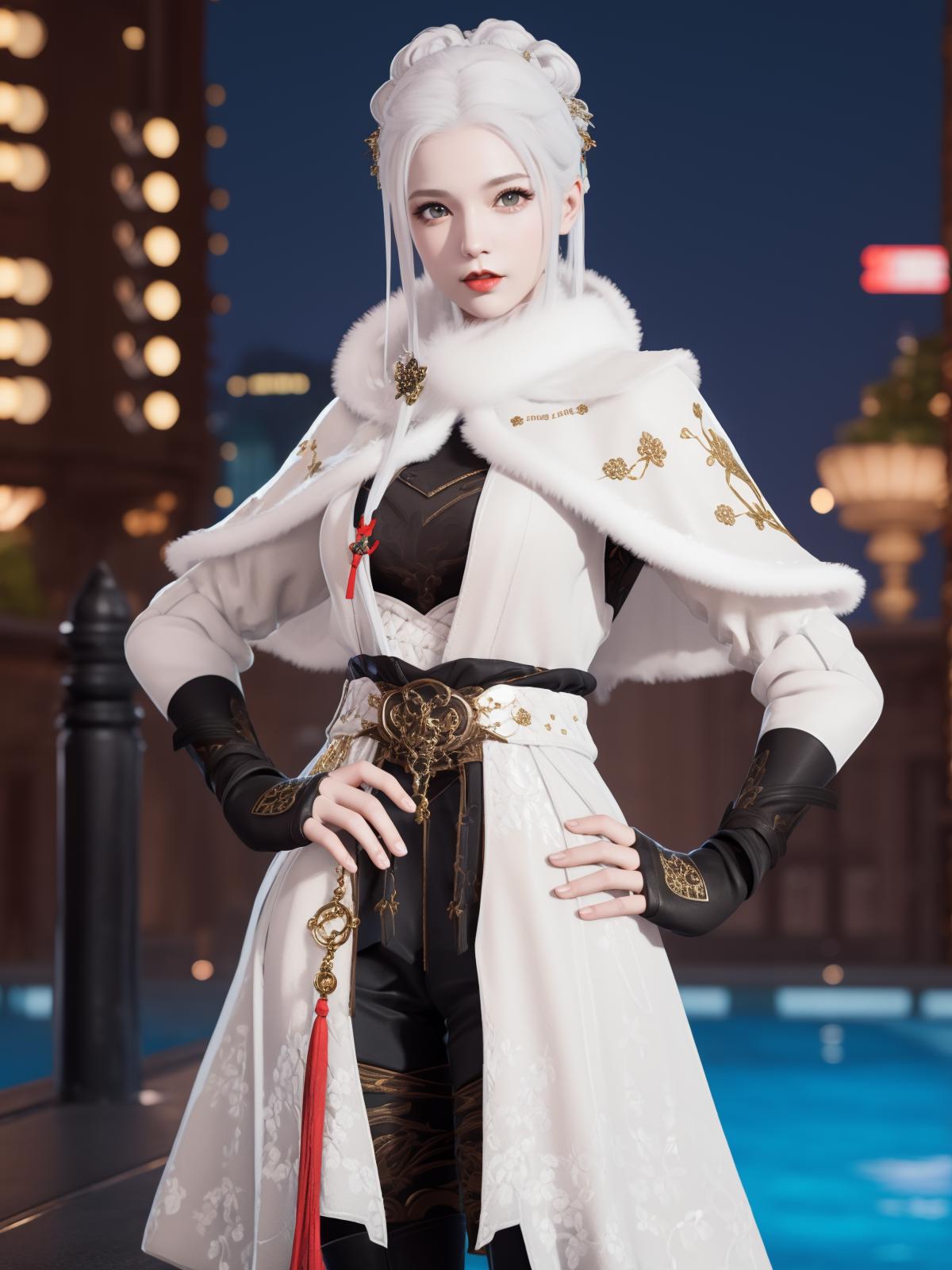 YJWJguqinghanHYSX, 1girl, solo, boots, gloves, white hair, blue eyes, fur trim, fingerless gloves, tassel, belt, capelet, long hair, black gloves, armor, white capelet,makeup,red lips, jewelry, thigh boots, hair bun, cityscape, night,mature female, pool, looking at viewer,