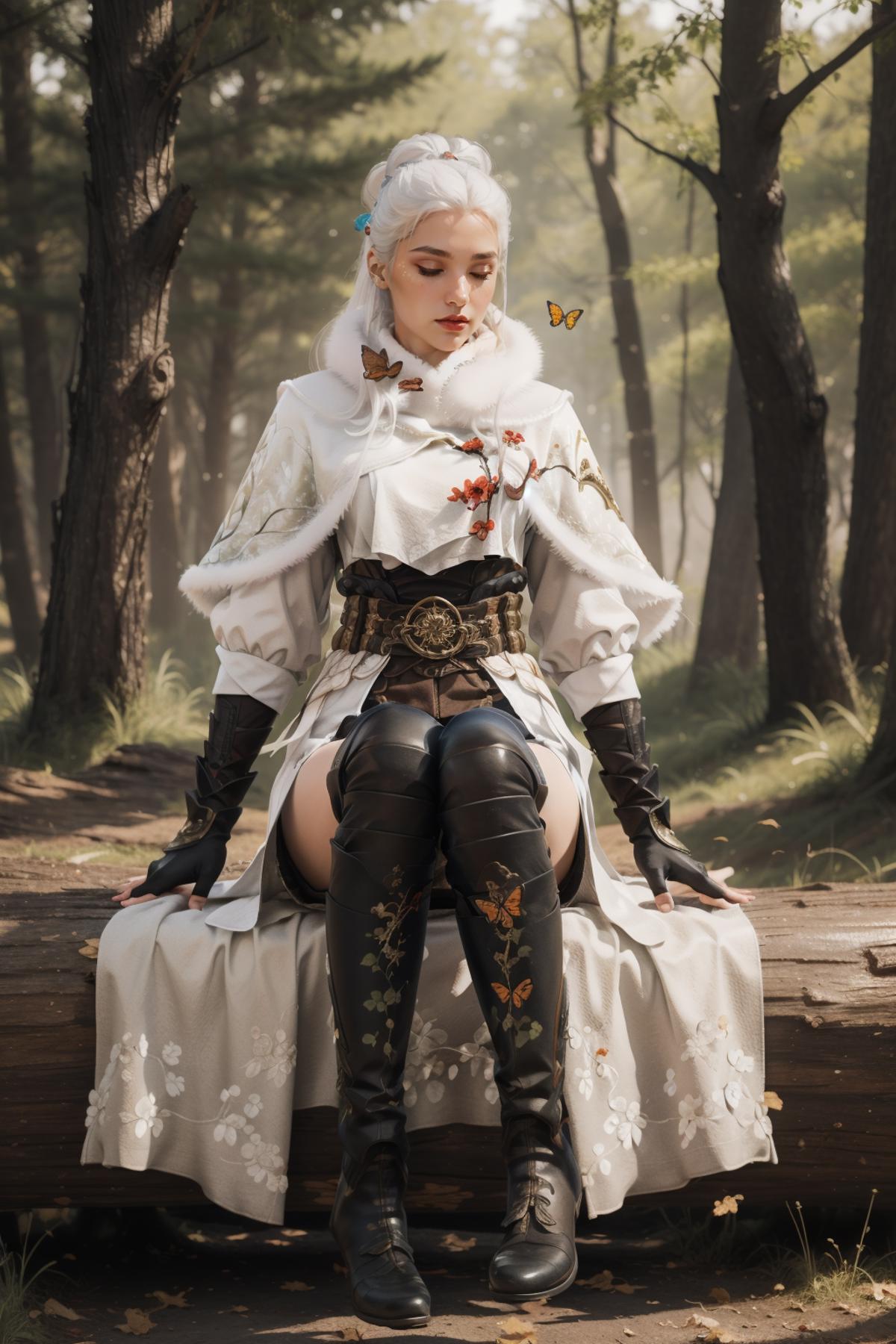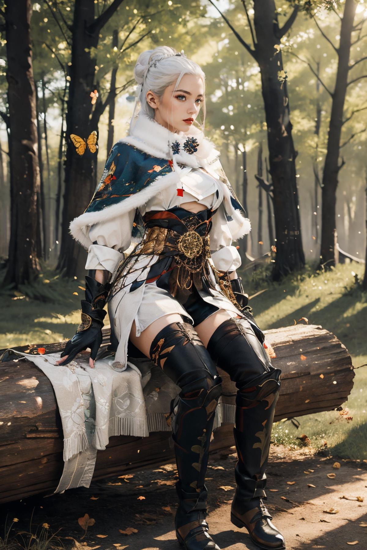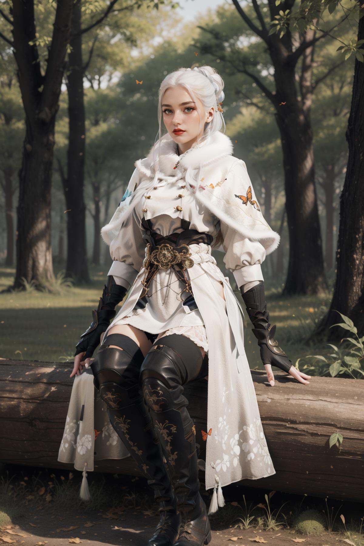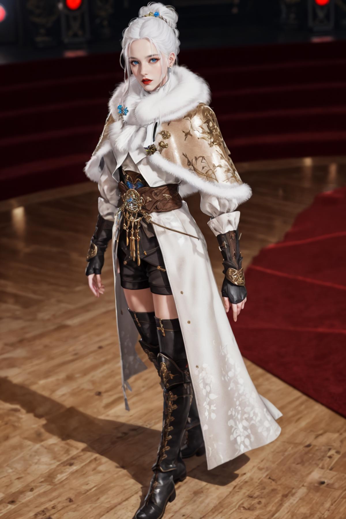 YJWJguqinghanHYSX, 1girl, solo, boots, gloves, white hair, blue eyes, fur trim, fingerless gloves, tassel, belt, capelet, long hair, black gloves, armor, white capelet,makeup,red lips, jewelry, thigh boots, hair bun, cityscape, night,mature female, pool, looking at viewer,
