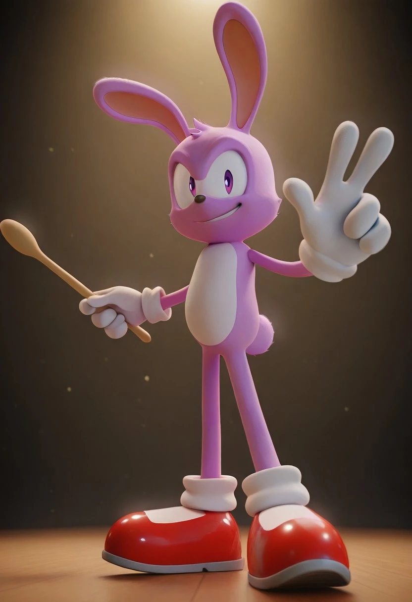 Mach the Rabbit, pink fur, purple eyes, long bunny ears, white stomach fur, white gloves, red shoes, holding drumstick