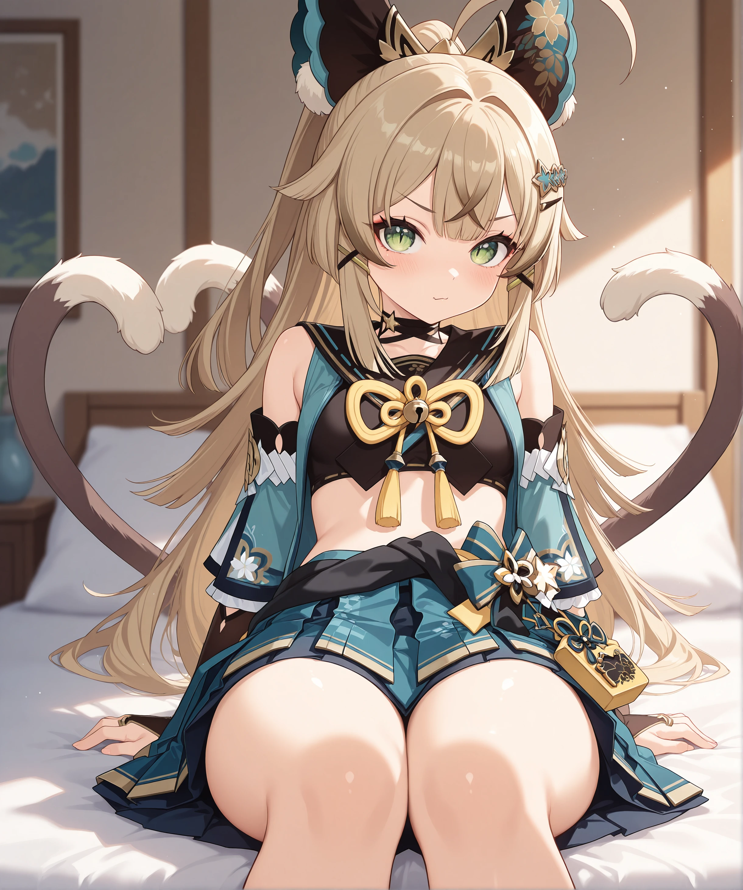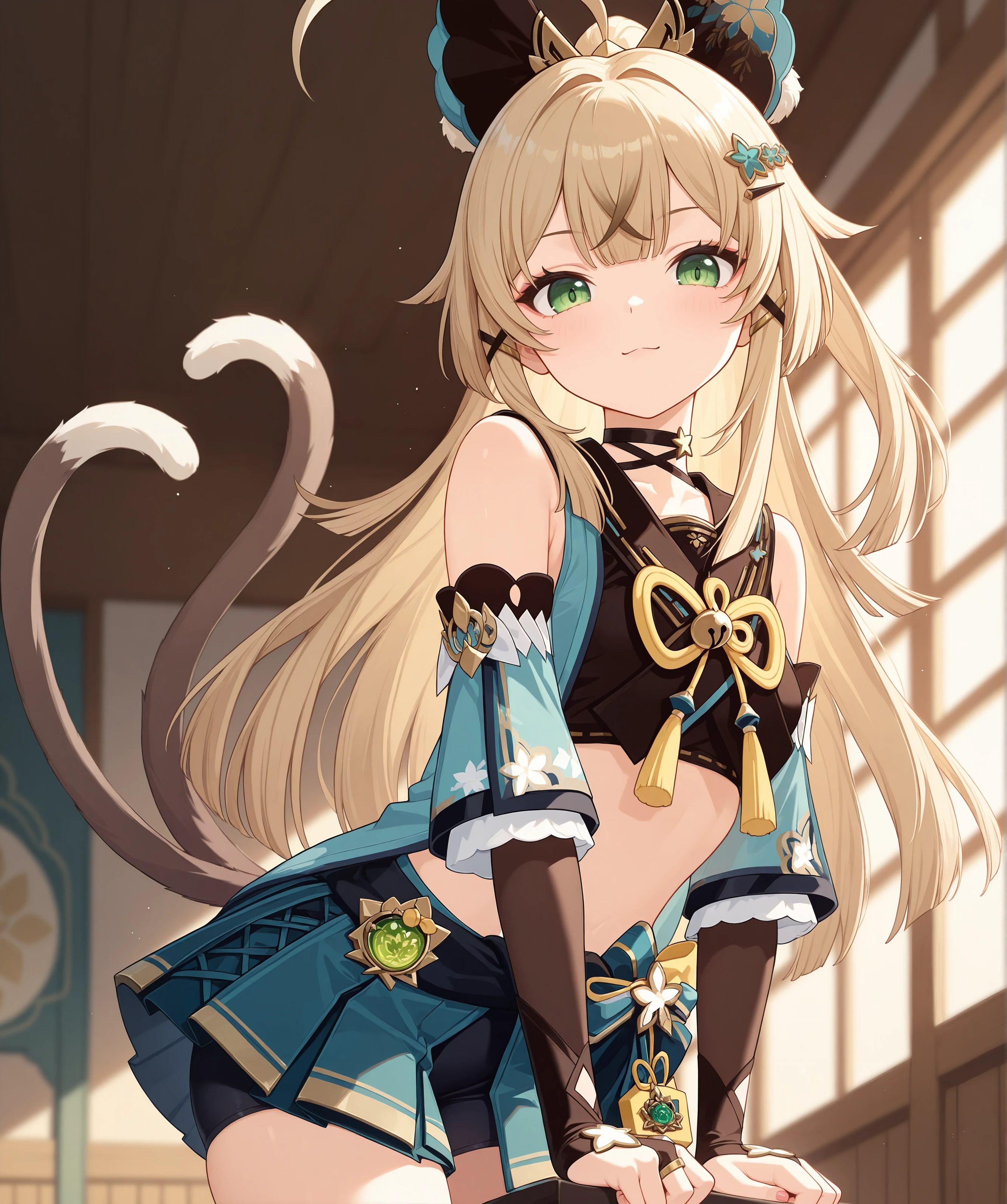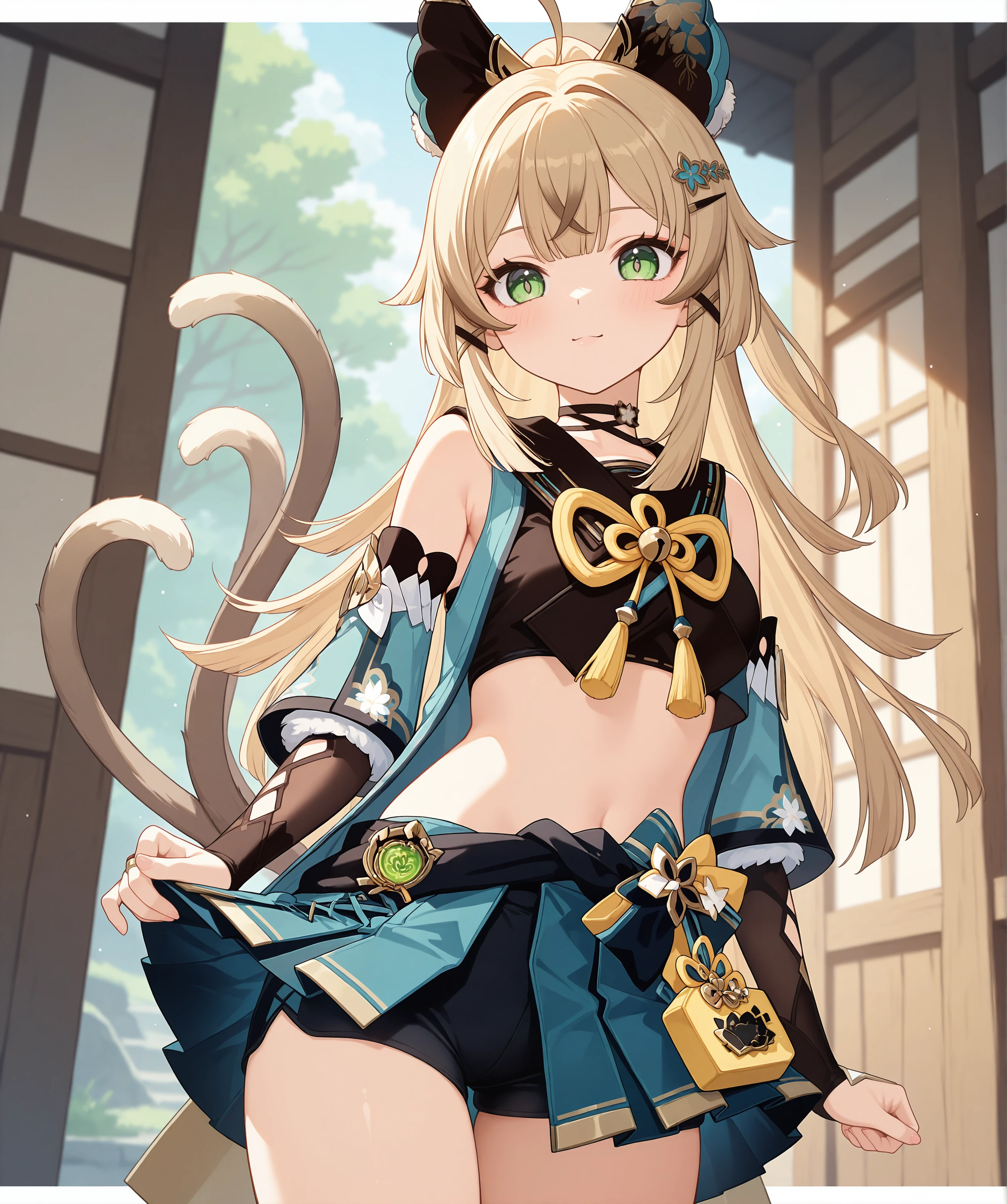 > KiraraRaw, 1girl, solo, cat ears, two tails, cat tail, green eyes, blonde hair
