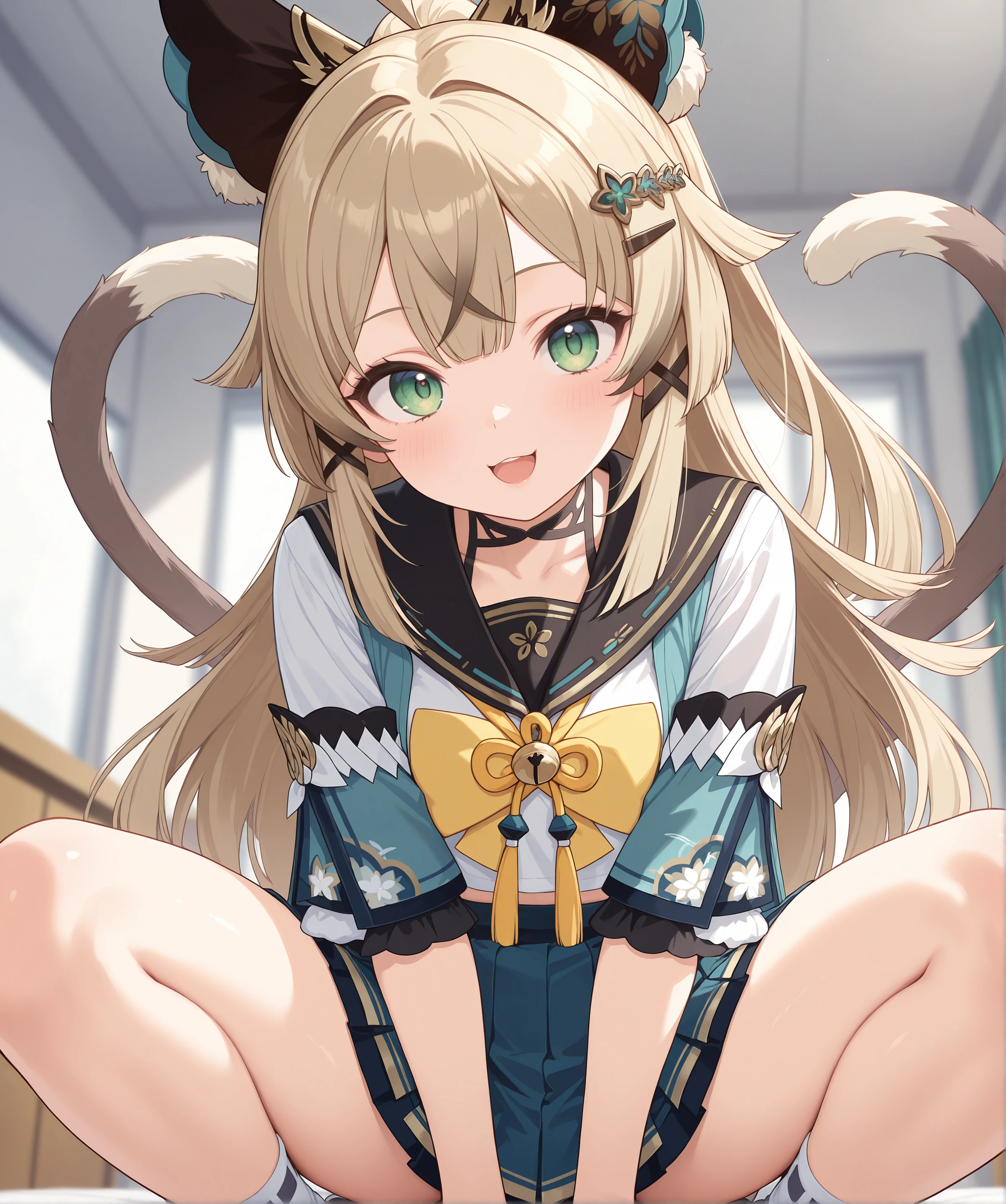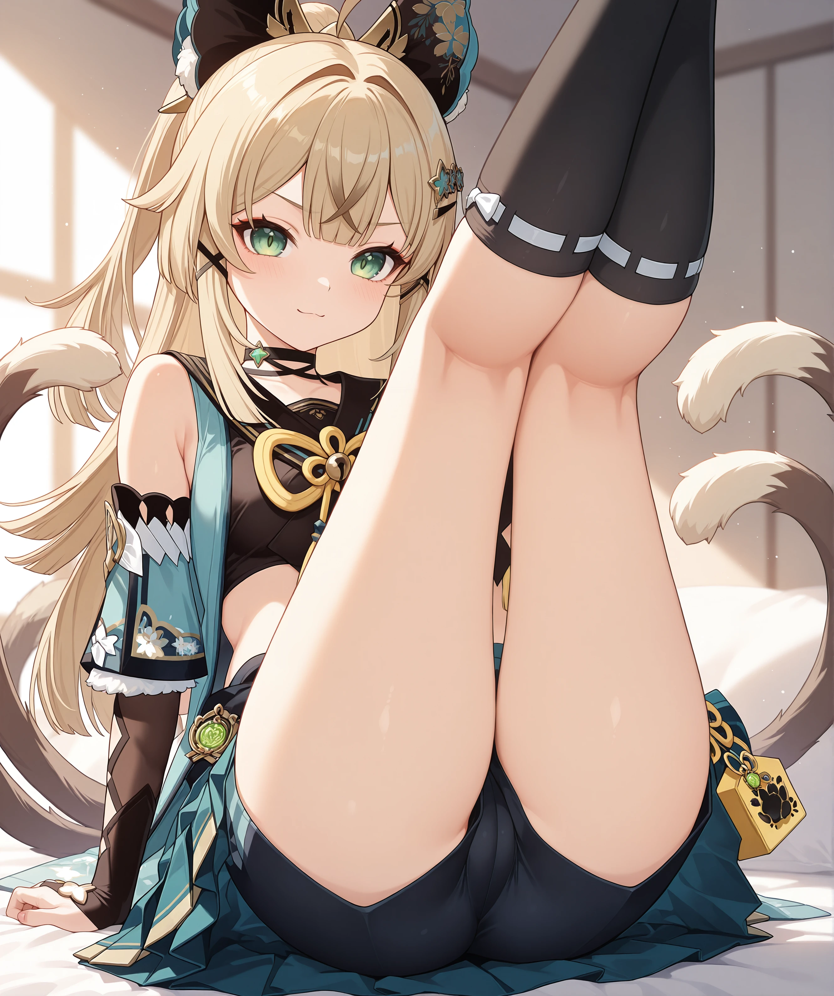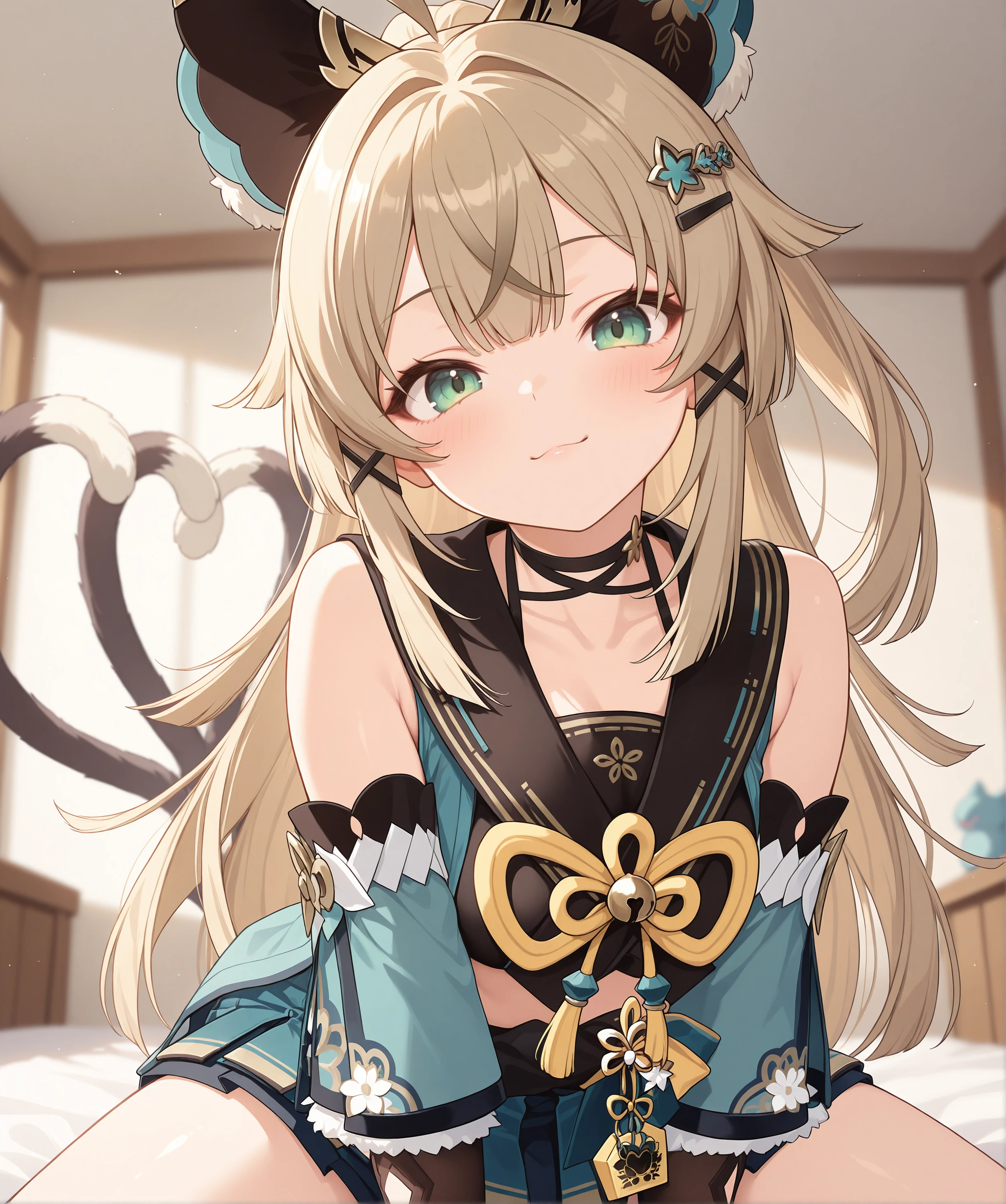 > KiraraRaw, 1girl, solo, cat ears, two tails, cat tail, green eyes, blonde hair