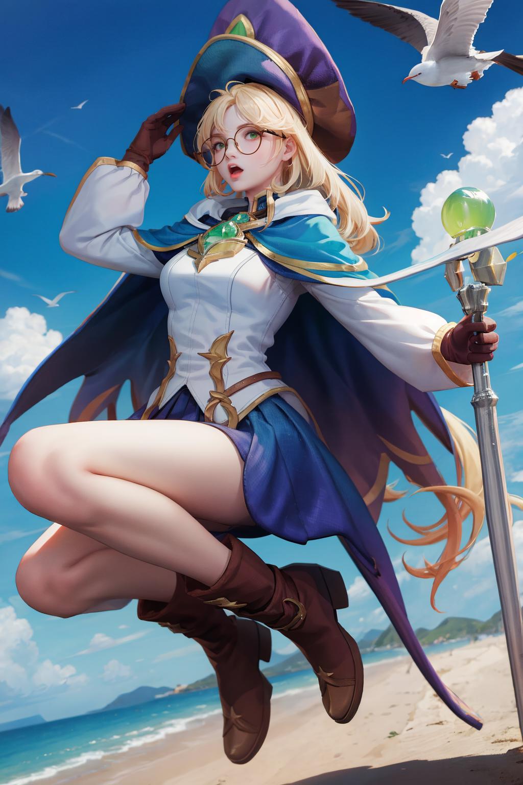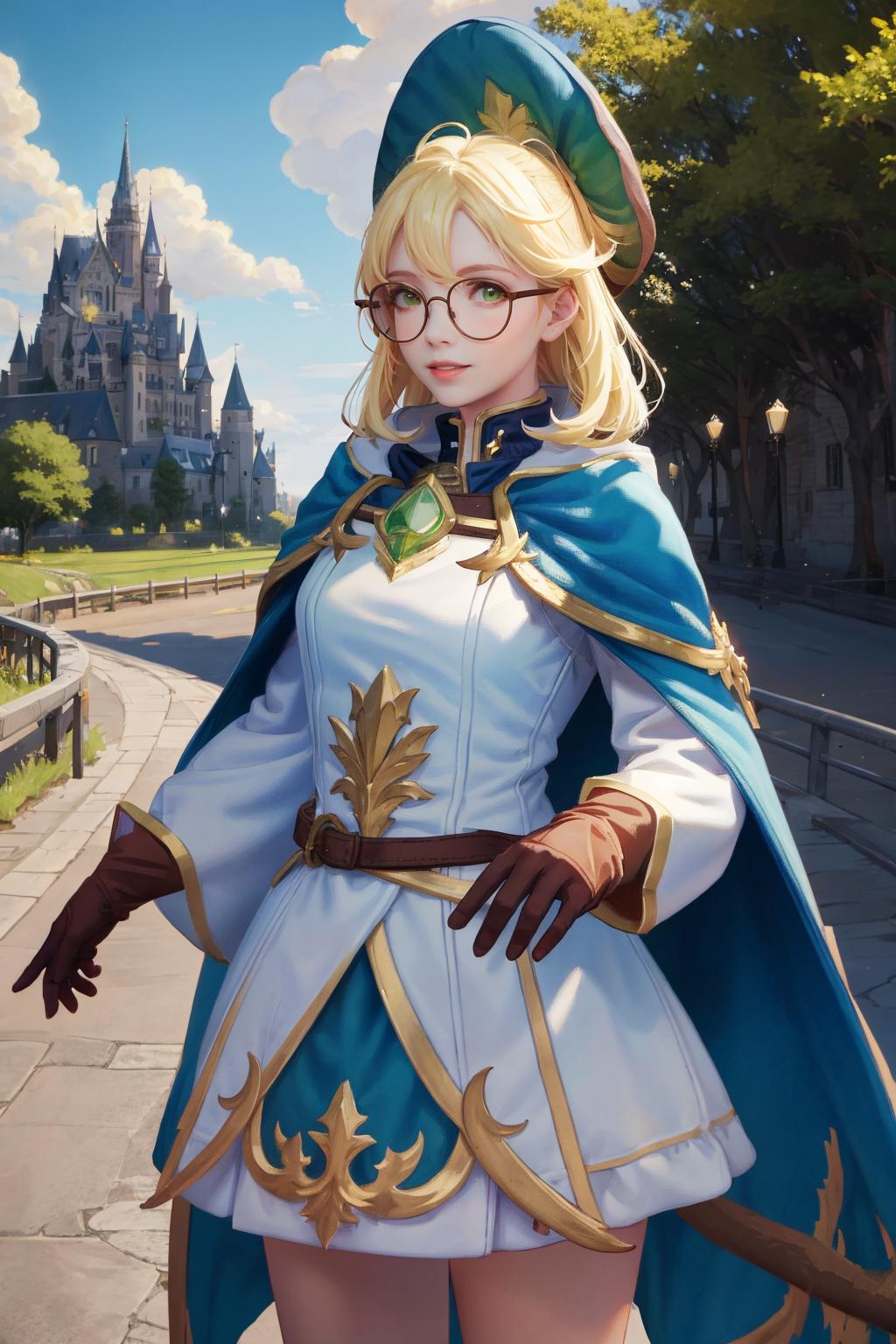 Prompt:,1girl, solo, bangs, long hair, yellow hair, parted lips, green eyes, gloves, cloak, glasses, (purple|yellow:0.5) hat, (gulls), sky, clouds, castles, trees, look at the viewer, smile, the village, the road, the light harmonize