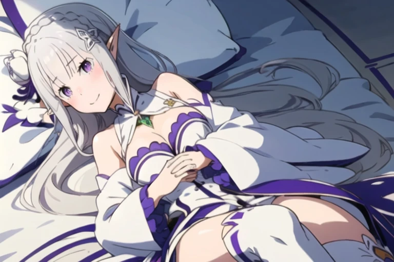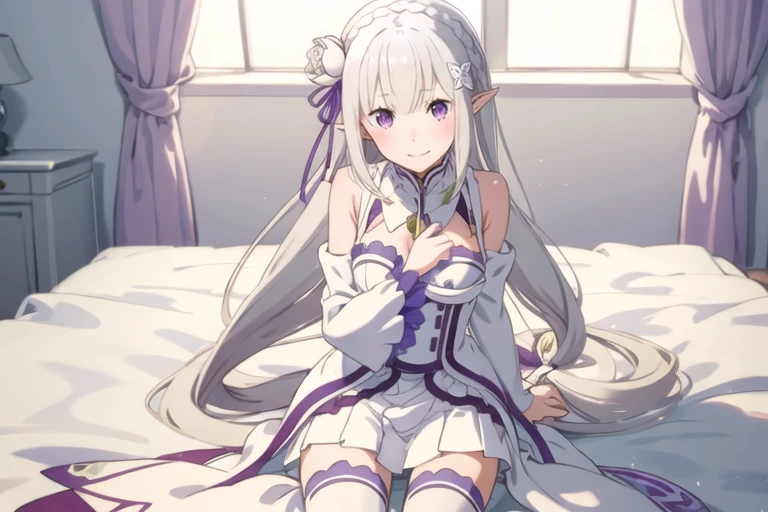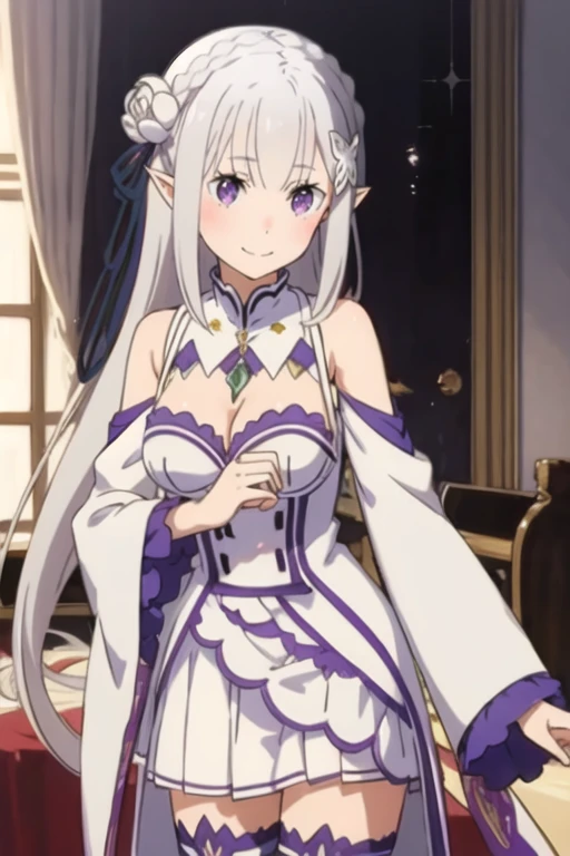 1girl,bangs,bare shoulders,blunt bangs,blush,braid,breasts,cleavage,closed mouth,emilia \(re:zero\), eyebrows visible through hair,flower,hair flower,hair ornament,hair ribbon,long hair,medium breasts,pointy ears,purple eyes,purple ribbon,ribbon,rose,silver hair,white flower,solo,shy,light_blush,breasts apart,smile,anime_style_blush,<lora:emiliabetav9:0.9>