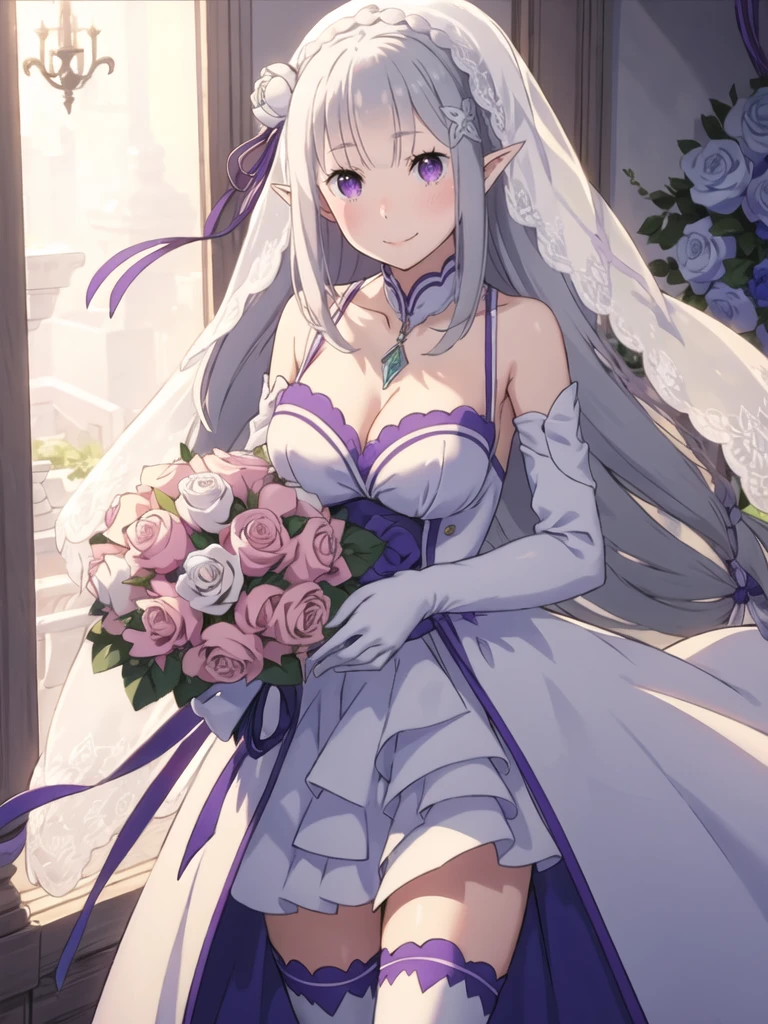 1girl,bangs,bare shoulders,blunt bangs,blush,braid,breasts,cleavage,closed mouth,emilia \(re:zero\),eyebrows visible through hair,flower,hair flower,hair ornament,hair ribbon,long hair,medium breasts,pointy ears,purple eyes,purple ribbon,ribbon,rose,silver hair,white flower,solo,shy,light_blush,breasts apart,smile,anime_style_blush,<lora:emiliabetav9:0.9>