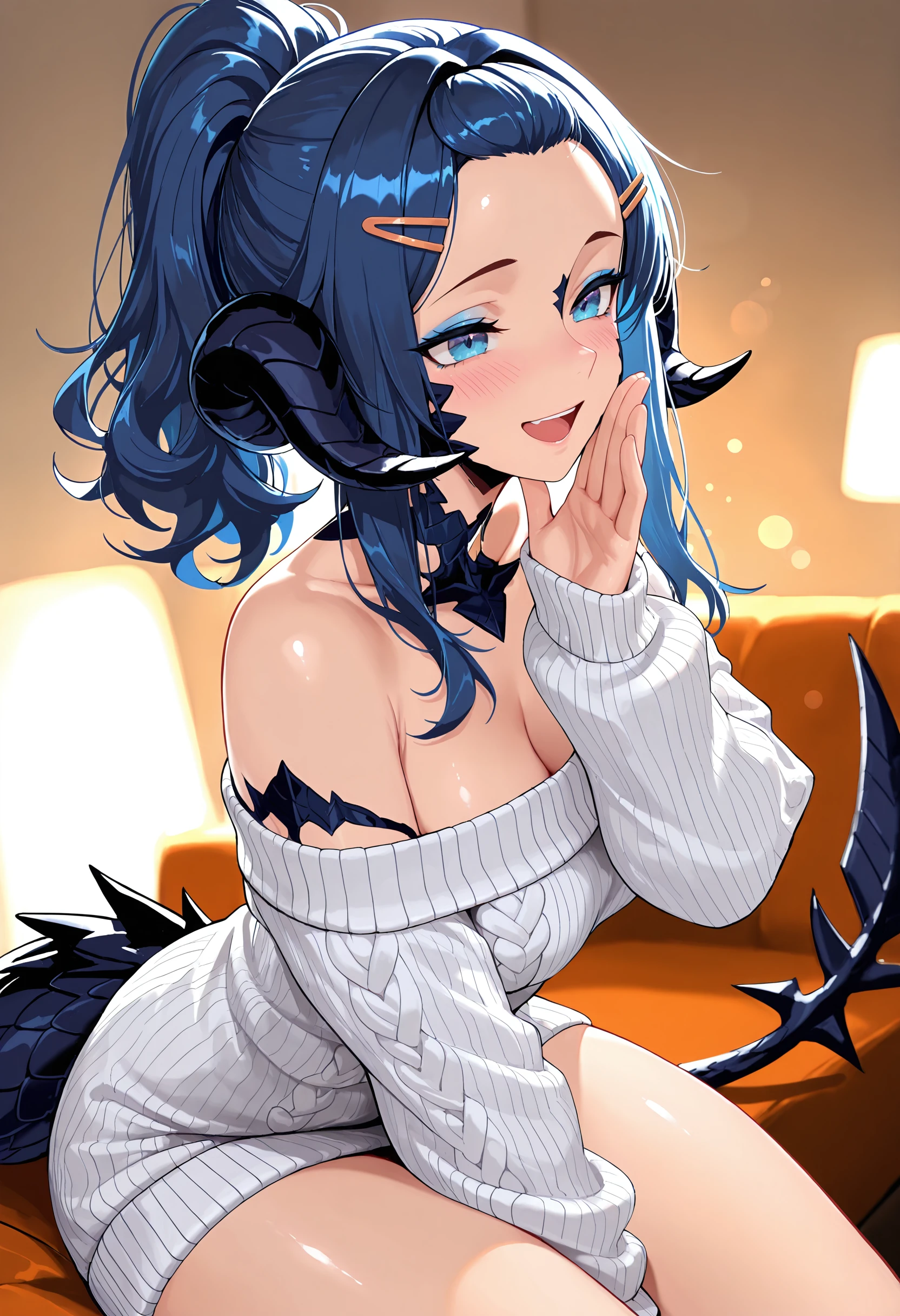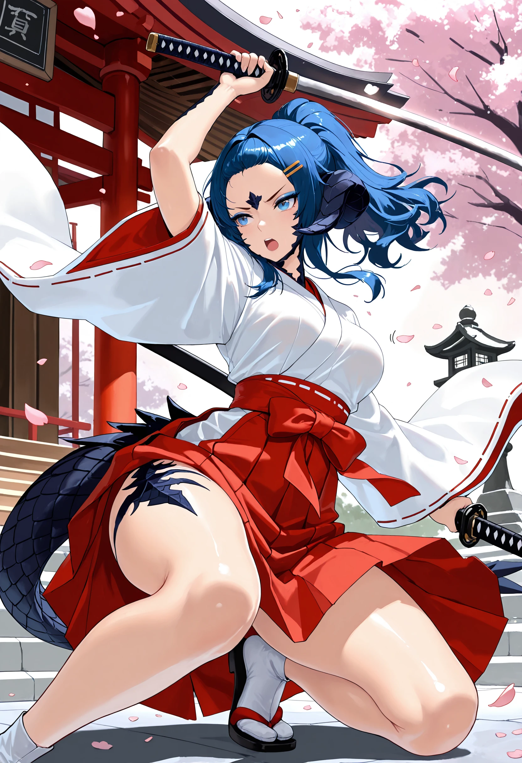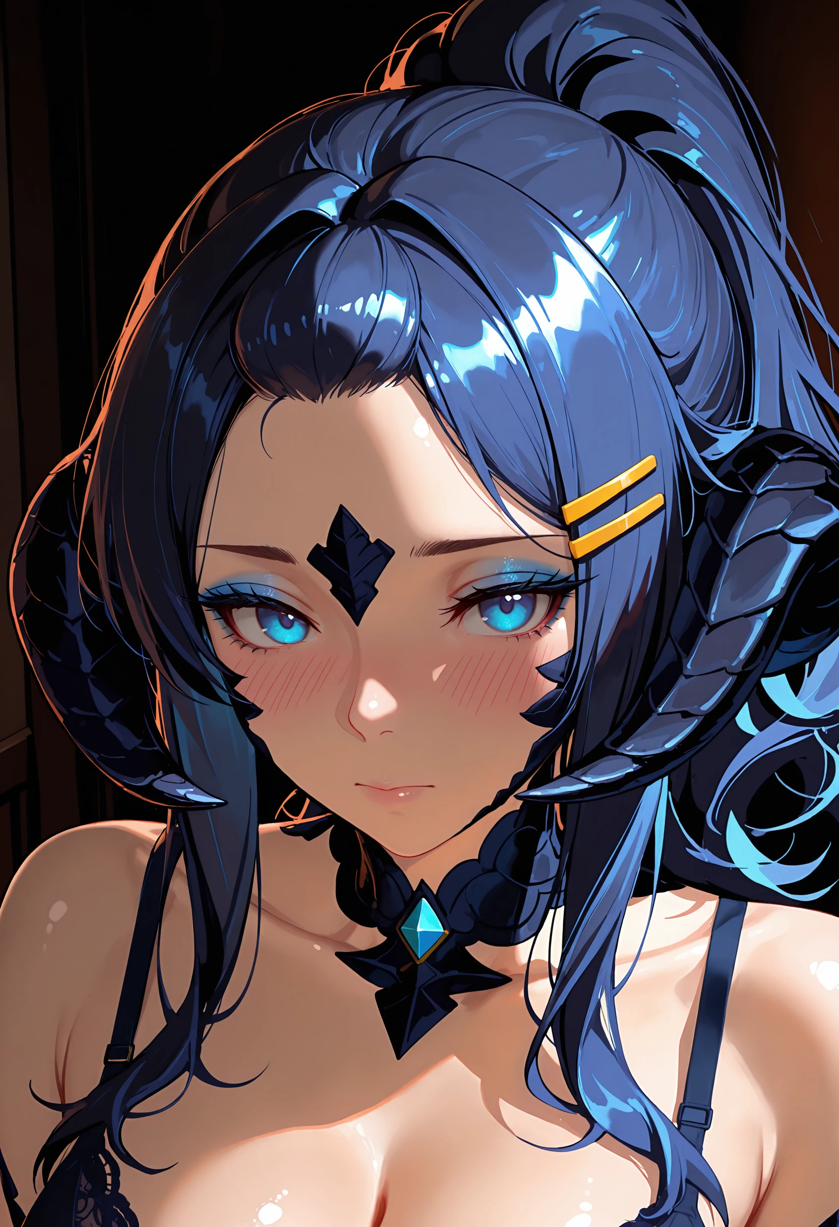 Aizhen is a Xaela Au Ra with sharp presence and disciplined beauty. Her darker scales contrast cleanly against her skin, and her horns frame her face in a way that plays up her naturally strong, angular features. Her eyes are focused and hard to read -- the kind of gaze that makes you unsure whether she's sizing you up or simply looking through you. Her body is athletic and well-conditioned, built for precision and control rather than softness, with defined lines and a grounded, balanced posture.