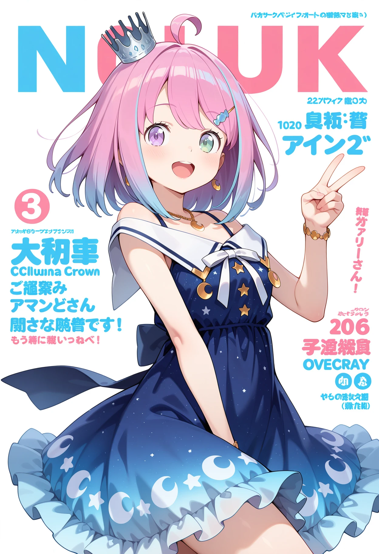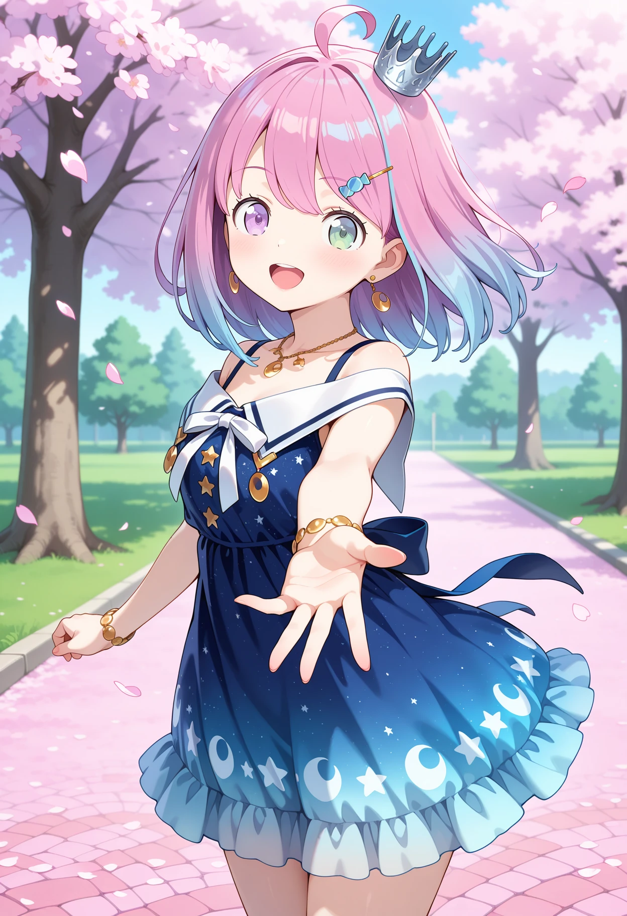 outfit3ccluna, medium hair, pink hair, gradient hair, ahoge, mini crown, silver crown, hair ornament, hairclip, earrings, heterochromia, necklace, white bowtie, off-shoulder dress, sailor dress, gradient dress, blue dress, sleeveless, bracelet