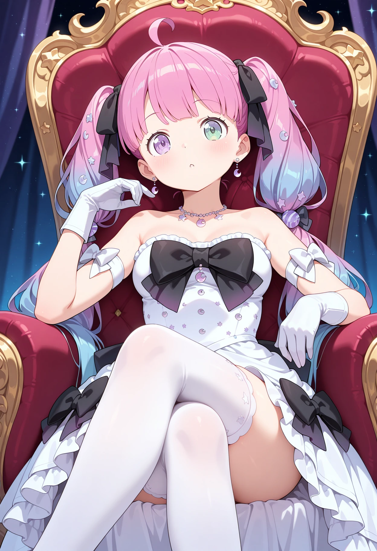 outfit4ddluna, long hair, pink hair, gradient hair, twintails, hair ribbon, ahoge, hair ornament, earrings, heterochromia, necklace, strapless, black bow, white dress, arm strap, white gloves, white thighhighs