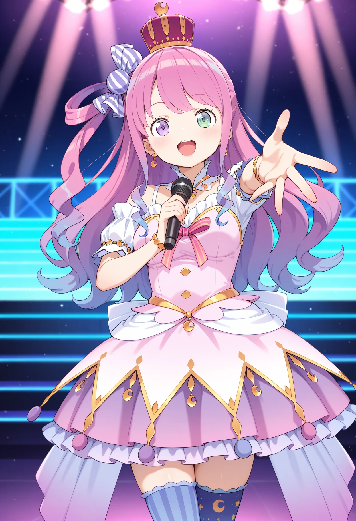 outfit1aaluna, long hair, pink hair, gradient hair, single hair ring, one side up, mini crown, hair ornament, earrings, heterochromia, pink bow, pink dress, detached collar, short sleeves, bracelet, mismatched legwear, blue thighhighs