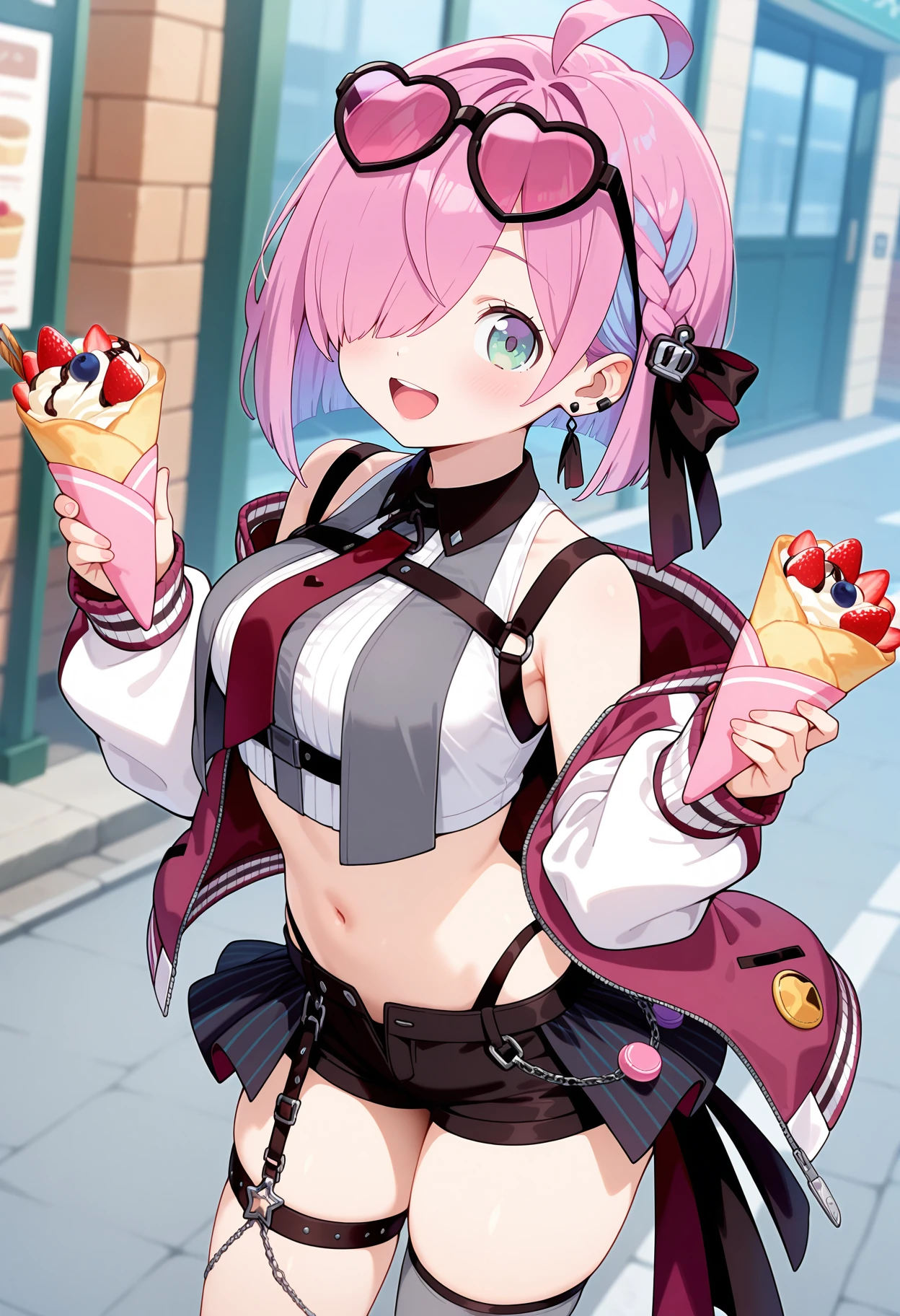 outfit5-1eeluna, short hair, pink hair, multicolored hair, braid, ahoge, hair ribbon, hair ornament, eyewear on head, hair over one eye, one eye covered, earrings, red necktie, crop top, white shirt, sleeveless, off shoulder, letterman jacket, long sleeves, overskirt, black shorts, single garter strap, single thighhigh, grey thighhighs