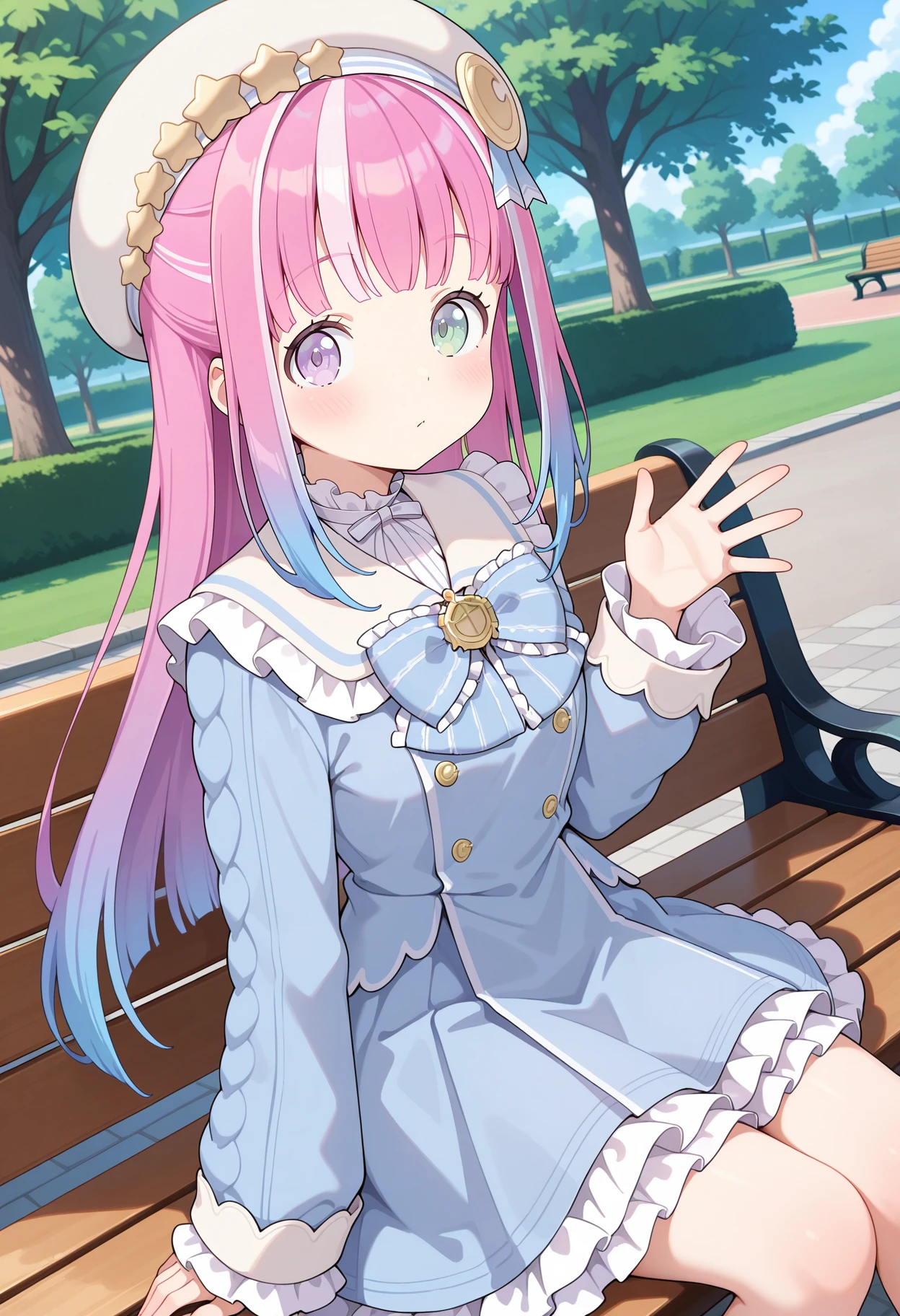 outfit6ffluna, long hair, pink hair, gradient hair, streaked hair, beret, white headwear, heterochromia, blue bowtie, frilled dress, light blue dress, long sleeves