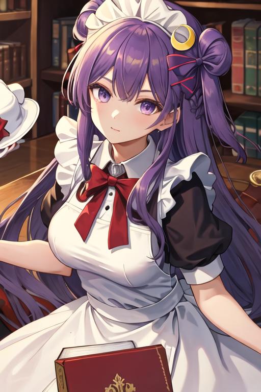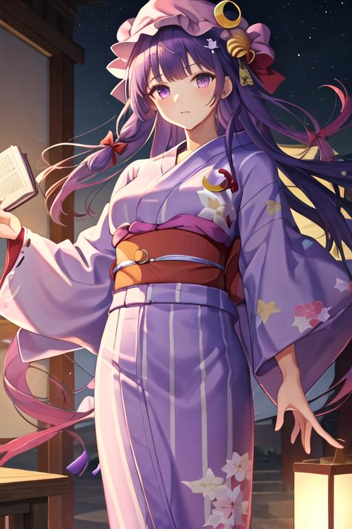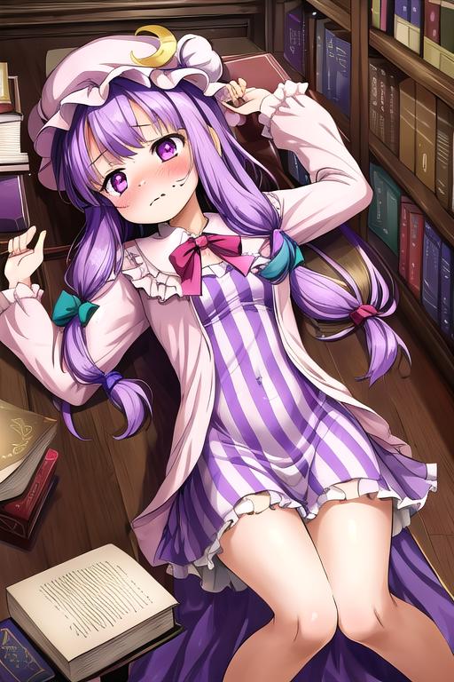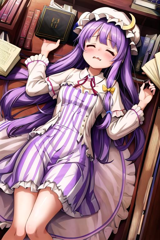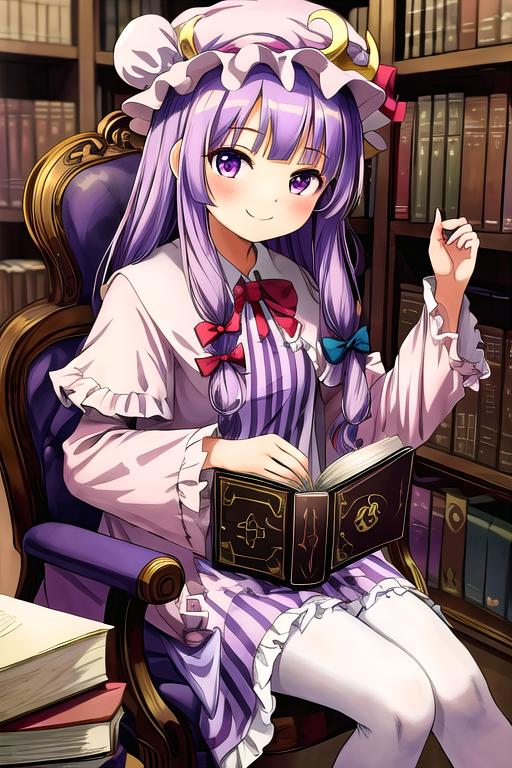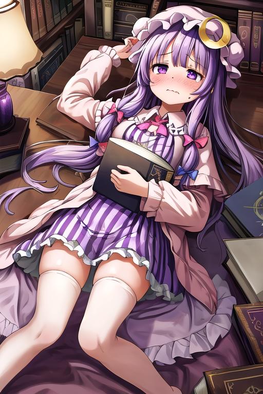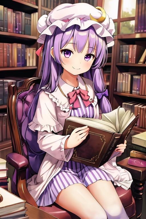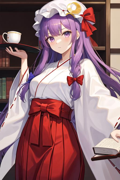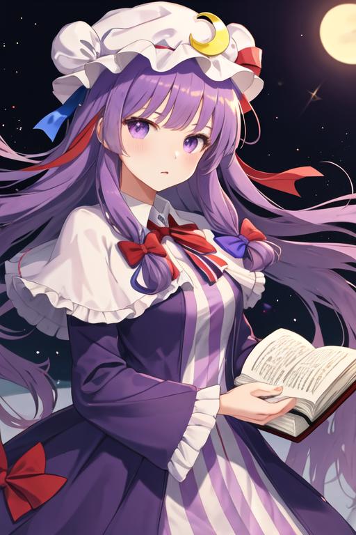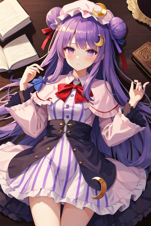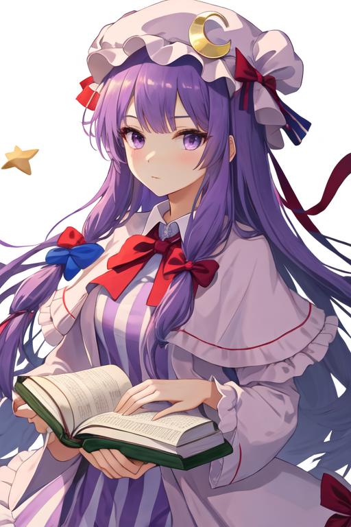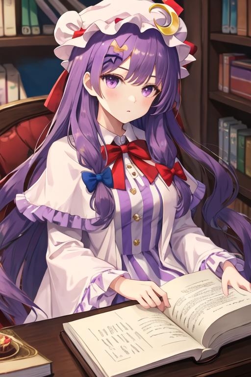 The trigger word is patchouli_knowledge_touhou, and the recommended tags are best quality, masterpiece, highres, solo, {patchouli_knowledge_touhou:1.15}, long_hair, purple_hair, crescent, purple_eyes, ribbon, hat, bow, bangs, mob_cap, hat_ornament, crescent_hat_ornament, hair_bow, red_bow, blue_bow, upper_body, book, red_ribbon, capelet, hat_ribbon, striped, very_long_hair.