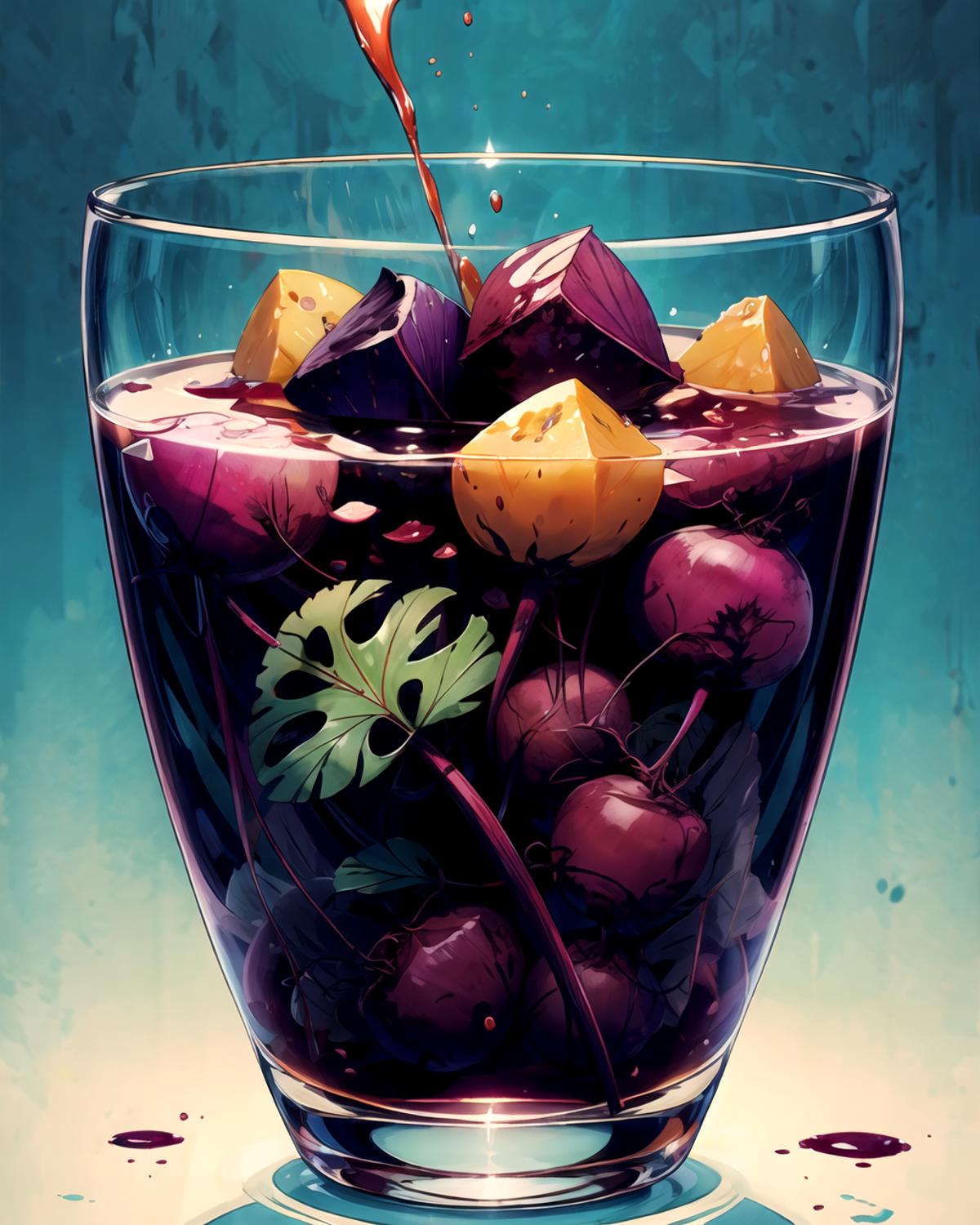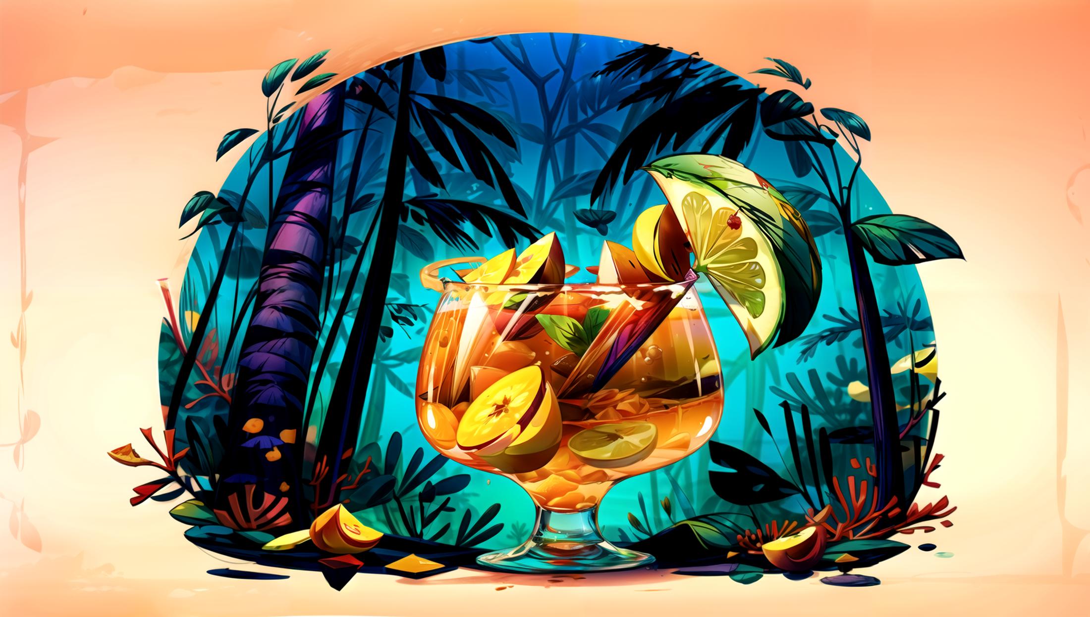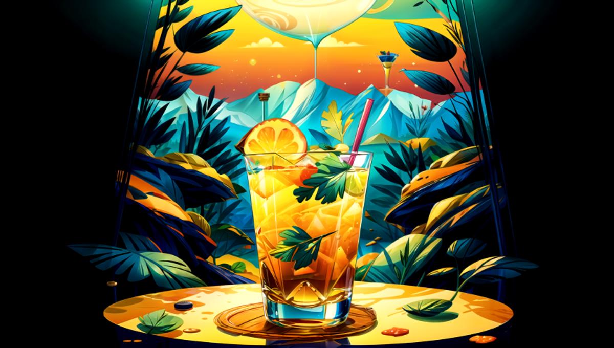 A refreshing beverage made from __bank/fruits__ and __bank/cold_drinks__, garnished with __bank/herbs_spices__, served in a __bank/locations__ with __bank/liquid_colors__ accentOutput prompt: