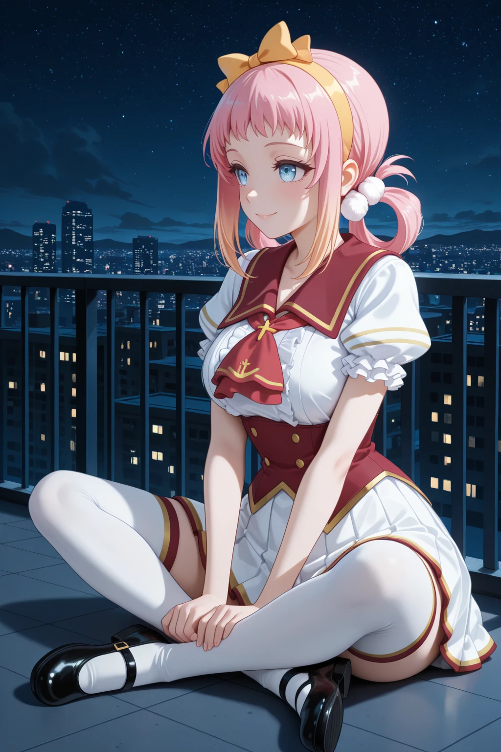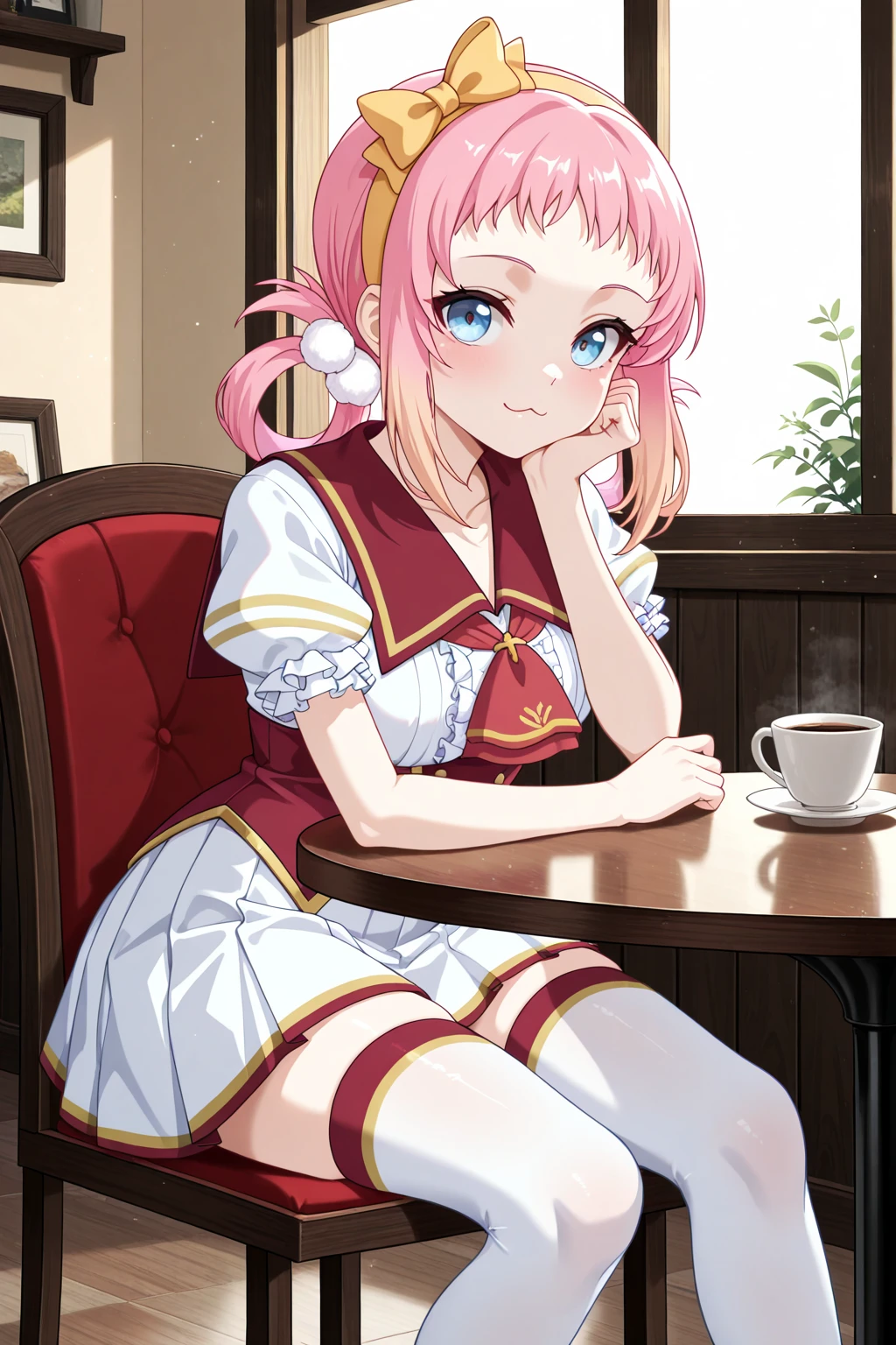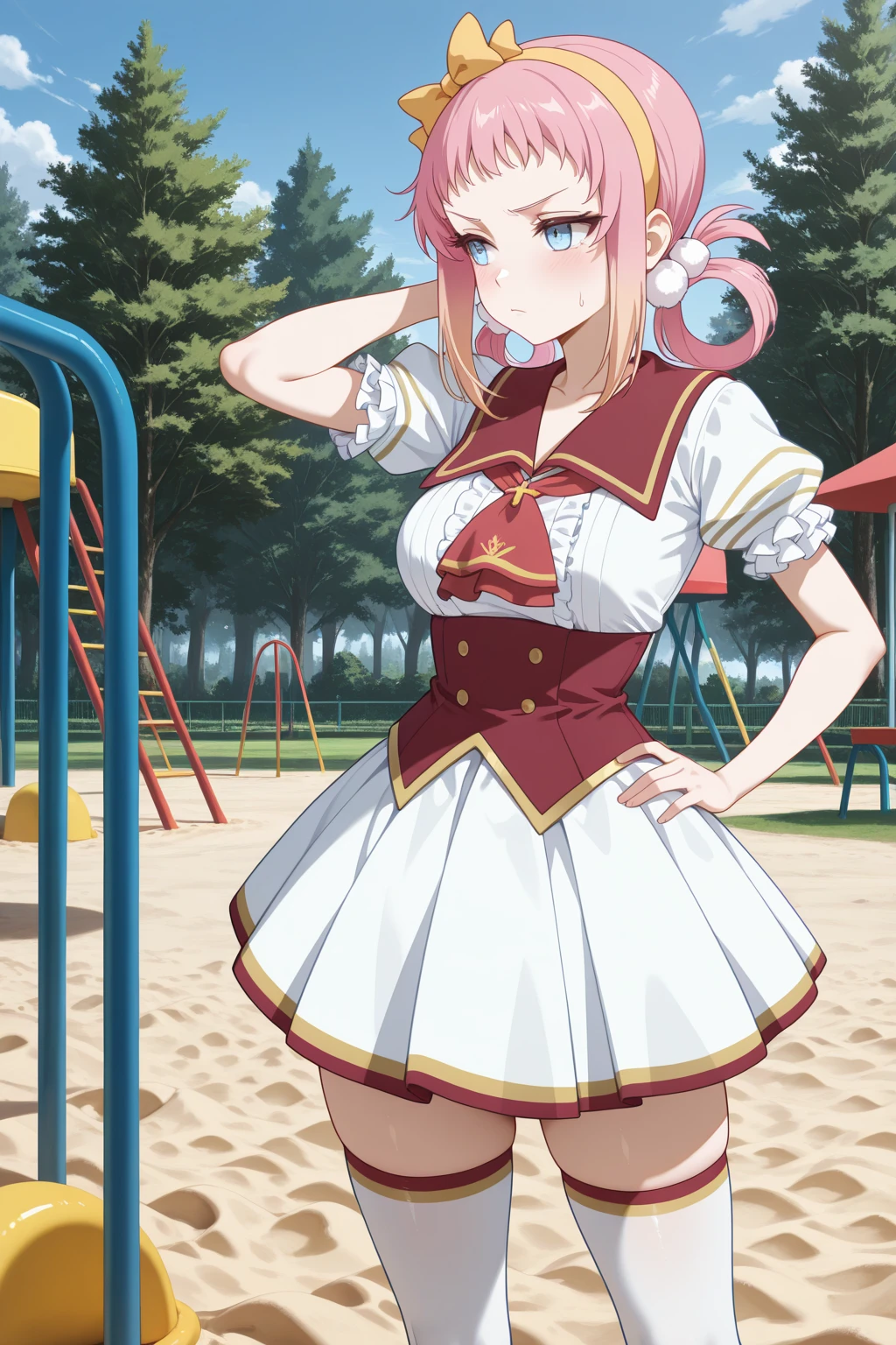Trigger word: LRL_Angelica, pink hair, yellow hairband, yellow bow decorated hairband, hair rings, white pom pom hair ornament, gradient sidelocks, blonde sidelocks, short bangs, blue eyes, school uniform, white shirt, red sailor collar, red ascot, red corset, puffy short sleeves, frilled sleeves, white skirt, gold trim skirt, red trim skirt, pleated skirt, zettai ryouiki, white thighhighs, red trim thighhighs, gold trim thighhighs