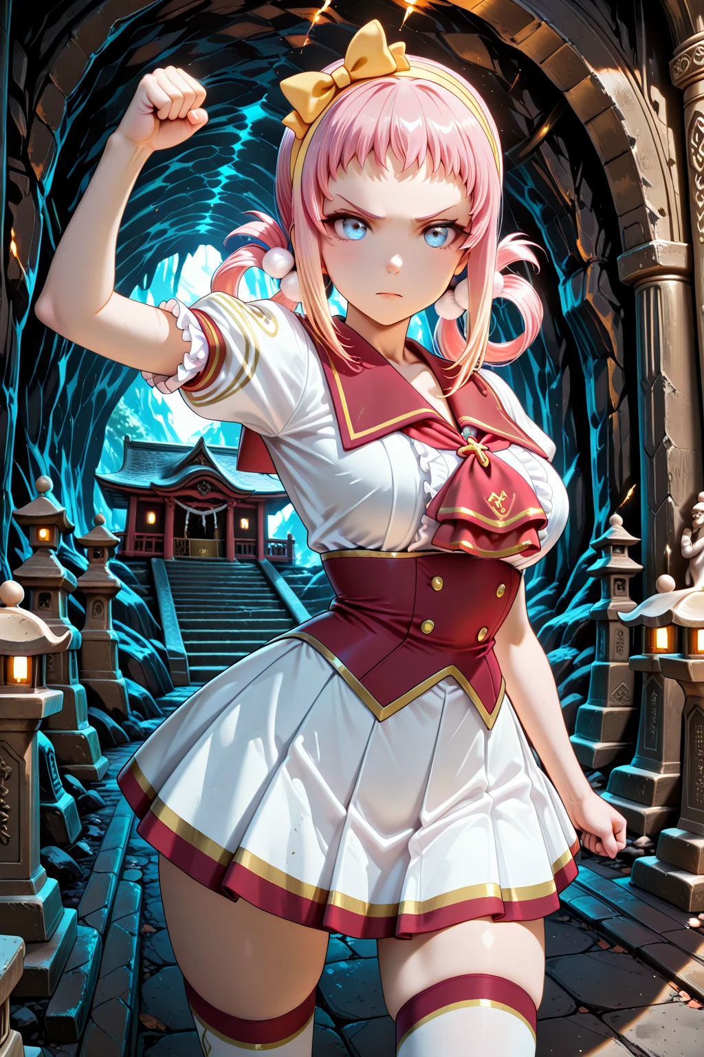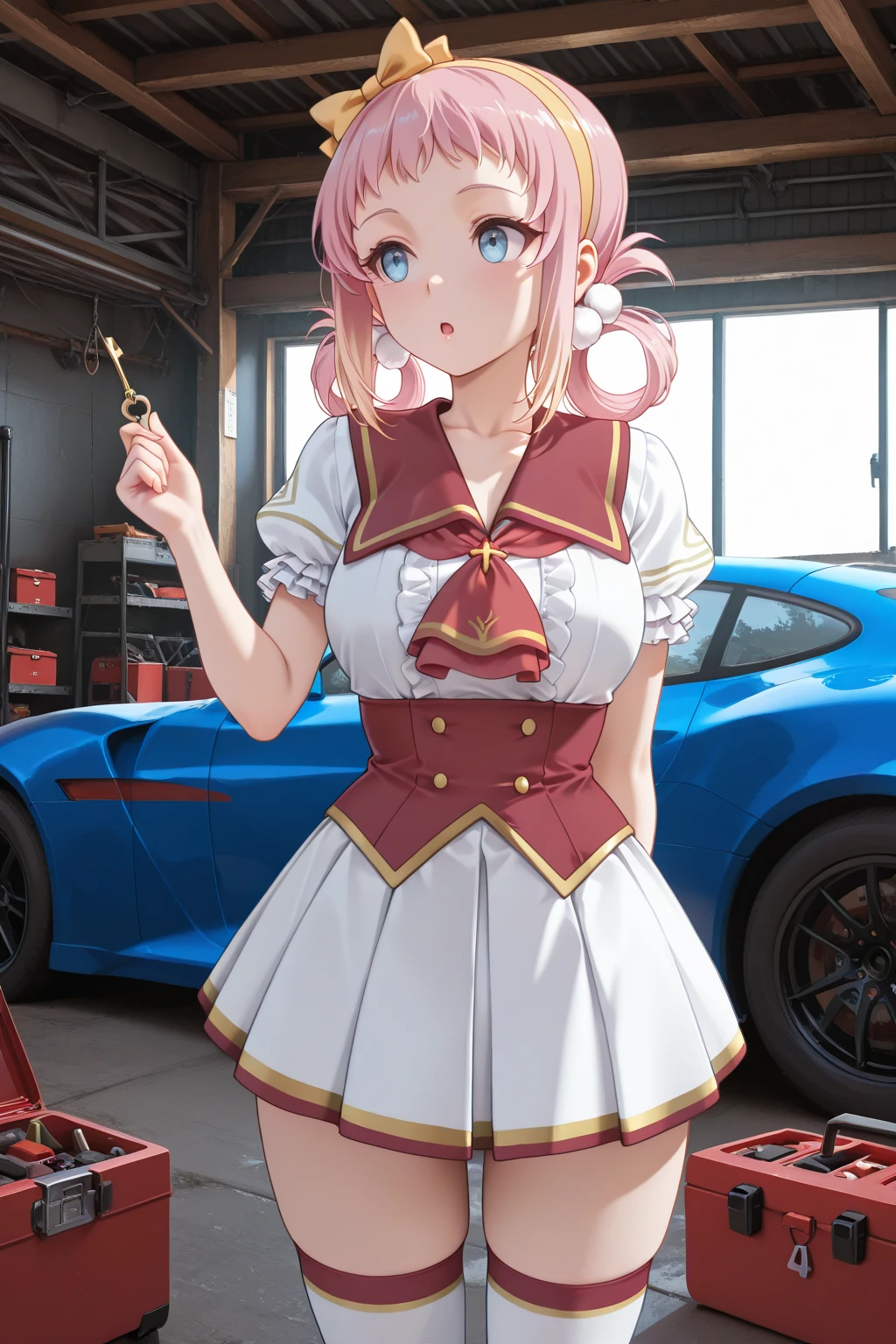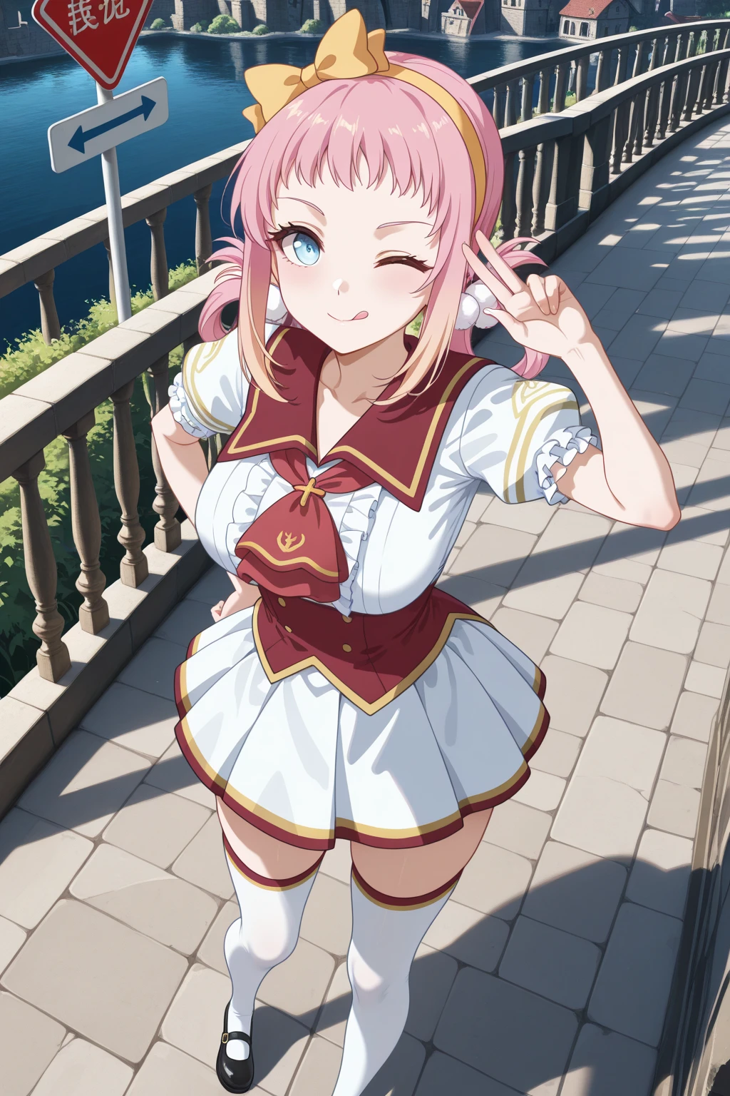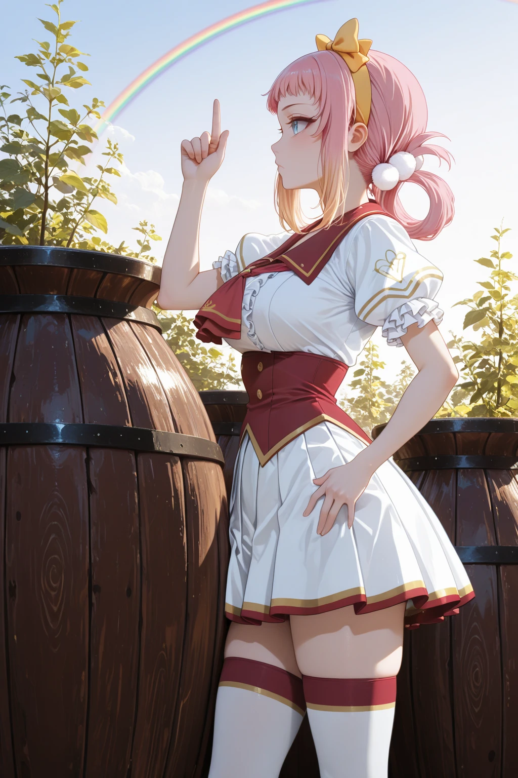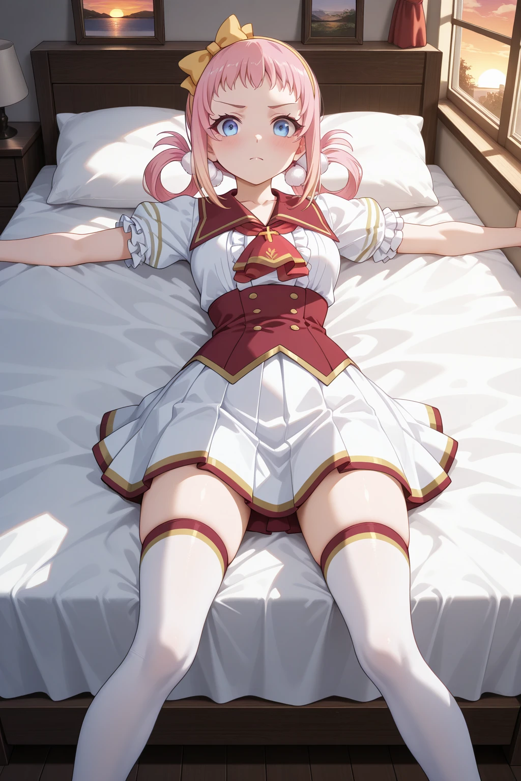 トリガーワード:LRL_Angelica, pink hair, yellow hairband, yellow bow decorated hairband, hair rings, white pom pom hair ornament, gradient sidelocks, blonde sidelocks, short bangs, blue eyes, school uniform, white shirt, red sailor collar, red ascot, red corset, puffy short sleeves, frilled sleeves, white skirt, gold trim skirt, red trim skirt, pleated skirt, zettai ryouiki, white thighhighs, red trim thighhighs, gold trim thighhighs