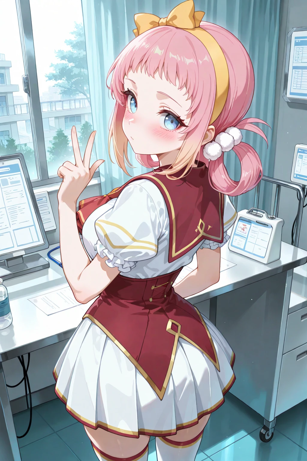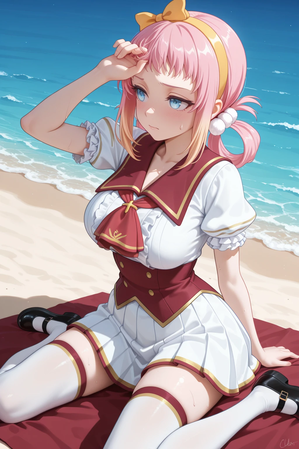 LRL_Angelica, pink hair, yellow hairband, yellow bow decorated hairband, hair rings, white pom pom hair ornament, gradient sidelocks, blonde sidelocks, short bangs, blue eyes, school uniform, white shirt, red sailor collar, red ascot, red corset, puffy short sleeves, frilled sleeves, white skirt, gold trim skirt, red trim skirt, pleated skirt, zettai ryouiki, white thighhighs, red trim thighhighs, gold trim thighhighs
