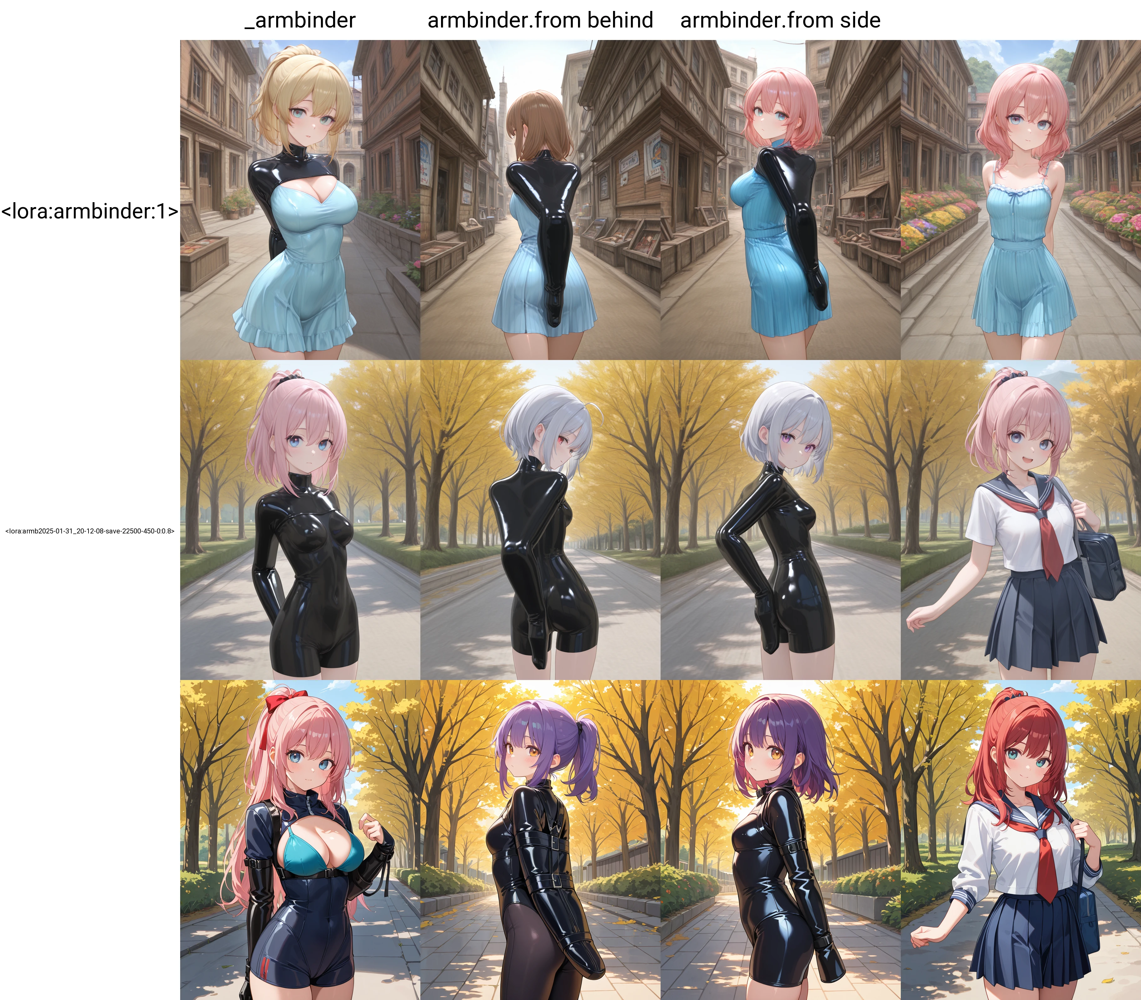 For checkpoints that already have concept of armbinder trained, it's really hard to remove the "strap" or boundary in the upper arm where usual elbow gloves would end.