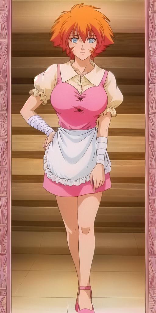Pink_waitress_dress_puffy_short_sleeves_White_apron_Bandaged_arm: waitress outfit of a mostly filler episode.