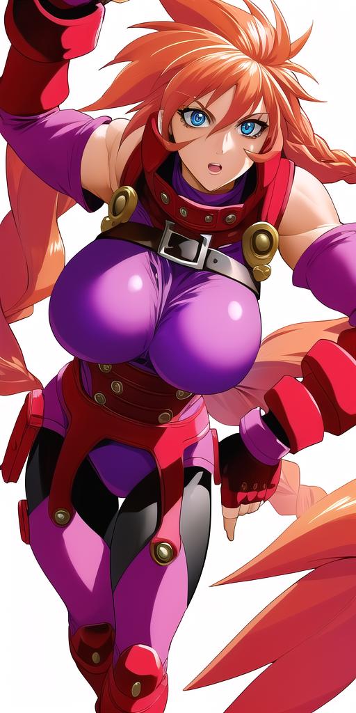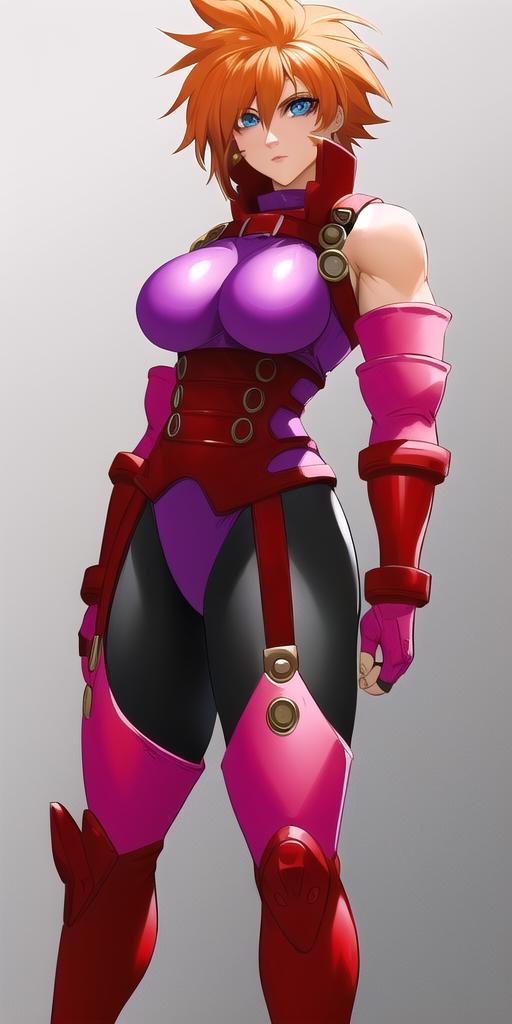 purple_leotard_black_pantyhose_red_gloves_garter_belt_red_boots_leather_gorget: her normal outfit.