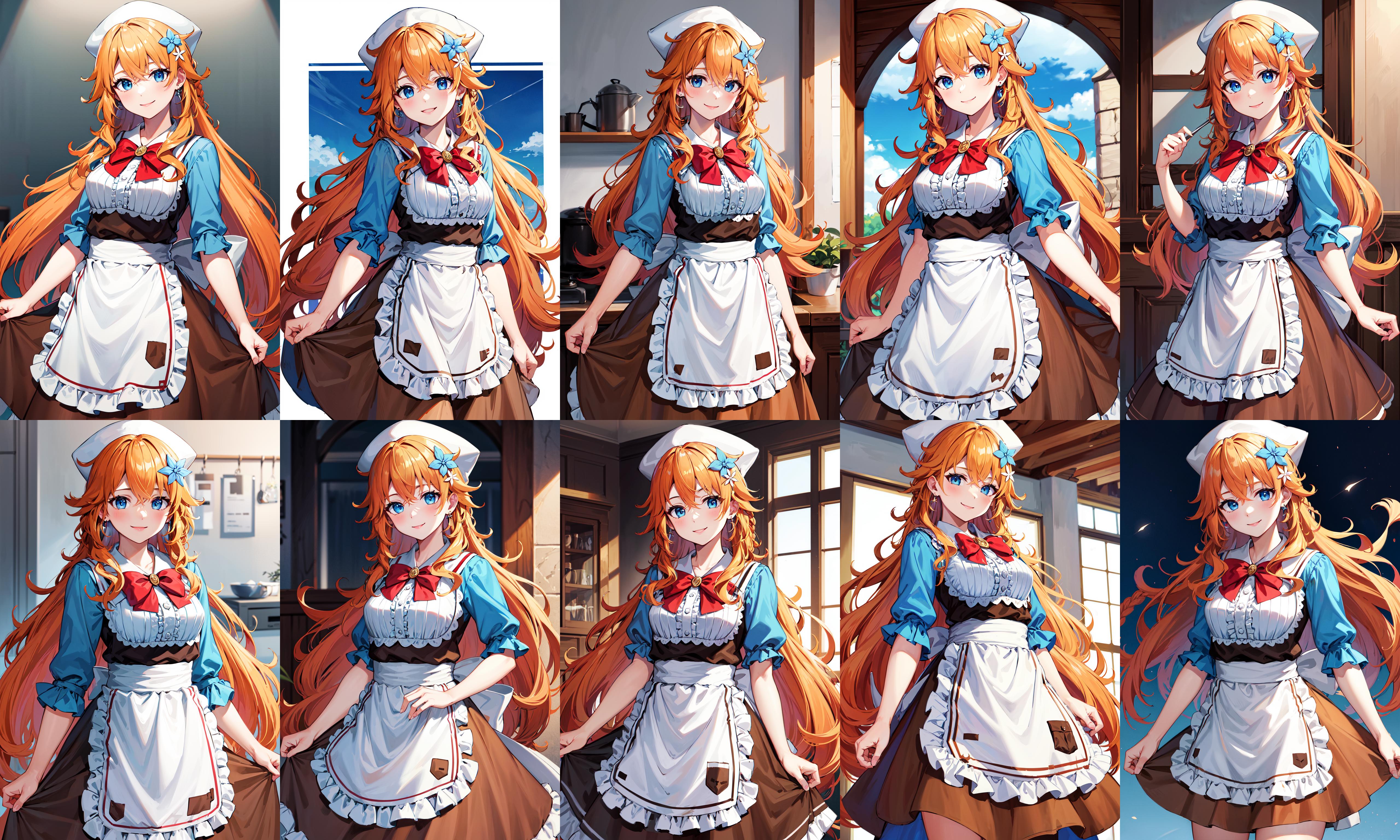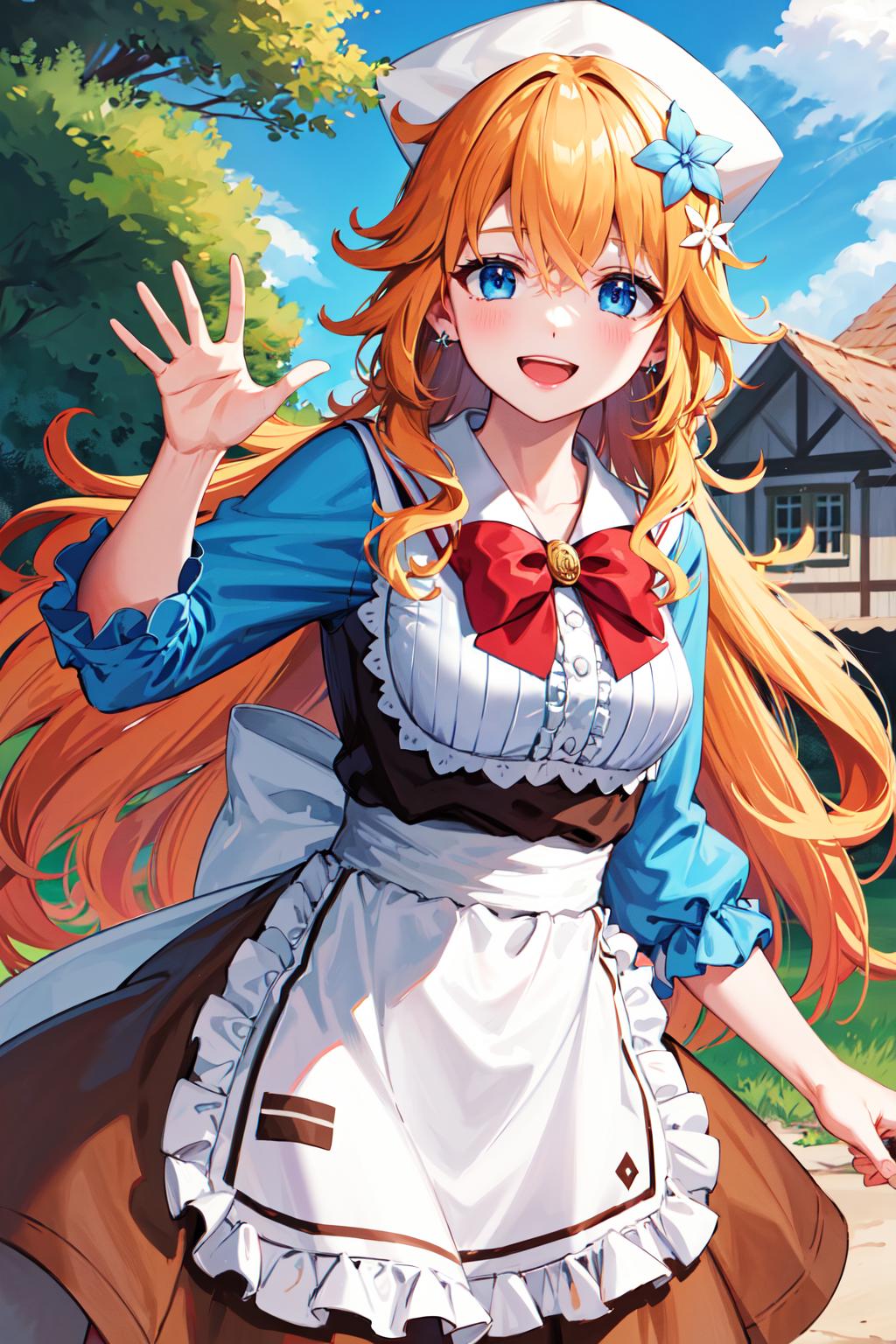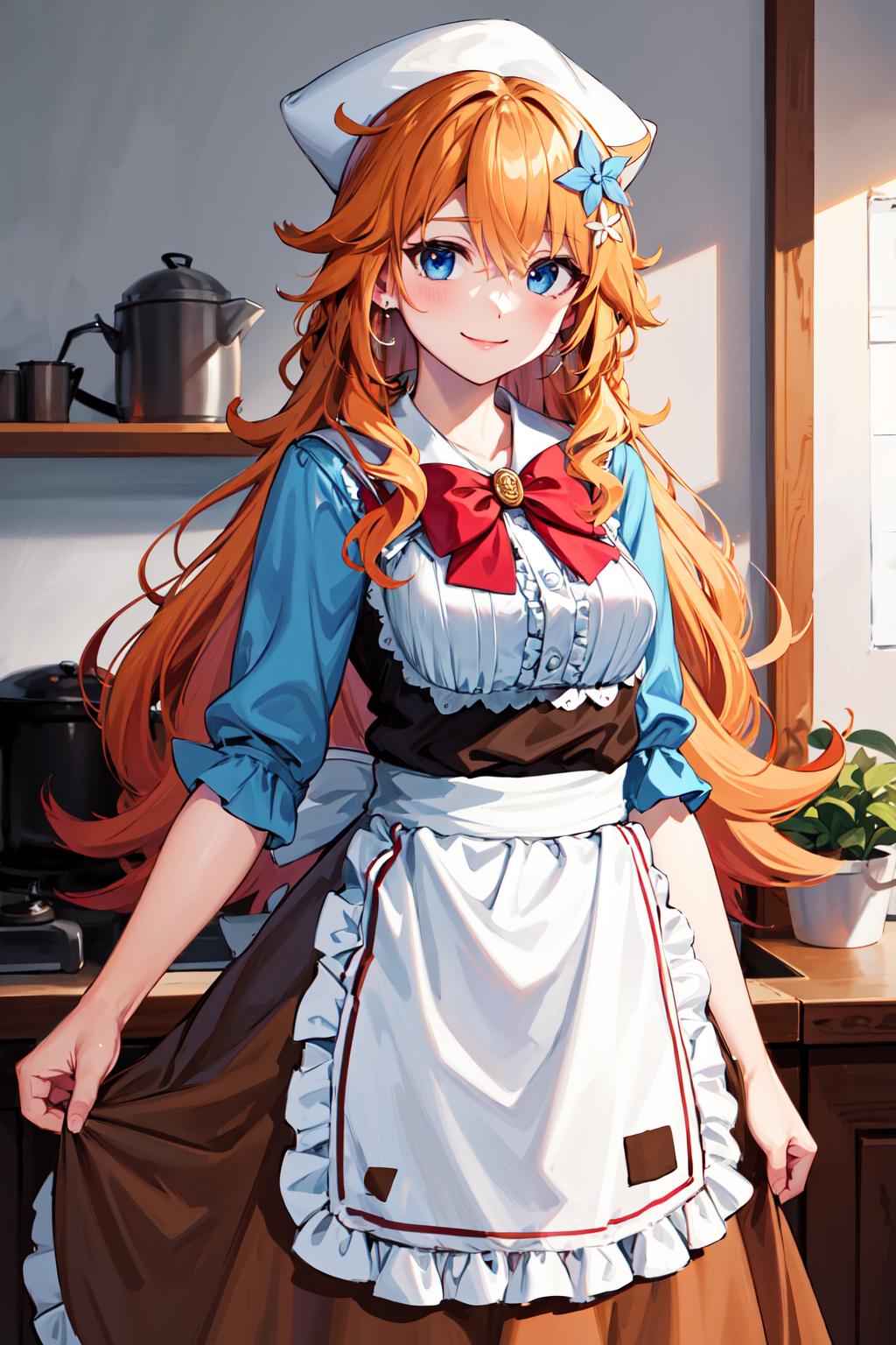oe1, hair flower, earrings, waist apron, red bow, brown skirt, frills, white head scarf, white apron, shirt
