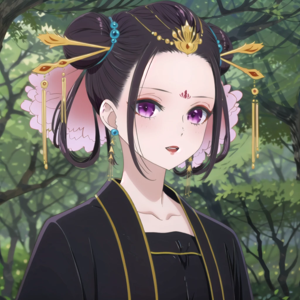 black hair,hair ornament,makeup,facial mark,chinese clothes,forehead mark,hair bun,jewelry,earrings,collarbone,purple eyes,hair stick,red lips,lipstick,hair rings,eyeshadow,black hanfu,double bun,parted lips,long sleeves,wide sleeves,pale skin