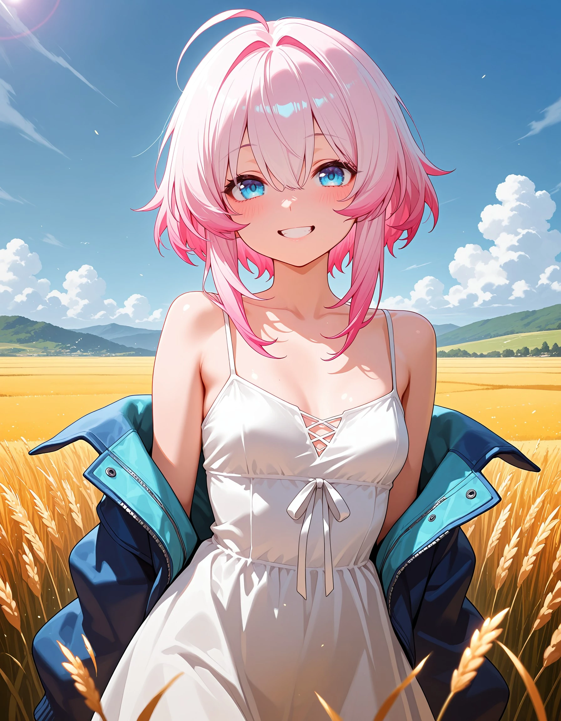 small breasts, blue eyes, ((pink hair)), side locks, white hair, hair between eyes, bangs, short hair, hsr_cyrene, diamond-shaped pupils, blue eyes