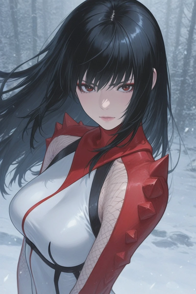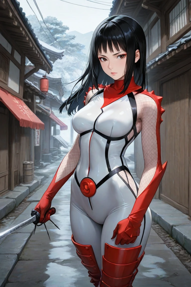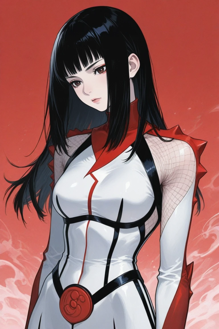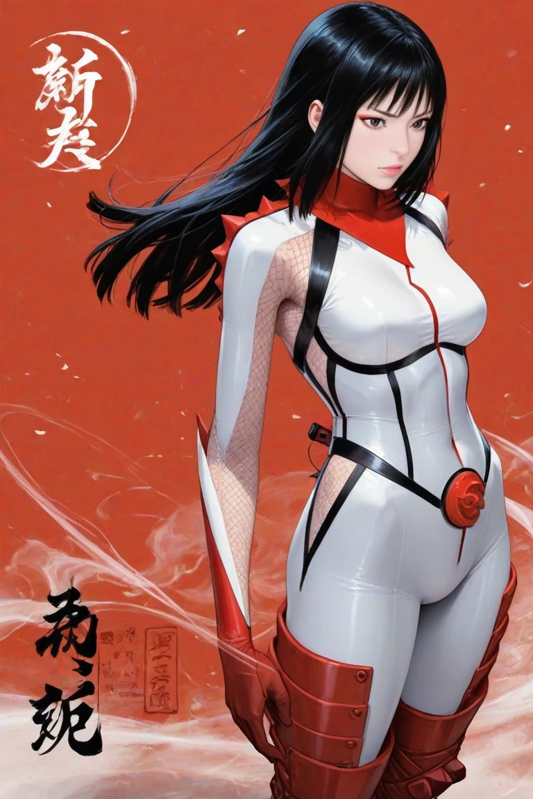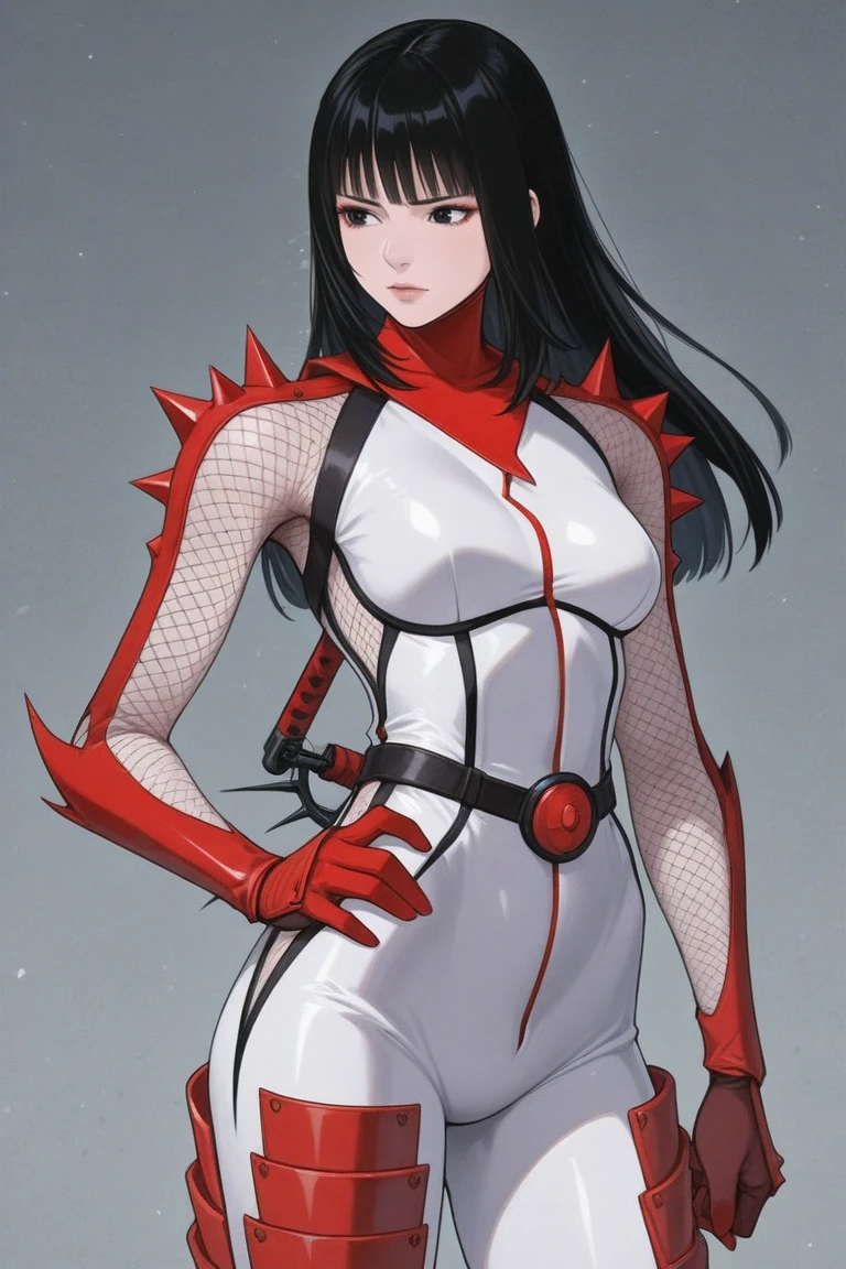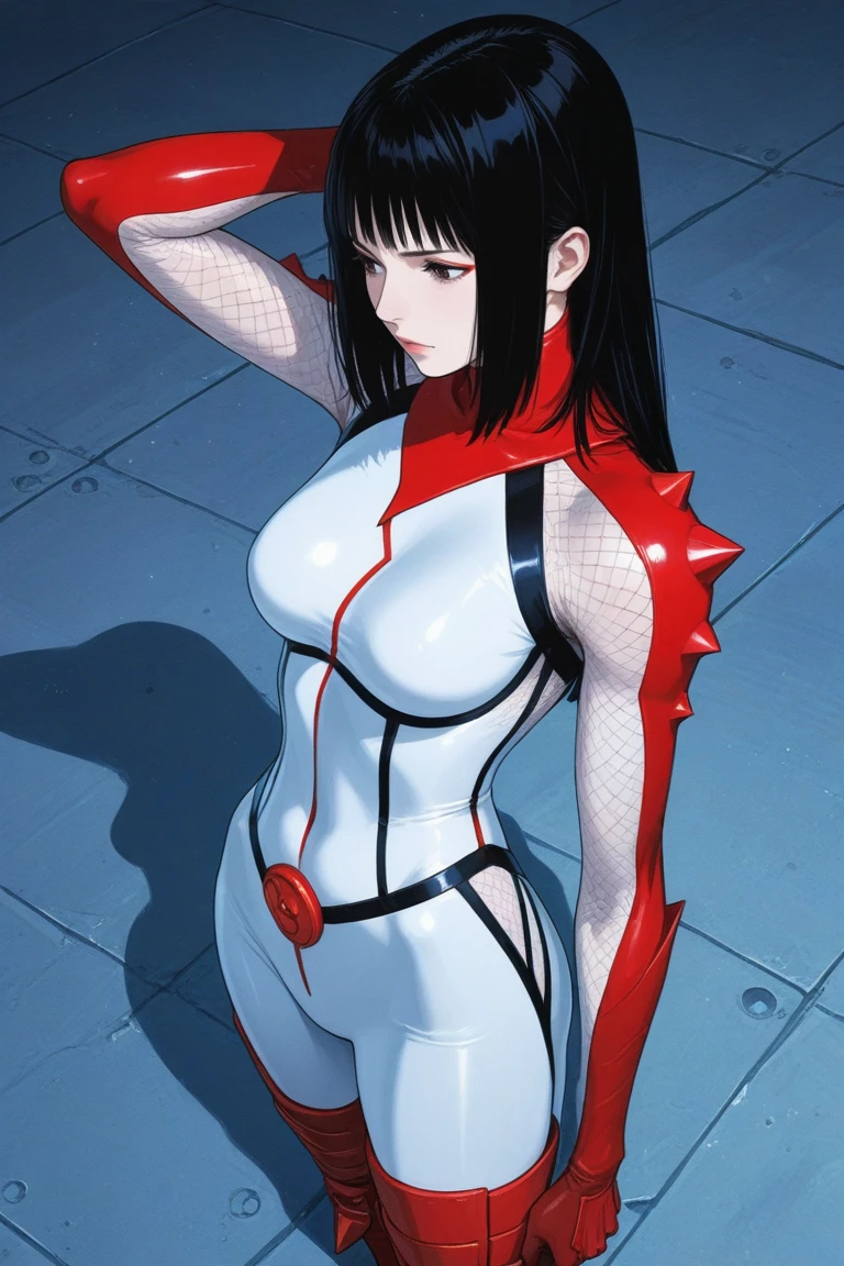 hibana,black hair,himecut,brown eyes,lips,bodysuits,boots