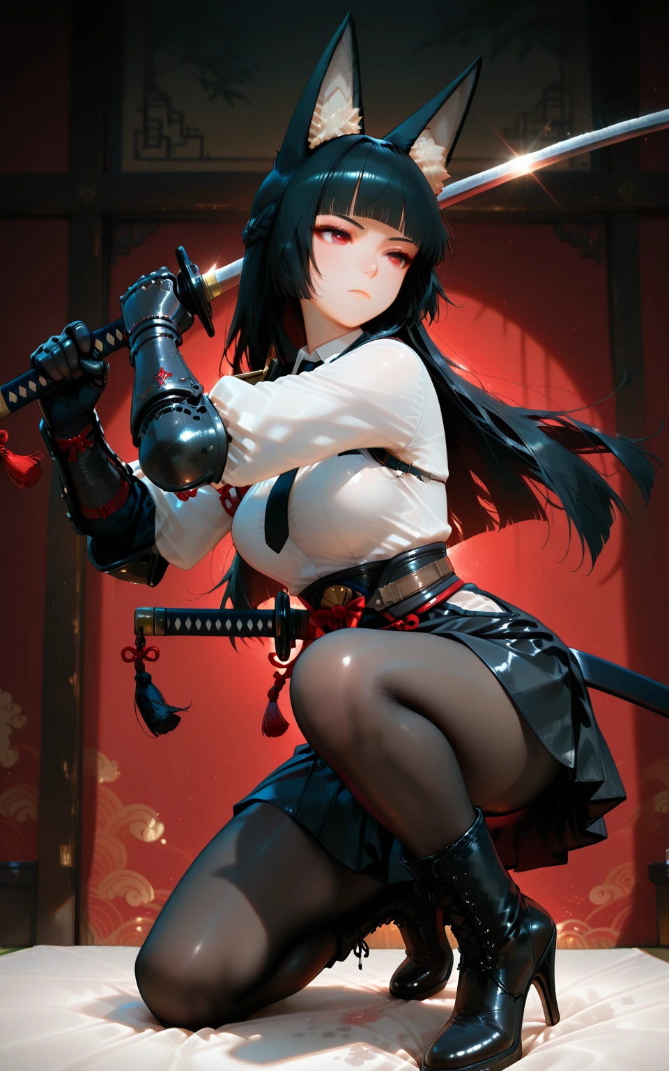 ilmiyabihoshimi, 1girl, breasts, ???????, 1boy, pantyhose, ???, hetero, ?????, vaginal, tongue, long hair, torn clothes, torn pantyhose, black hair, animal ears, tongue out, ahegao, large breasts, ?????, open mouth, uncensored, spread legs, on back, high heels, animal ear fluff, lying, blush, boots, arms behind head<lora:illustrious- Miyabi Hoshimi -1024x1600:1>