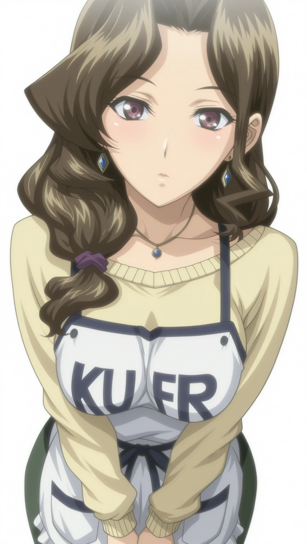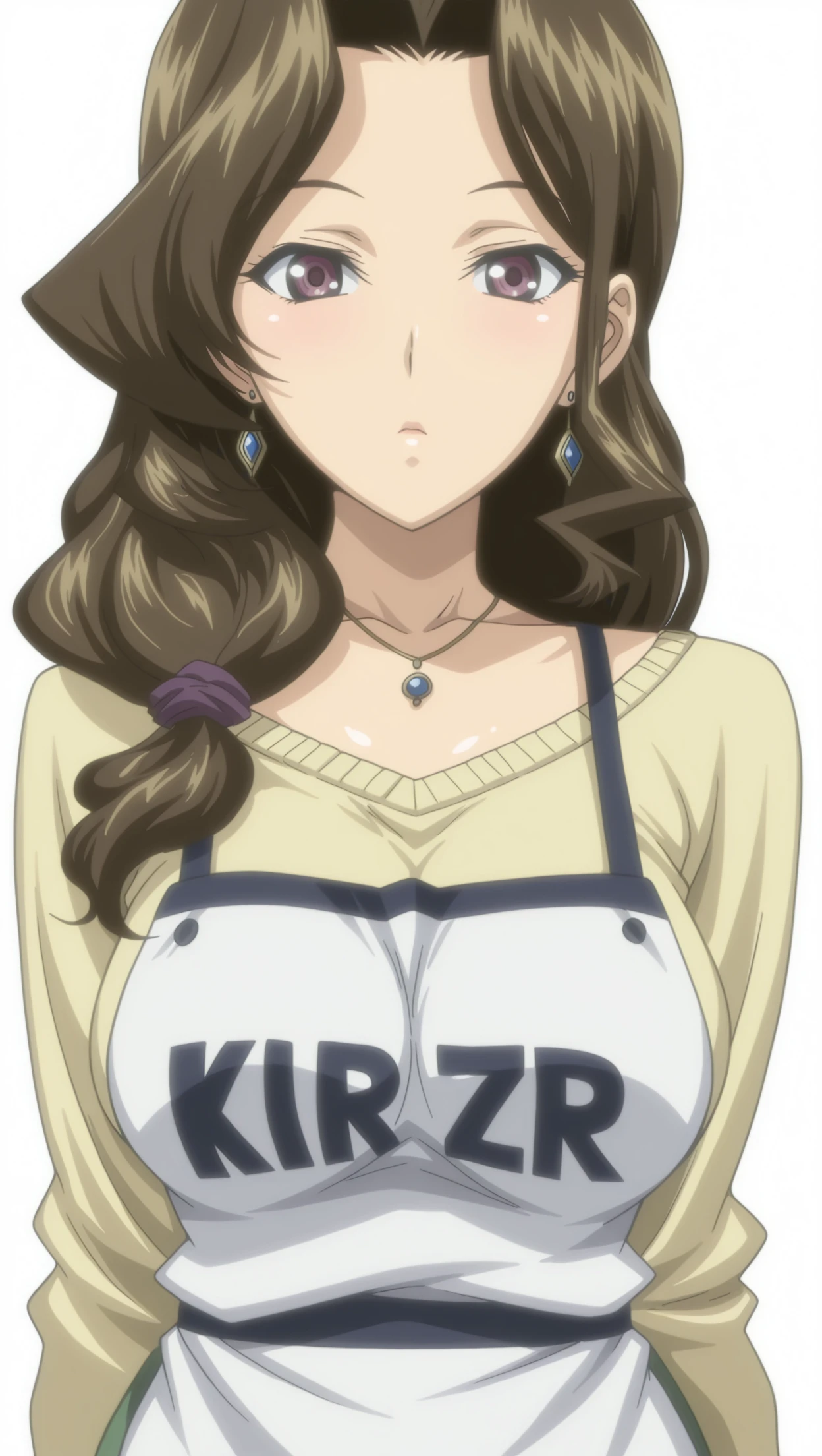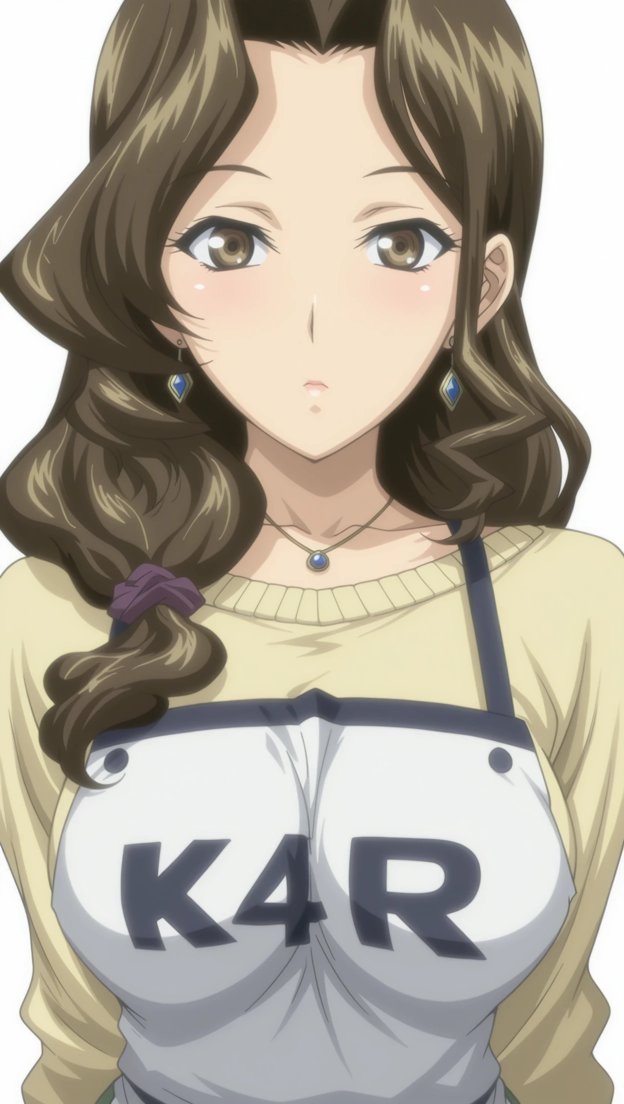 k40r1, 1girl, low-tied long hair, brown hair, large breasts, sweater, apron, skirt, green skirt, earrings, pendant, necklace