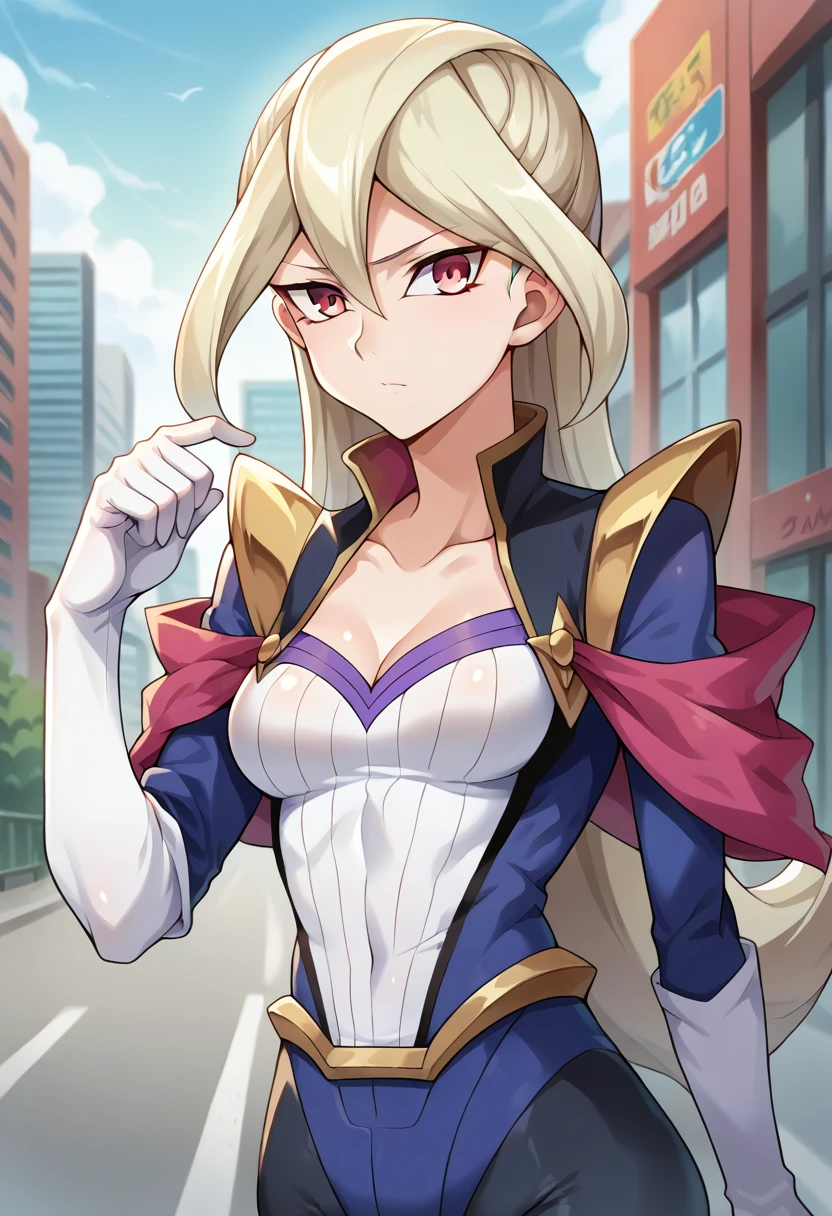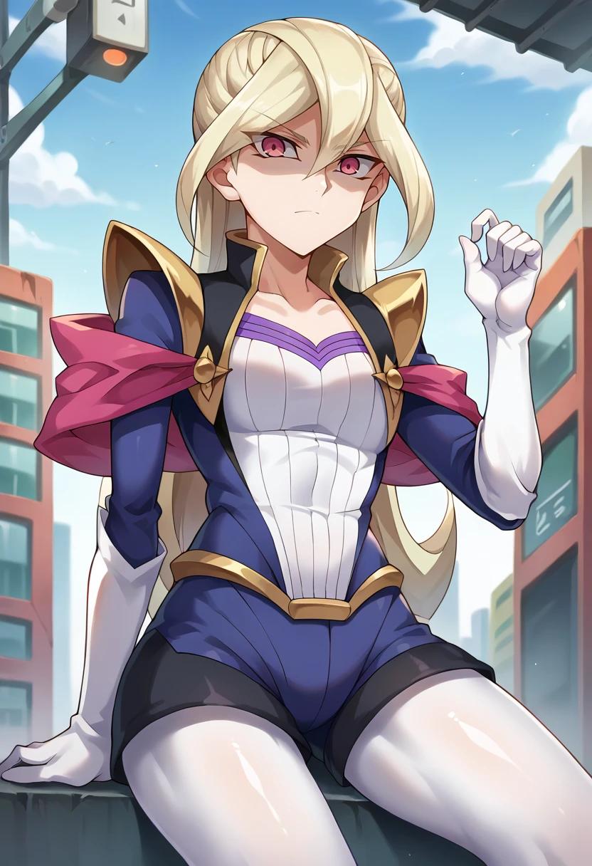score_9, score_8_up, score_7_up, source_anime, masterpiece, 1girl, ct_gl0ria, pink eyes, blue coat, white shirt, popped collar, shorts, shoulder pads, elbow gloves, white legwear, outdoors, city, depth of field, looking at viewer, collarbone, shiny skin, from below, shaded face, hands on on hips,Negative prompt ❌: